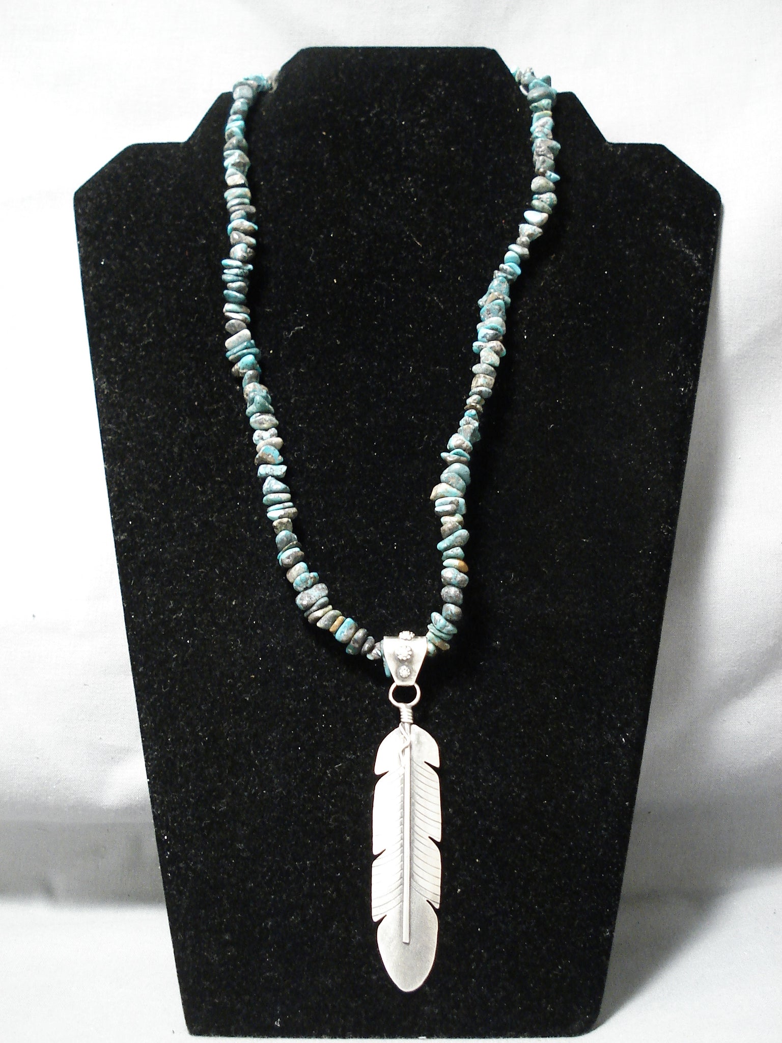 This is an astonishing Navajo silver necklace. The 20” necklace portion of this piece is made up of mega amounts of beautiful turquoise – strung side by side! The largest of stones is about 3/8” x 3/16”. And the necklace comes with the impressive removable dangling silver feather pendant that has a large 1/2” bail opening that would easily accommodate another necklace you may already have. The feather pendant alone measures about 3-1/2” x ¾”. Sterling silver, marked. Signed by Navajo artist, Tawny Cruz. Sturdy 48 grams.