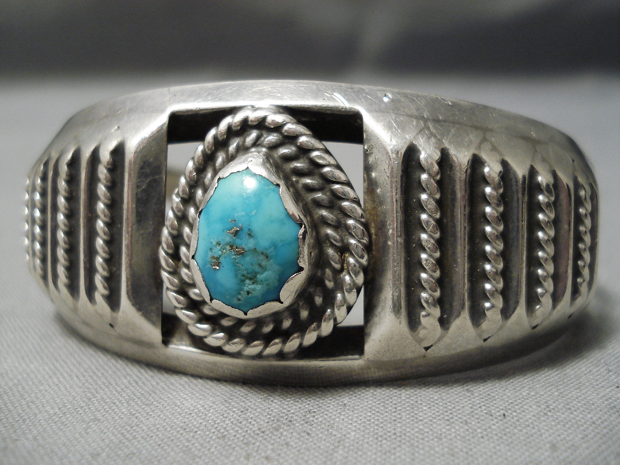 Detailed Vintage Native American Navajo Teadrop Turquoise Sterling Silver Bracelet Cuff Old
