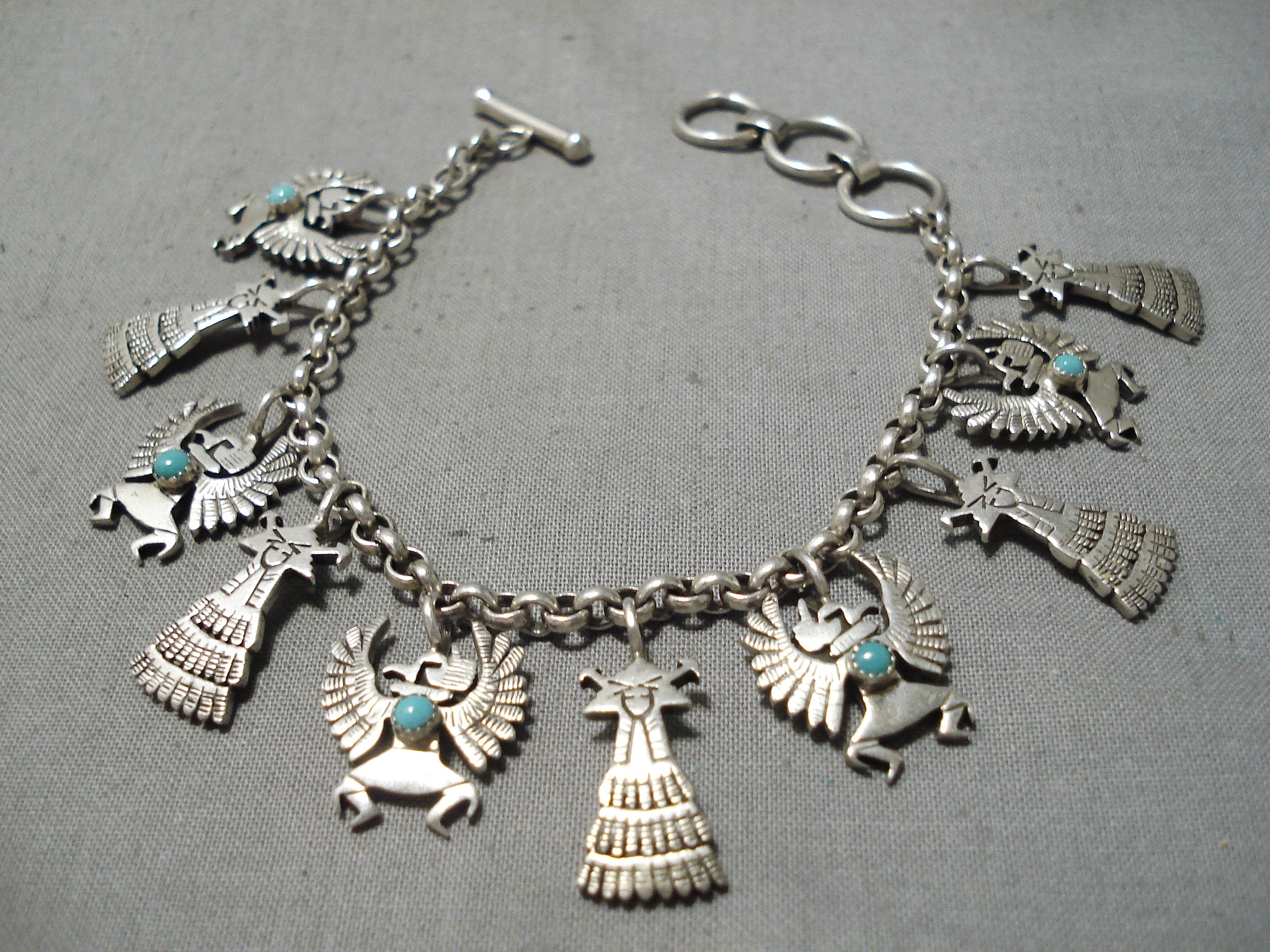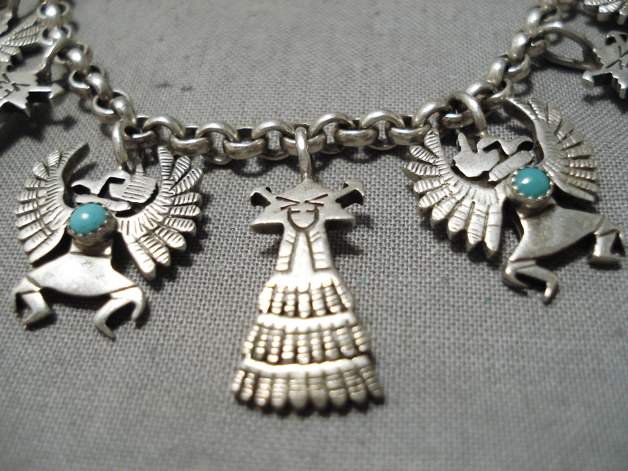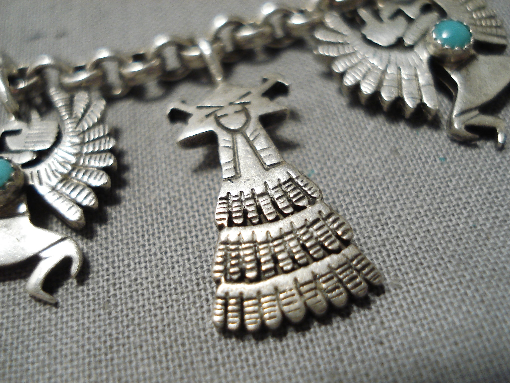 Detailed!! Vintage Native American Navajo Turquoise Sterling Silver Charm Link Bracelet