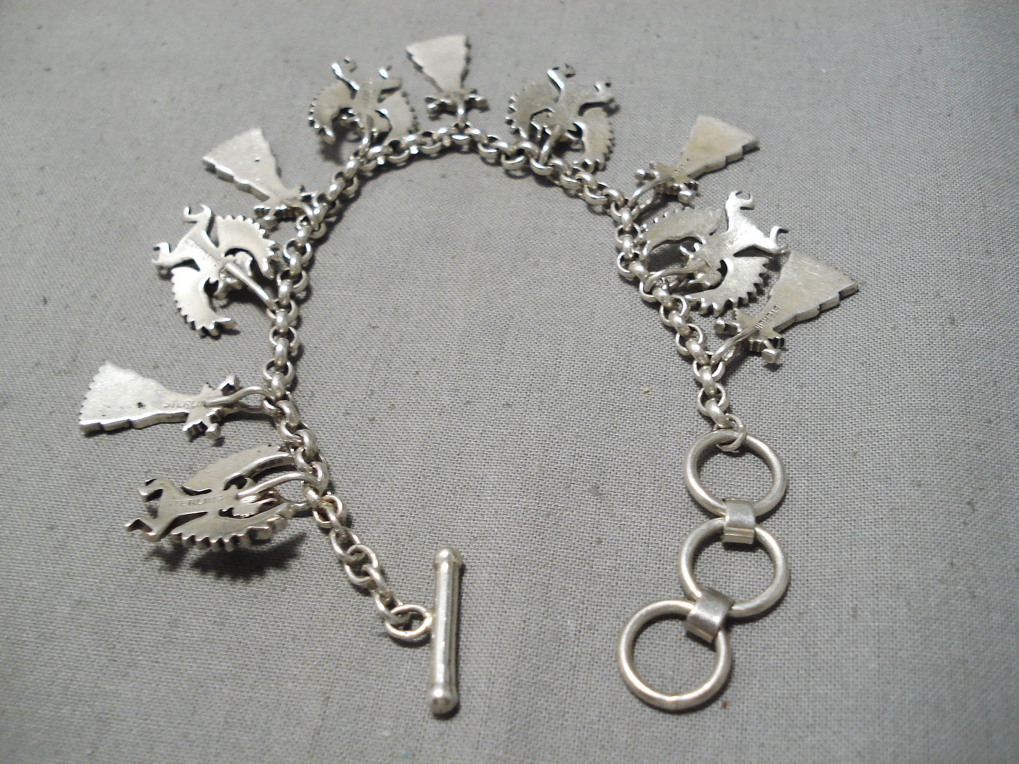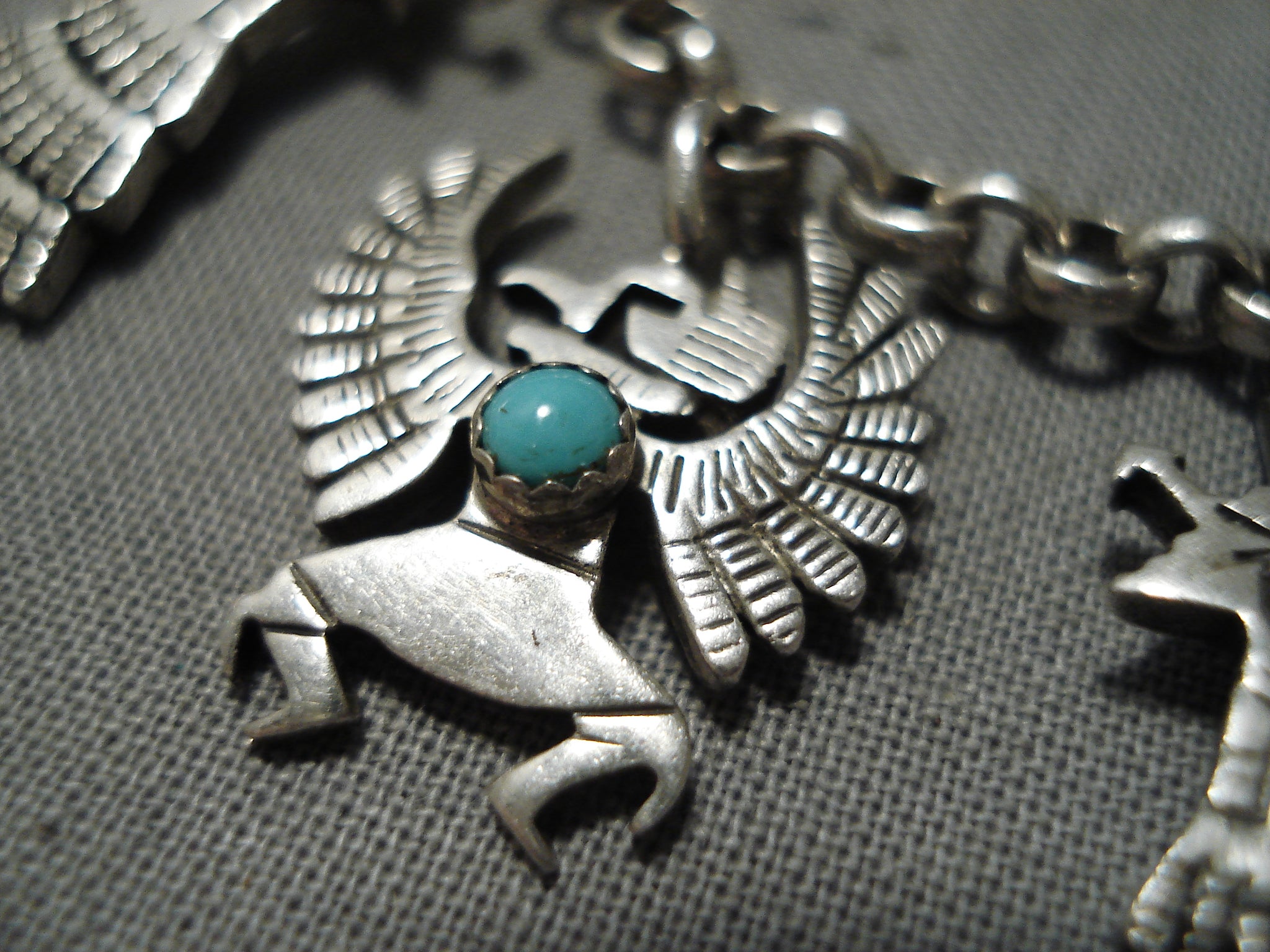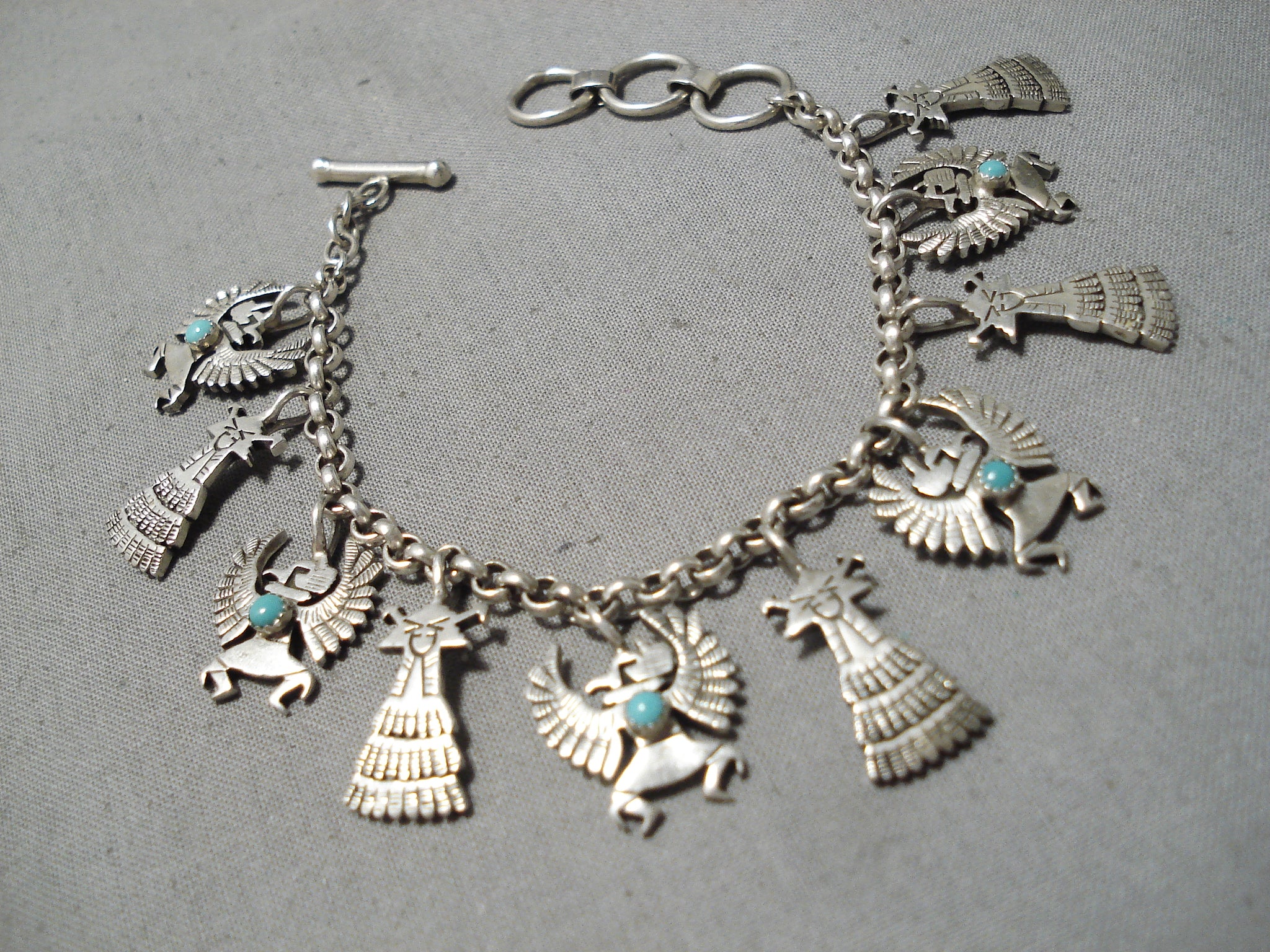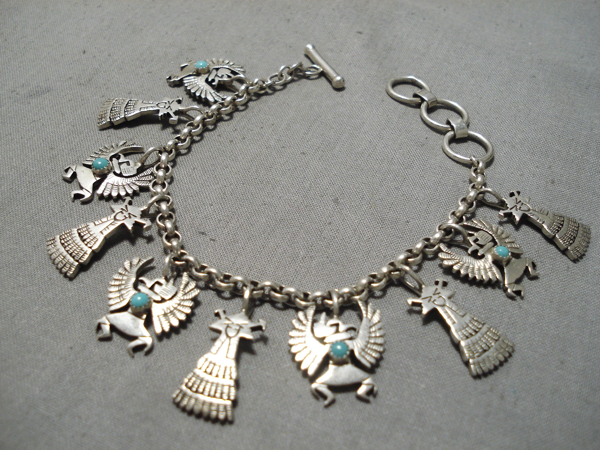 Detailed!! Vintage Native American Navajo Turquoise Sterling Silver Charm Link Bracelet