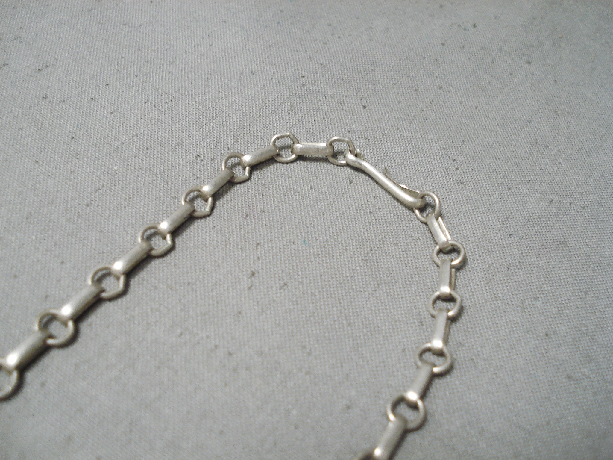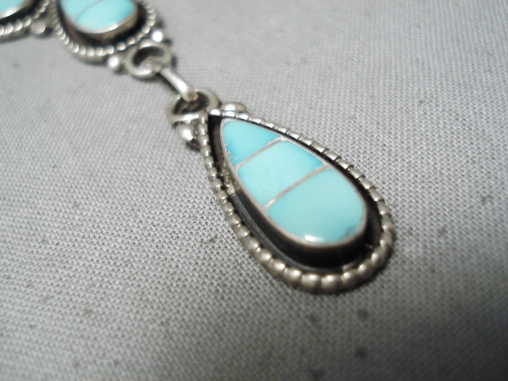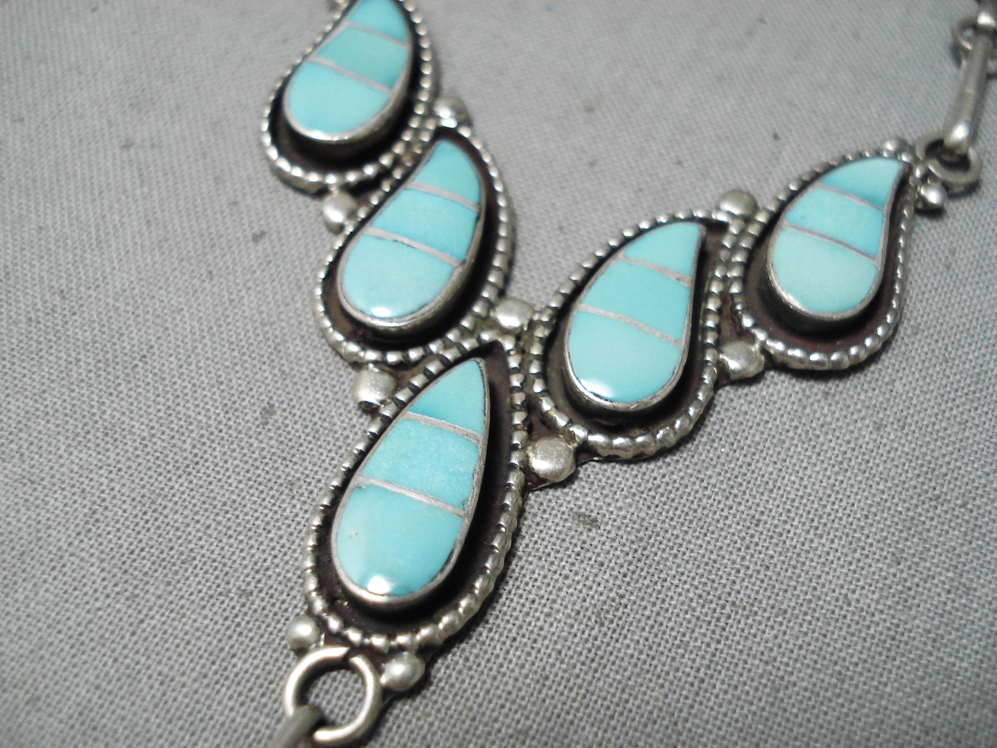 Detailed Vintage Native American Zuni Blue Gem Turquoise Inlay Sterling Silver Necklace