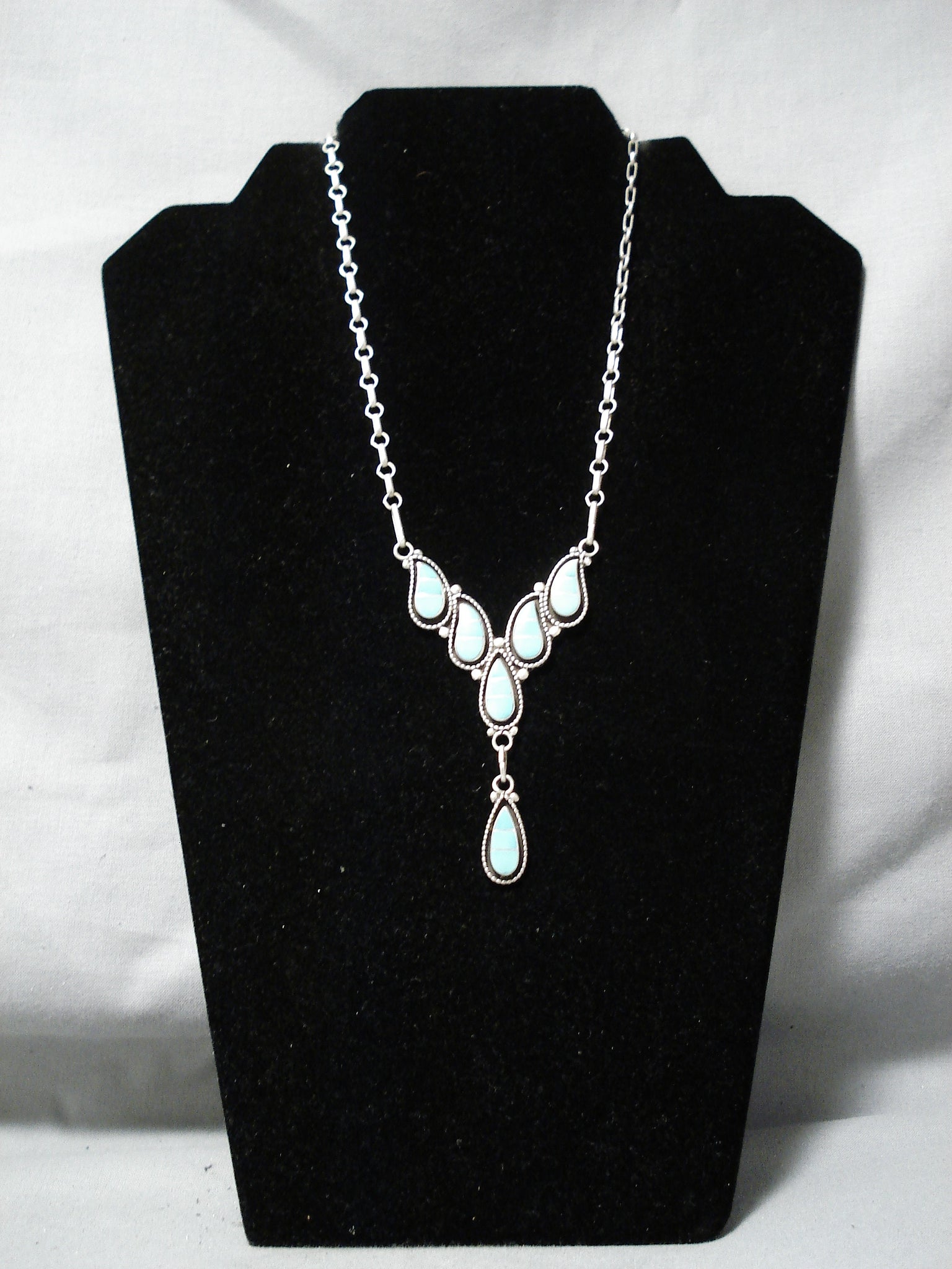 Here we have an incredible vintage Zuni silver necklace having 6 inlay Blue Gem turquoise teardrop pendants with handcarved small silver bead borders and large silver bead accents! The necklace has a silver chain with oblong and round silver links and a handmade silver hook and eye clasp! Simply Amazing! The turquoise teardrop pendants measure about 5/8" x 1/4". Sterling silver. Cir. 1980's+. Signed by Zuni artist, W.J.S. The length of the necklace measures around 14". Sturdy 18 grams.