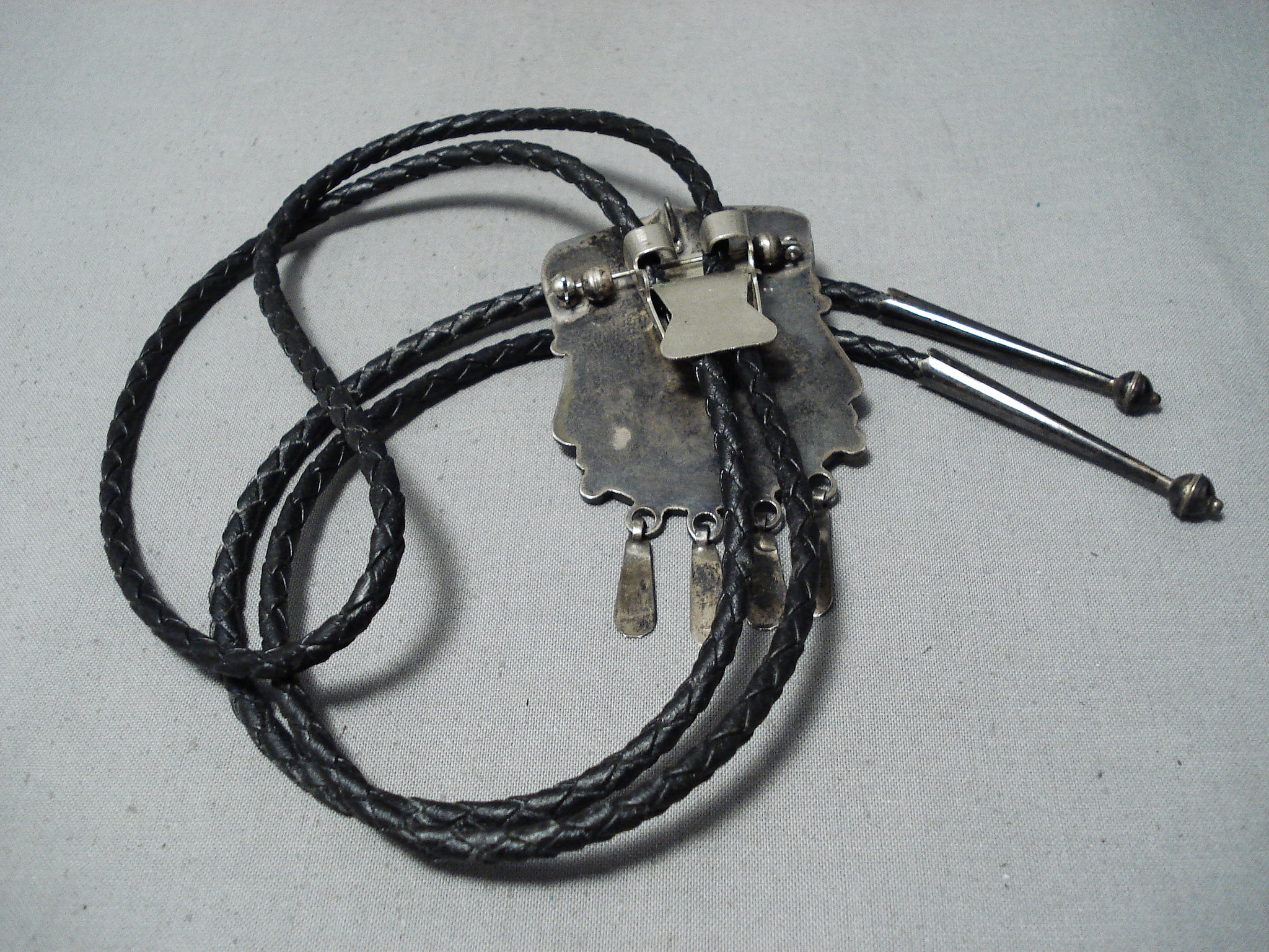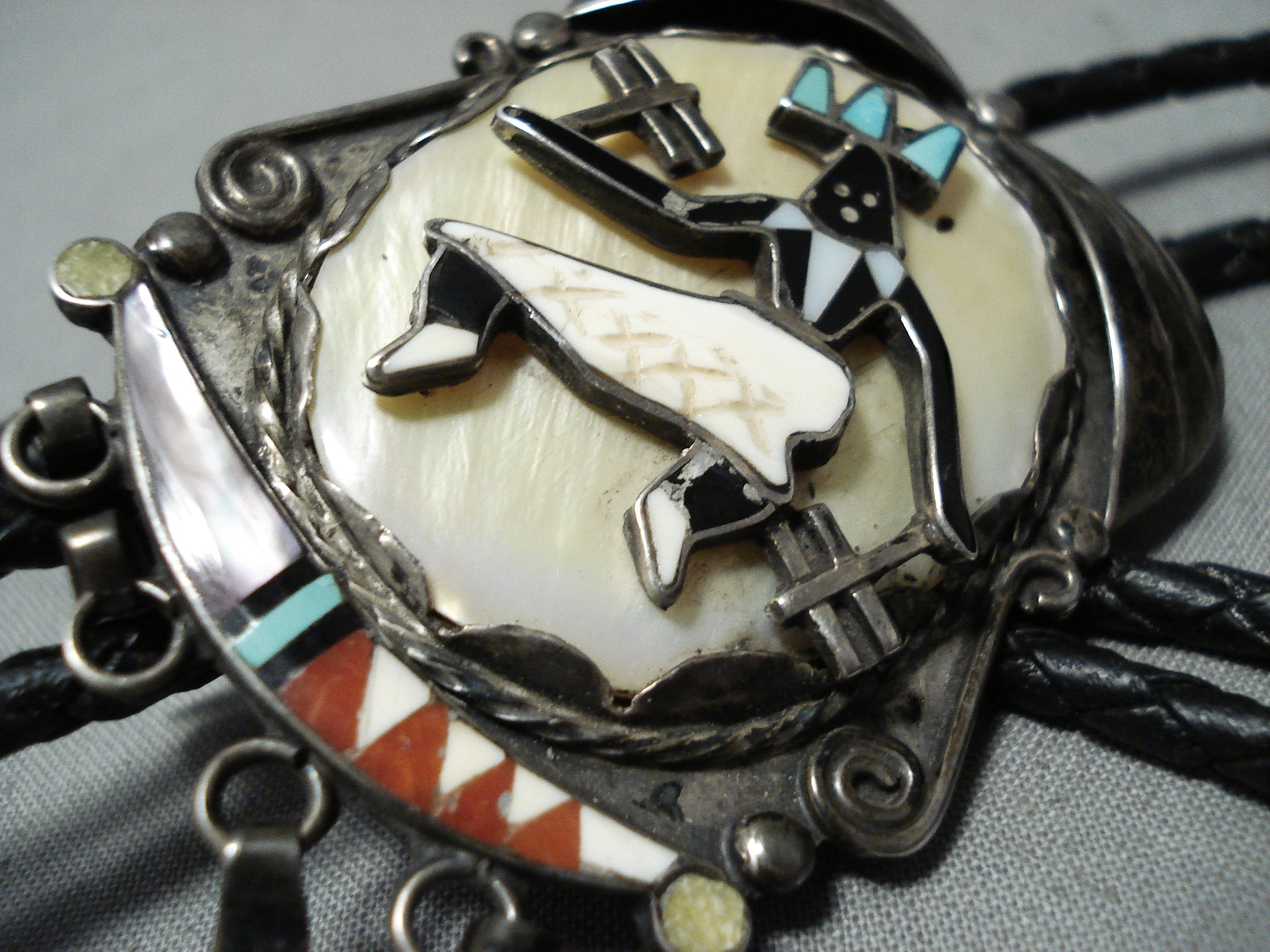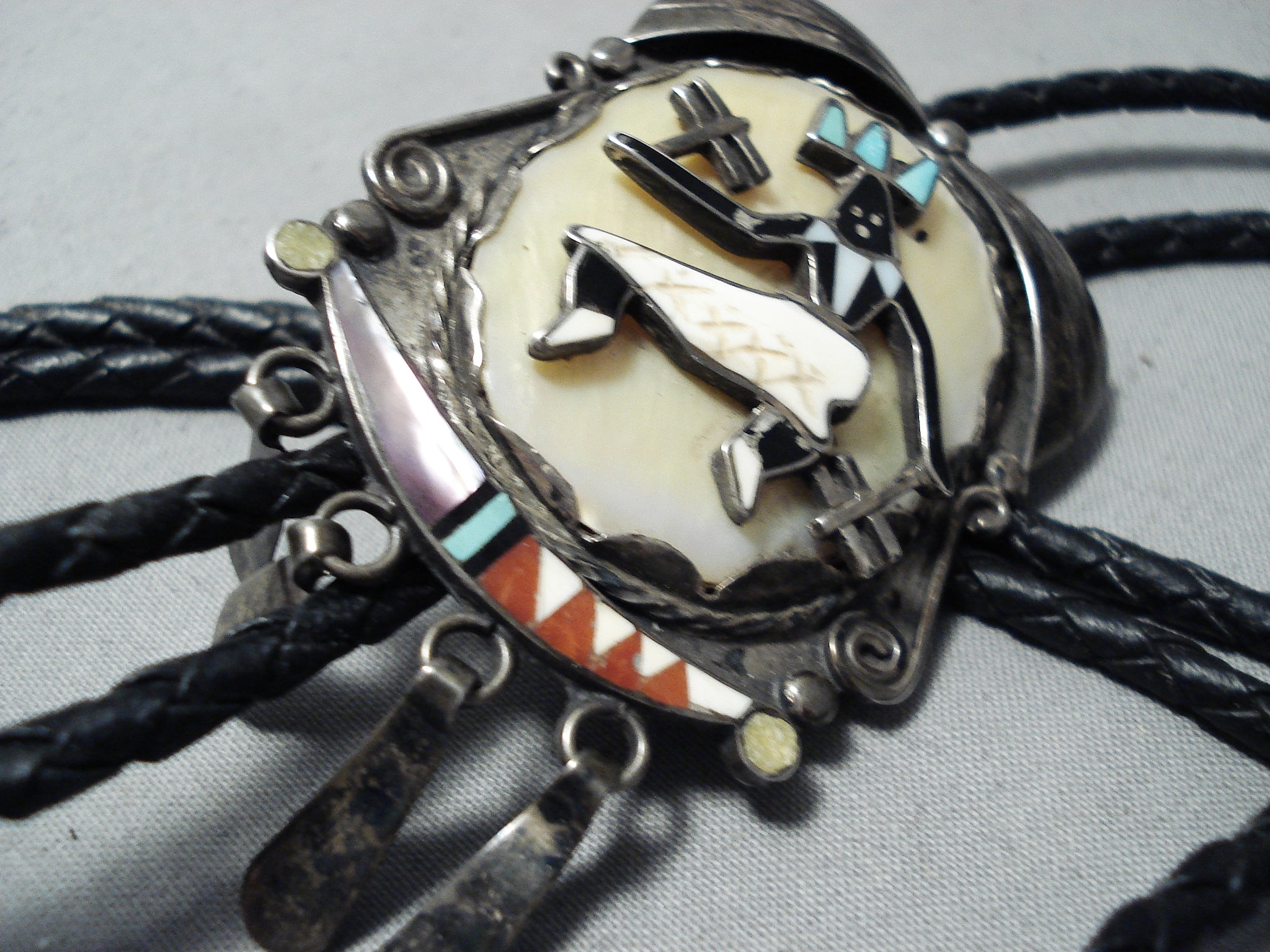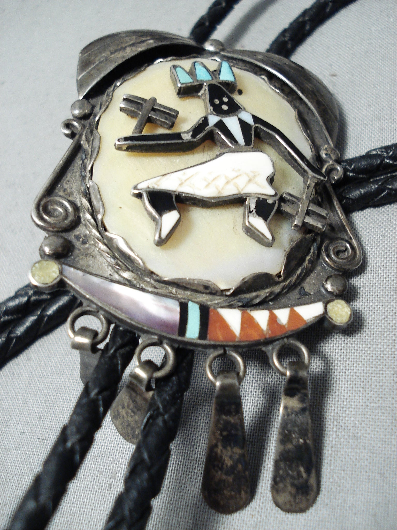 This is a marvelous vintage Zuni inlaid kachina dancer silver bolo tie. This phenomenal piece contains a marvelous inlaid silver bolo that measures around 2-3/4" X 1-3/4" including the four dangling silver raindrop pieces. This bolo consists of a superior inlaid kachina dancer that consists of mother of pearl, turquoise, coral, pink shell, and onyx. The silver works that surround the bolo include fans, raindrops, ropes and stems. Located at the bottom of the amazing 42" long black leather tie are amazing silver pins with silver raindrops. This bolo and pins consist of outstanding old natural patina. What I love about this piece is that it is a bolo but can be removed and can be worn as a pin if desired. Signed by Zuni artist, ABY. Sterling silver. Cir. 1960's+. Sturdy 44 grams.