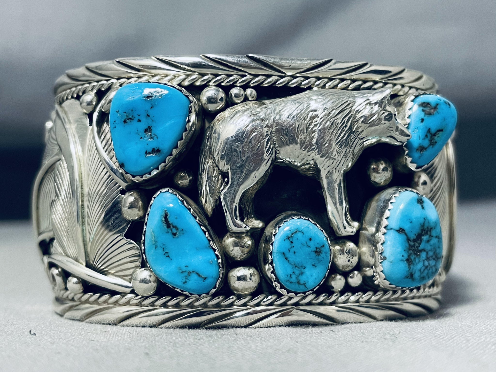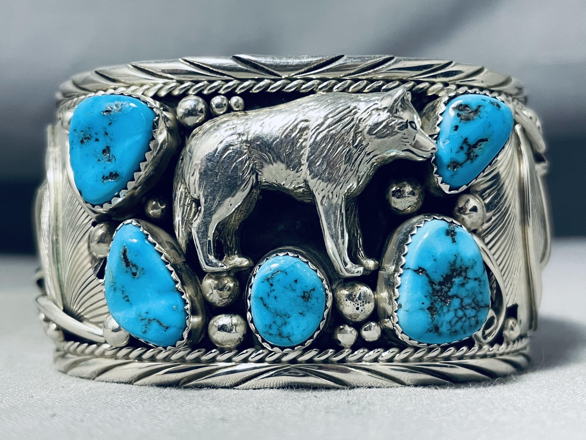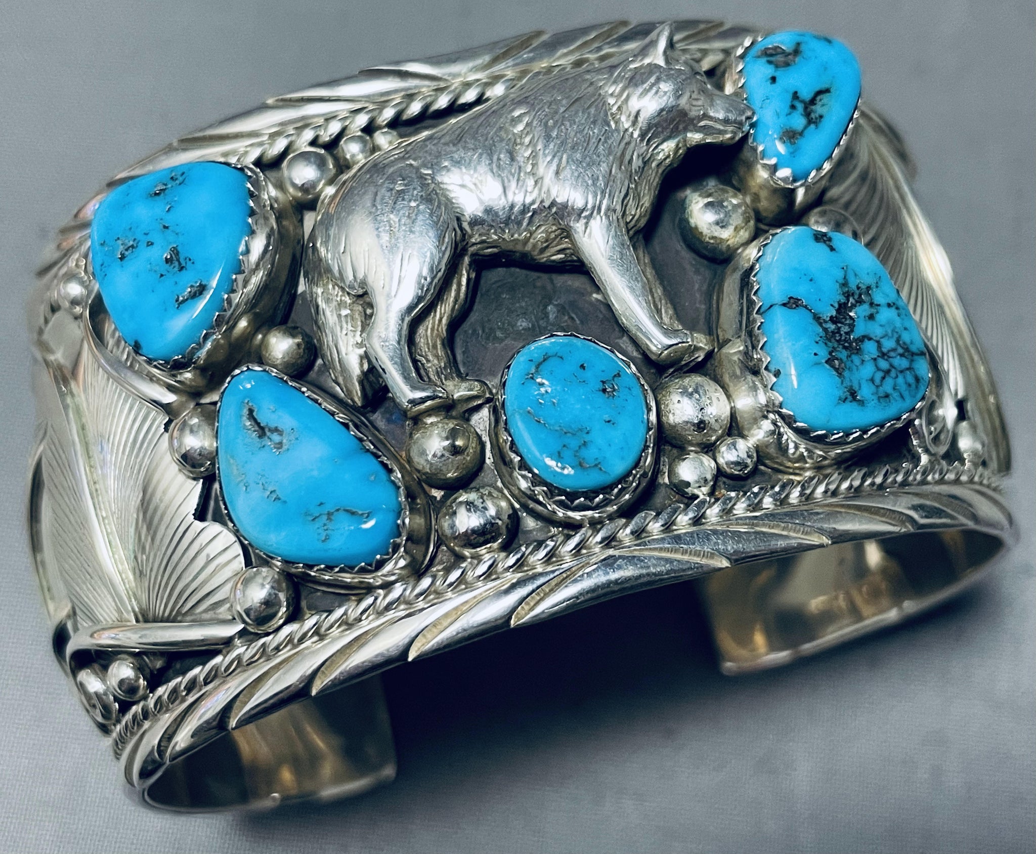 Detailed Wolf Native American Navajo Turquoise Sterling Silver Bracelet