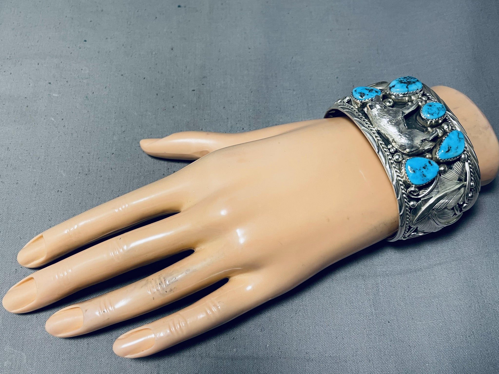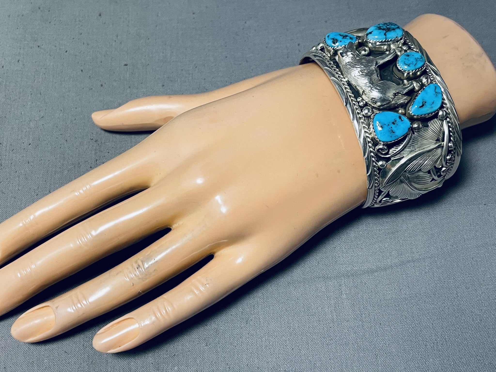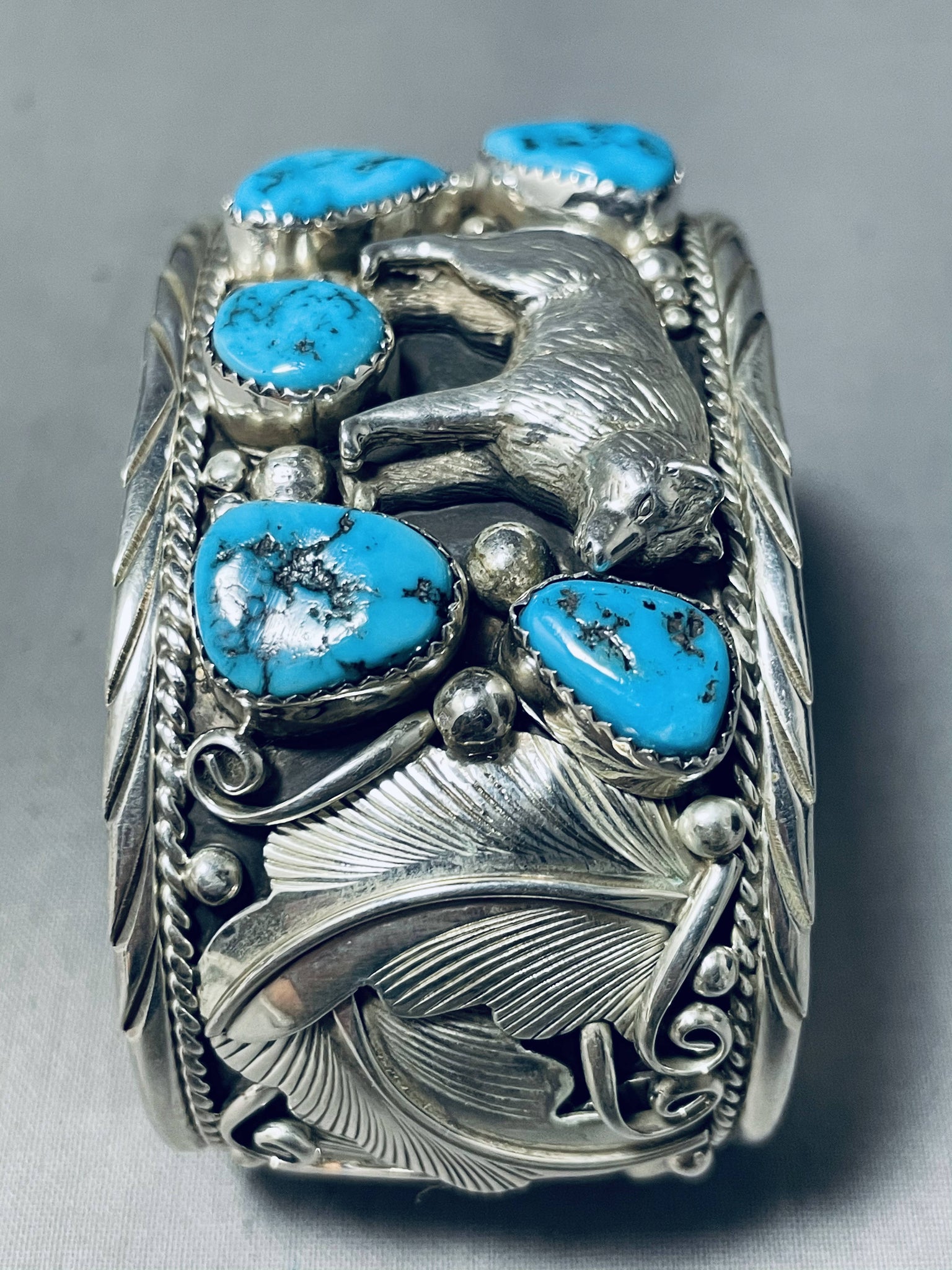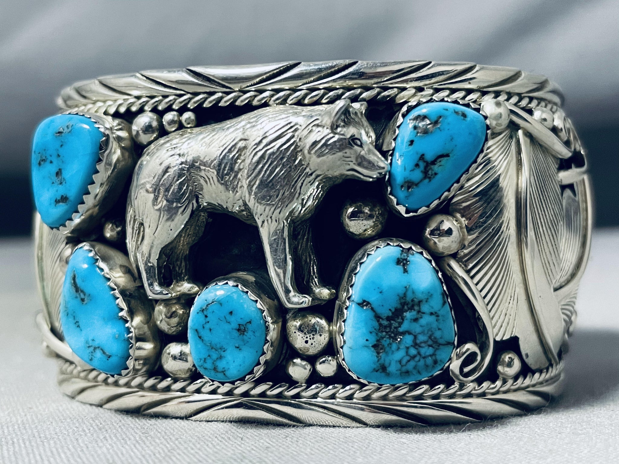 Detailed Wolf Native American Navajo Turquoise Sterling Silver Bracelet