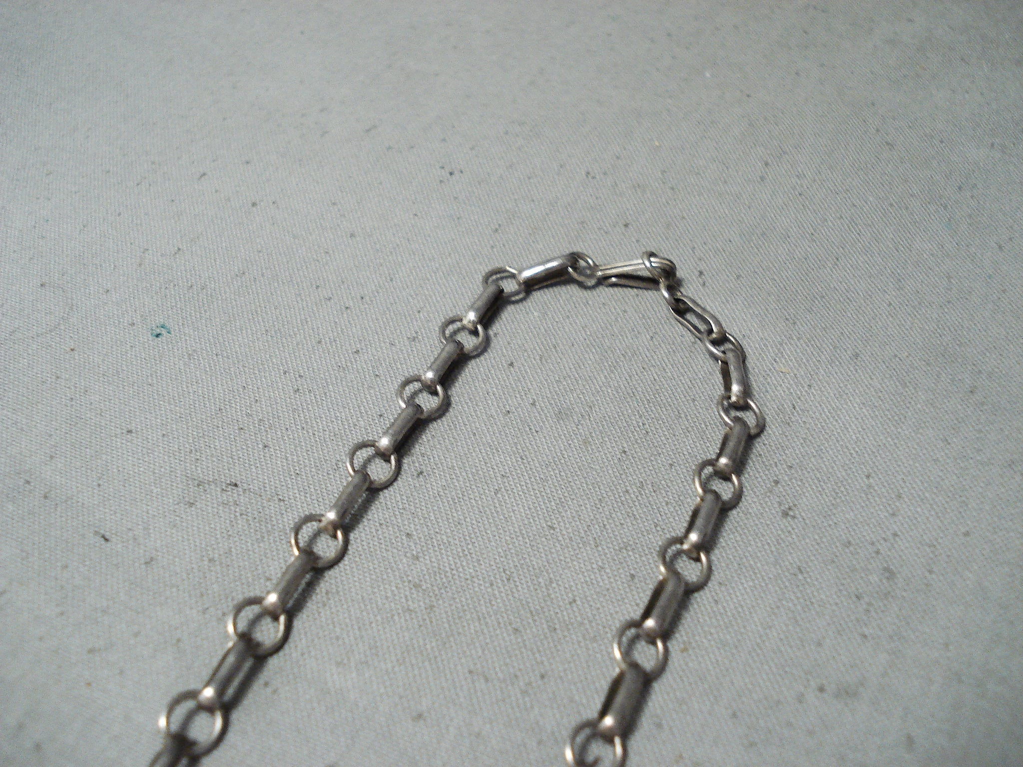 Here we have an exceptional vintage Navajo silver necklace. Fabulously following the neckline, these 11 gorgeous slightly graduated Kingman turquoise stones are perfectly “strung” at the center of this dynamic chain link piece! The largest of stones measures about 3/4” x ½”. Sterling silver, marked. Signed by Navajo artist, TW. The length of the necklace measures around 19". Sturdy 28 grams.