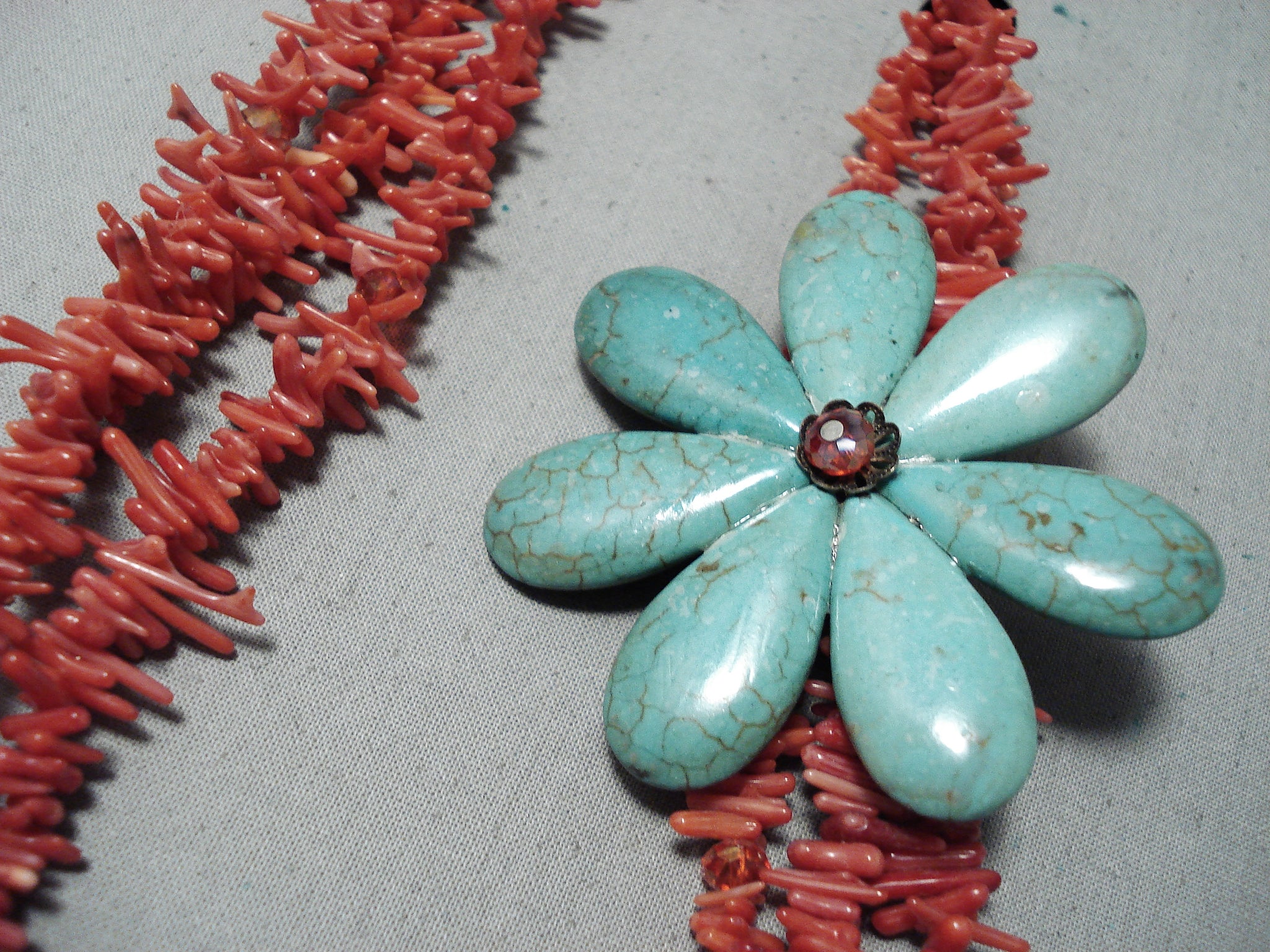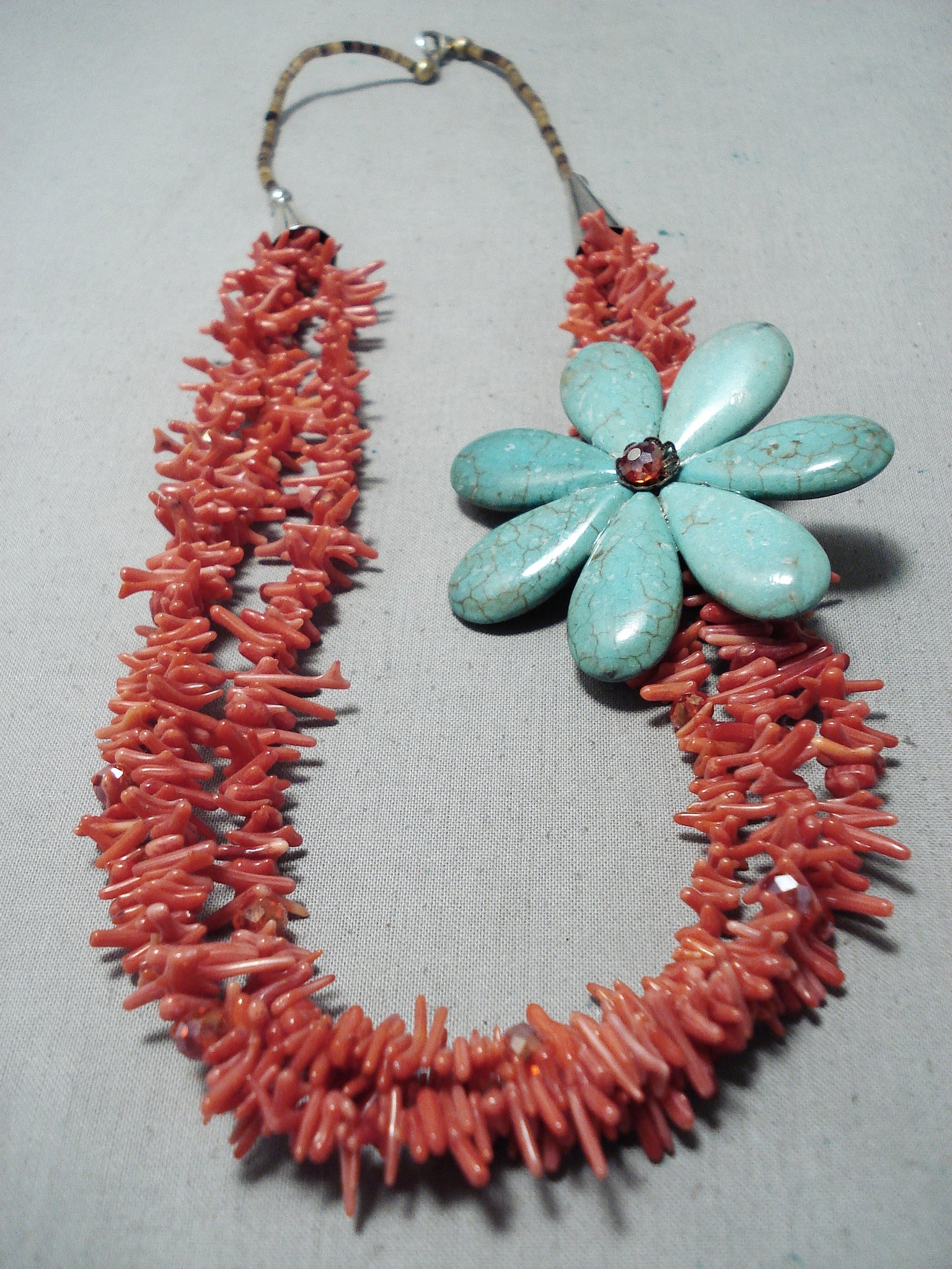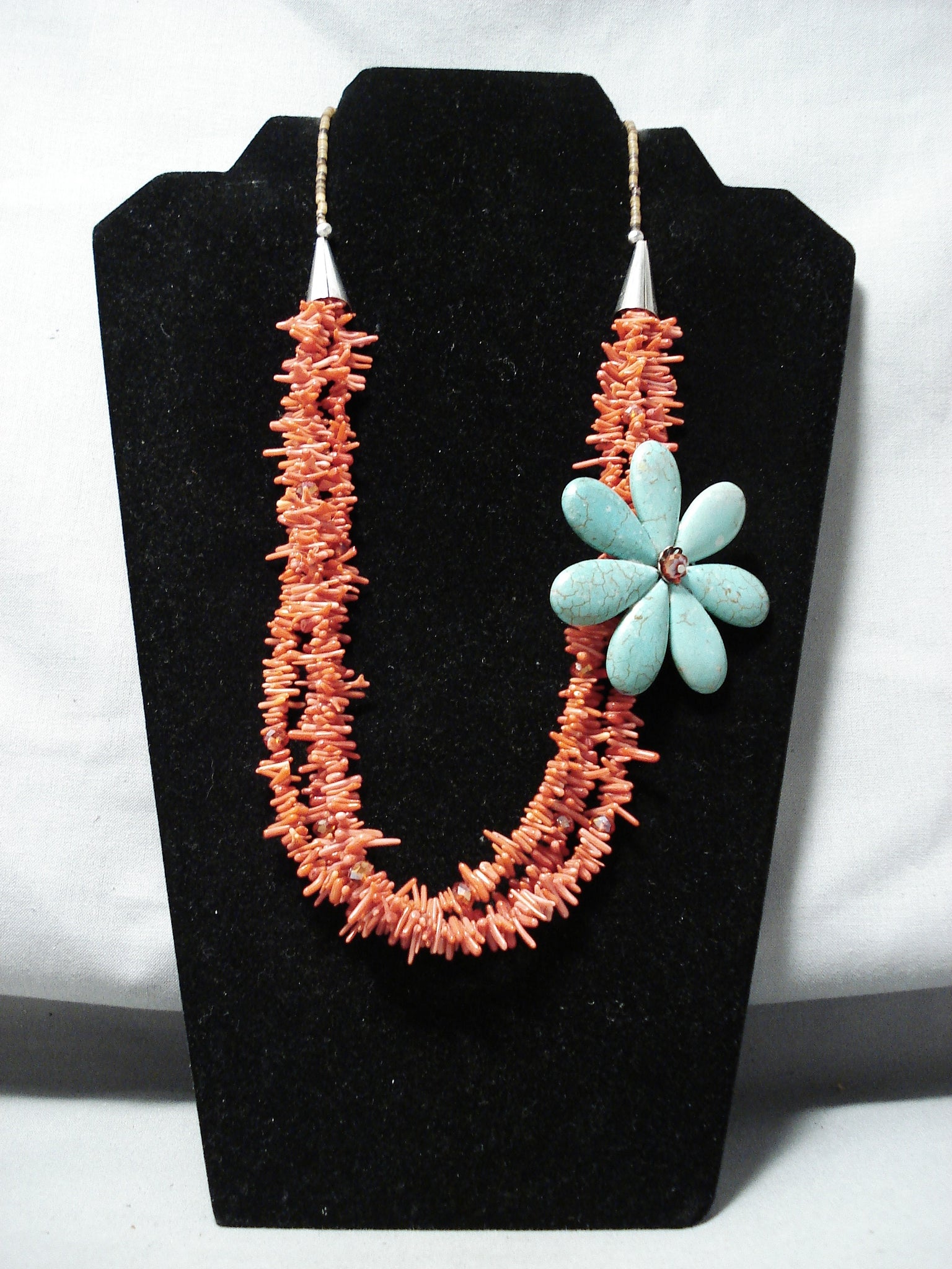 Dynamic Native American Navajo Coral Turquoise Sterling Silver Necklace