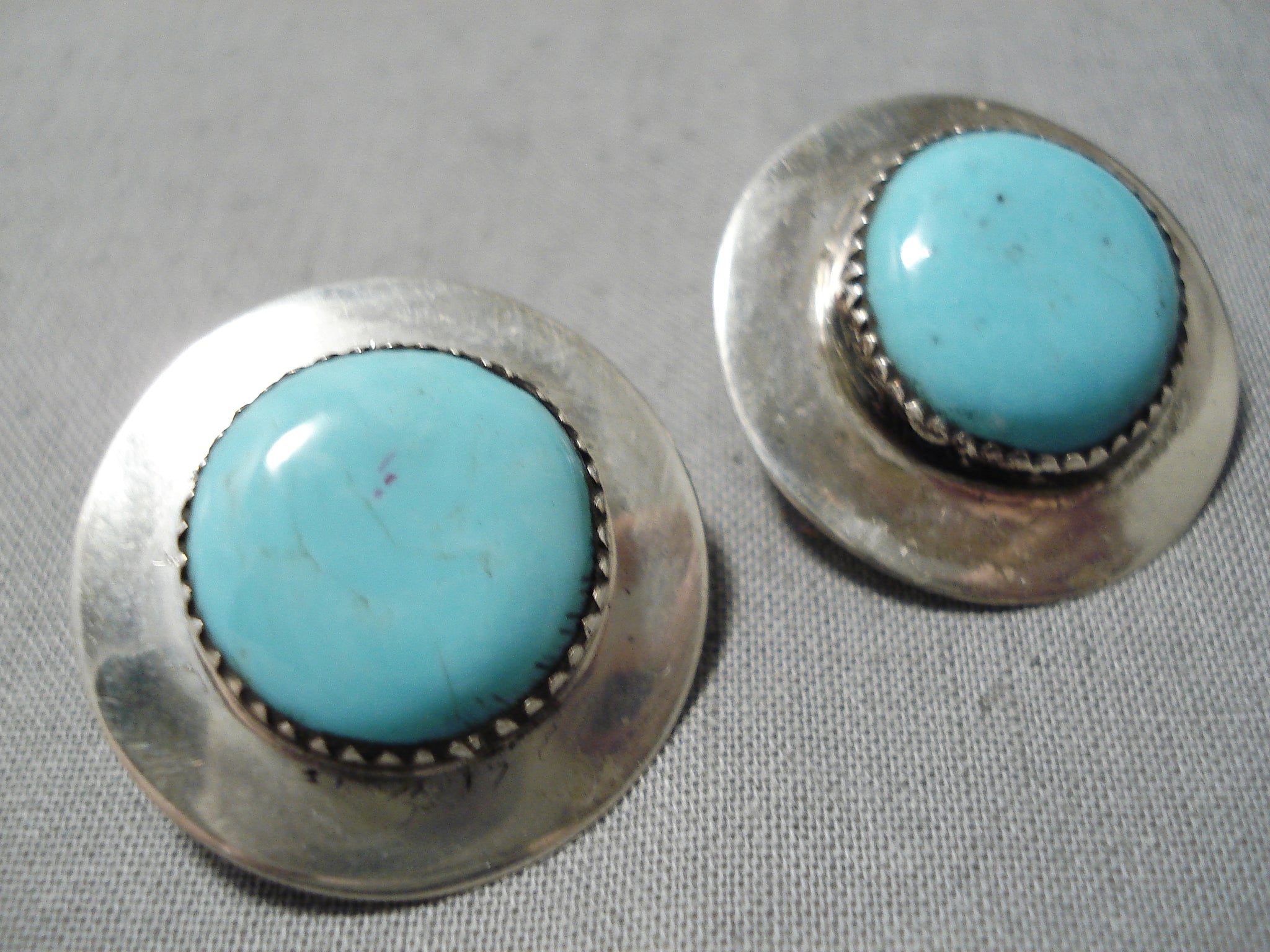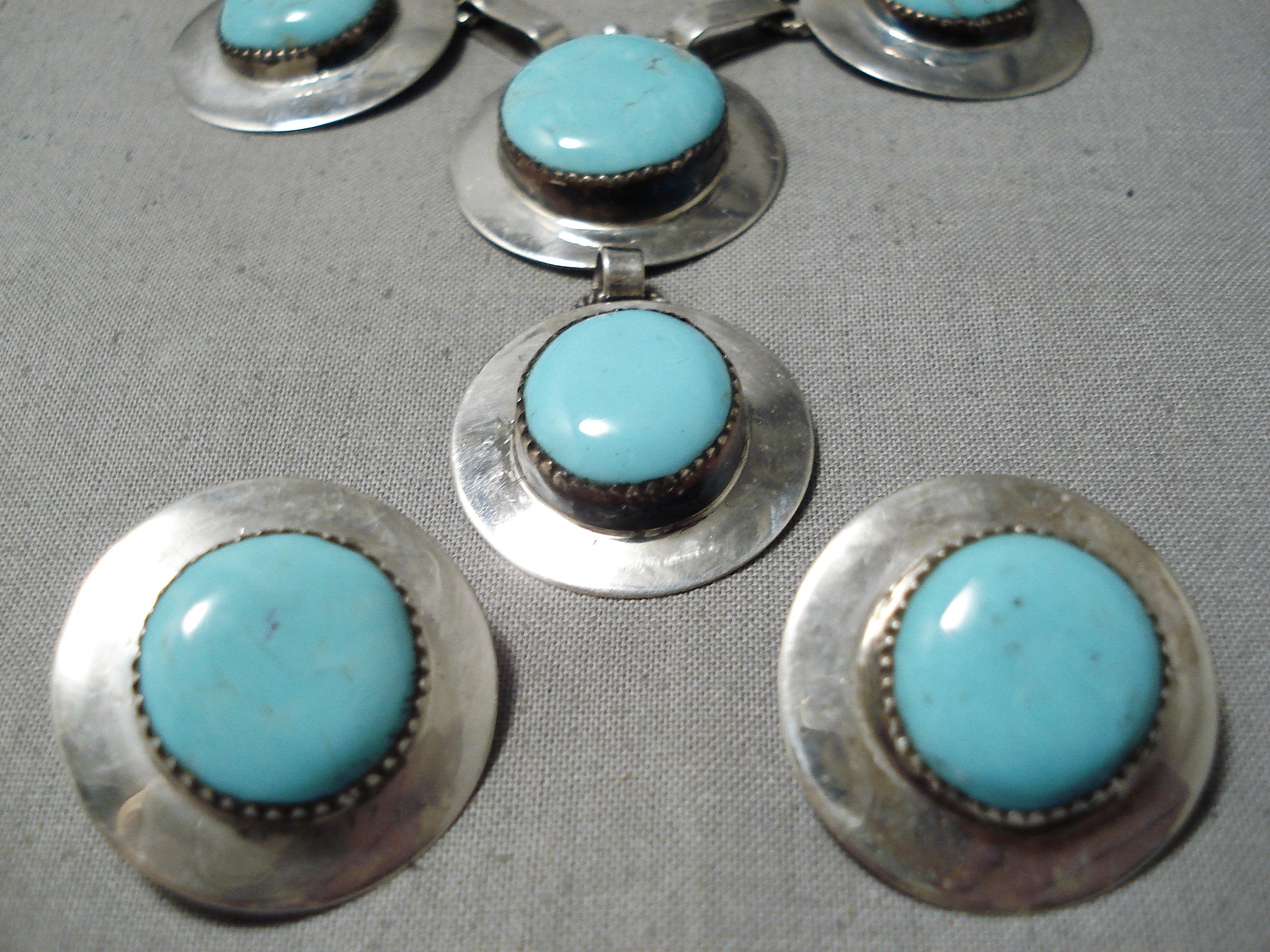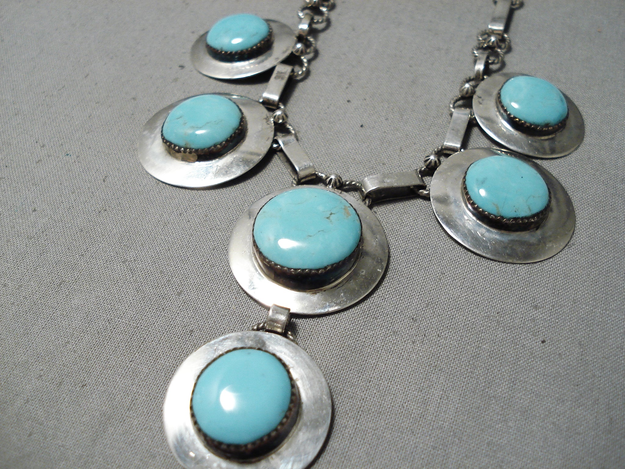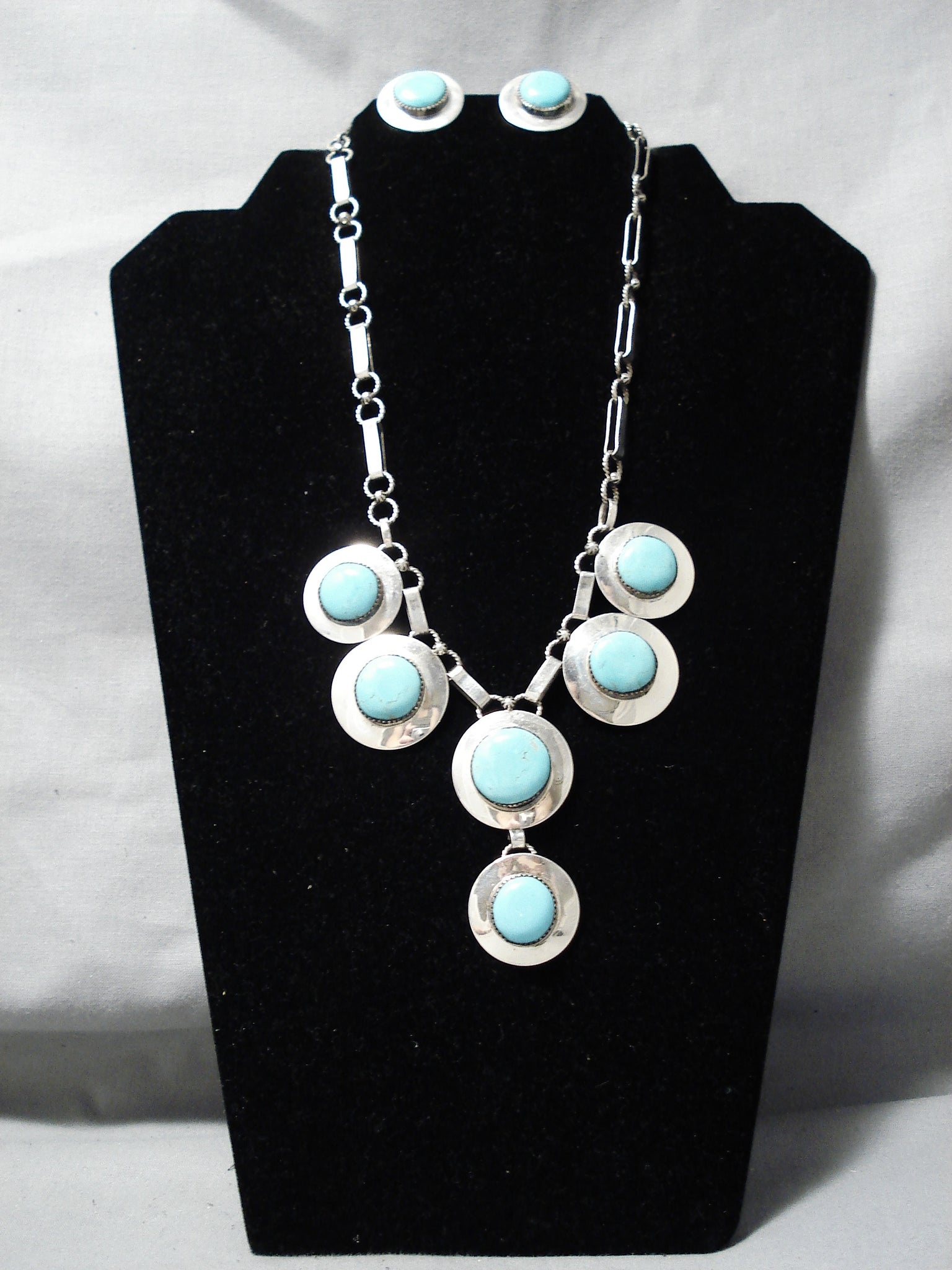 Dynamic Vintage Native American Navajo Blue Gem Turquoise Sterling Silver Necklace & Earring Set Old