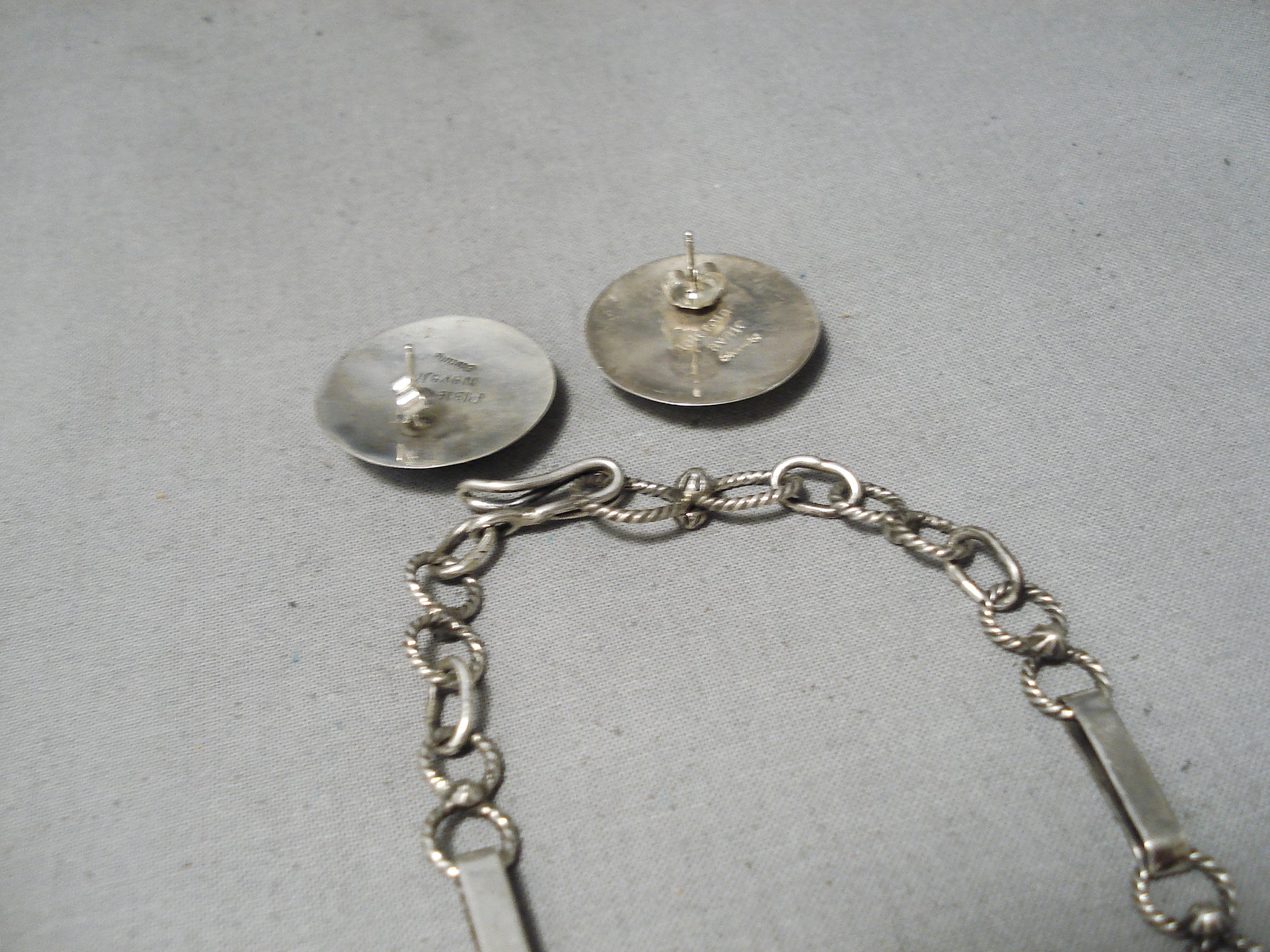 We are proud to offer this breathtaking vintage Navajo silver necklace and earring set. Here we have quite a dramatic necklace and earring set – of stunning Blue Gem turquoise stones – each placed at the center of their silver round platform stations! The unique “y-design“ silver double circle twist and bar link necklace consists of 6 of the stations – the largest in the center being a 1-1/8” round with an 11/16” round Blue Gem turquoise in the middle. And the matching post pierced earrings are a 1” round platform with Blue Gem turquoise in the center. Sterling silver, marked. Signed by Navajo artist, Fannie Platero. The length of the necklace measures around 23". Sturdy 60 grams.