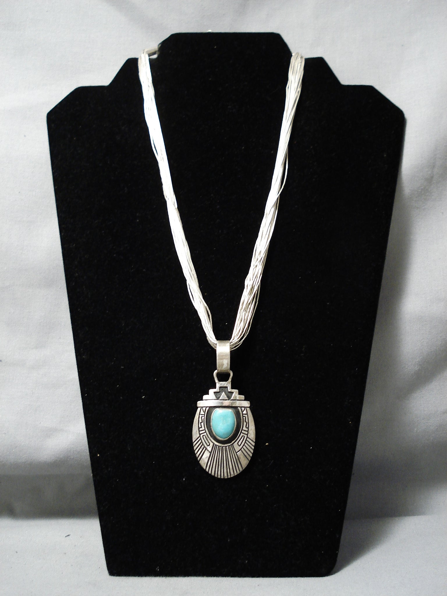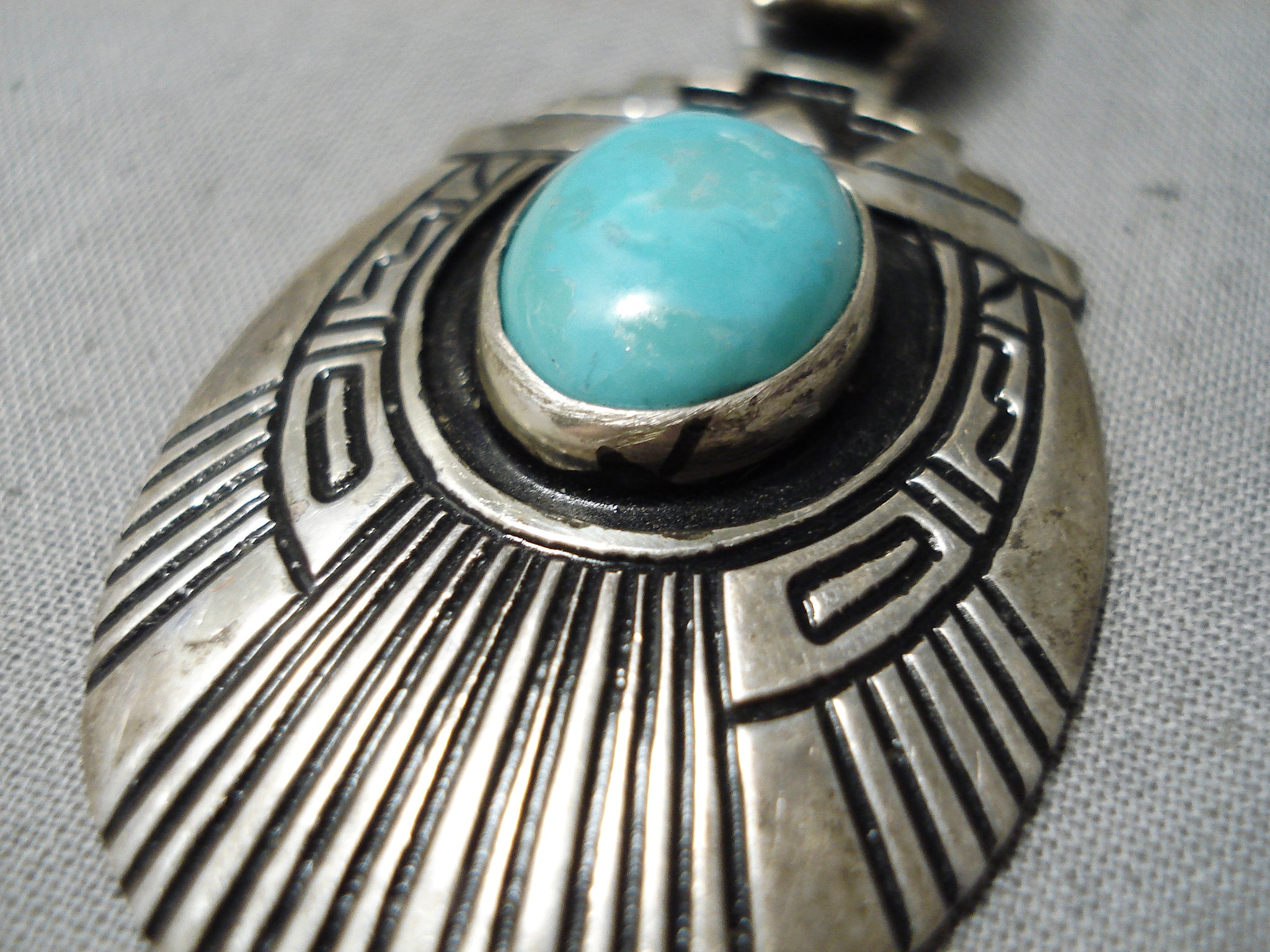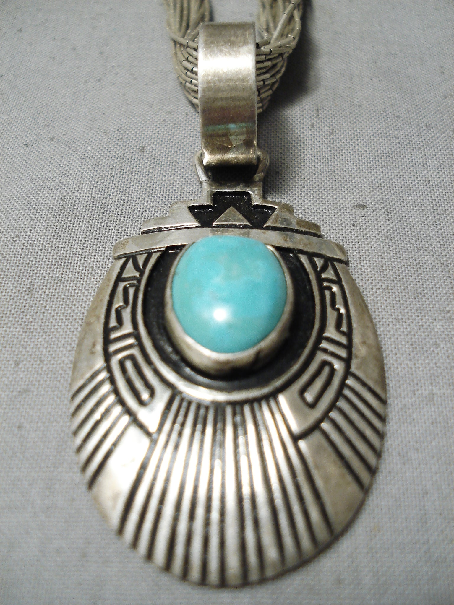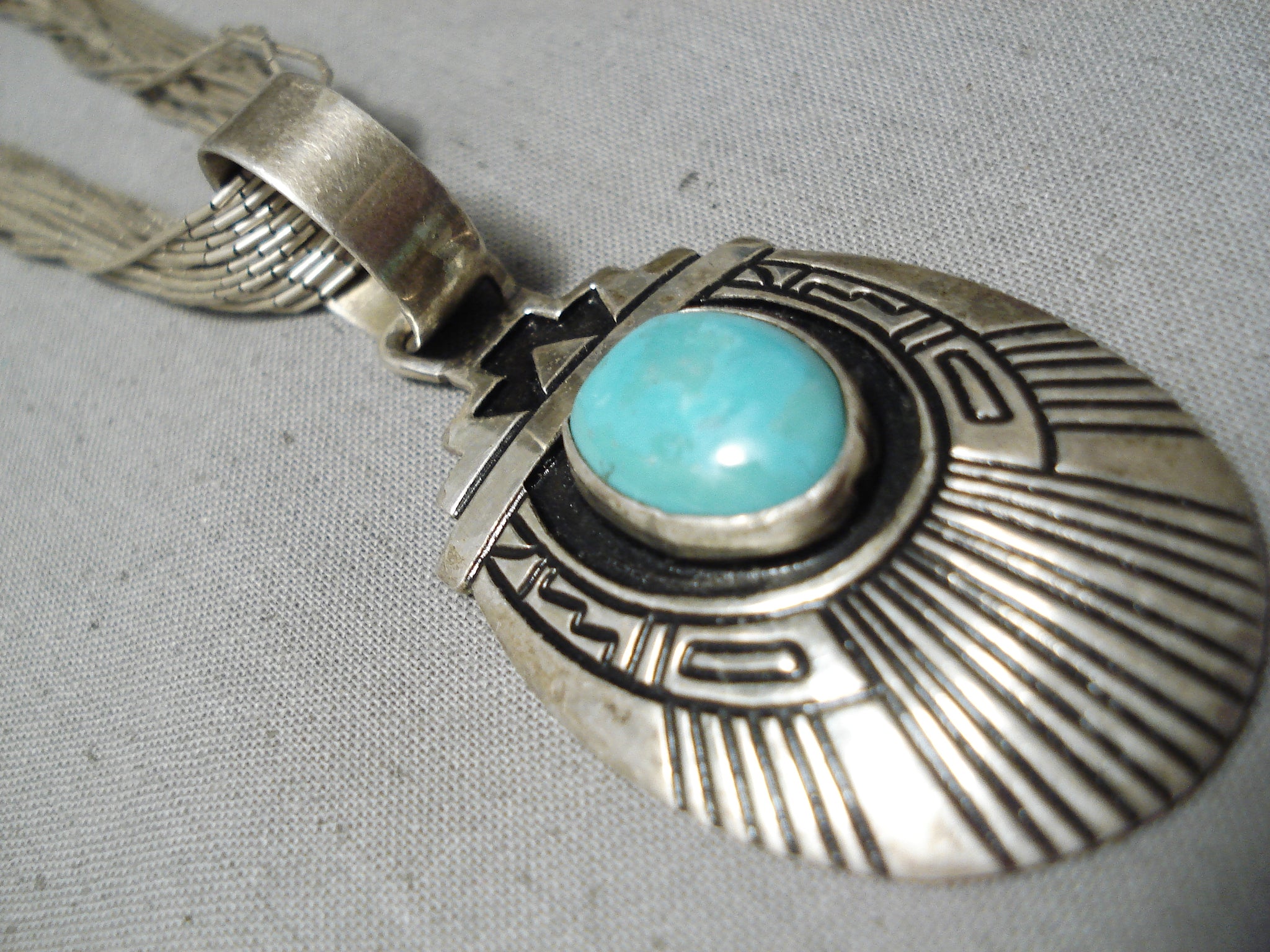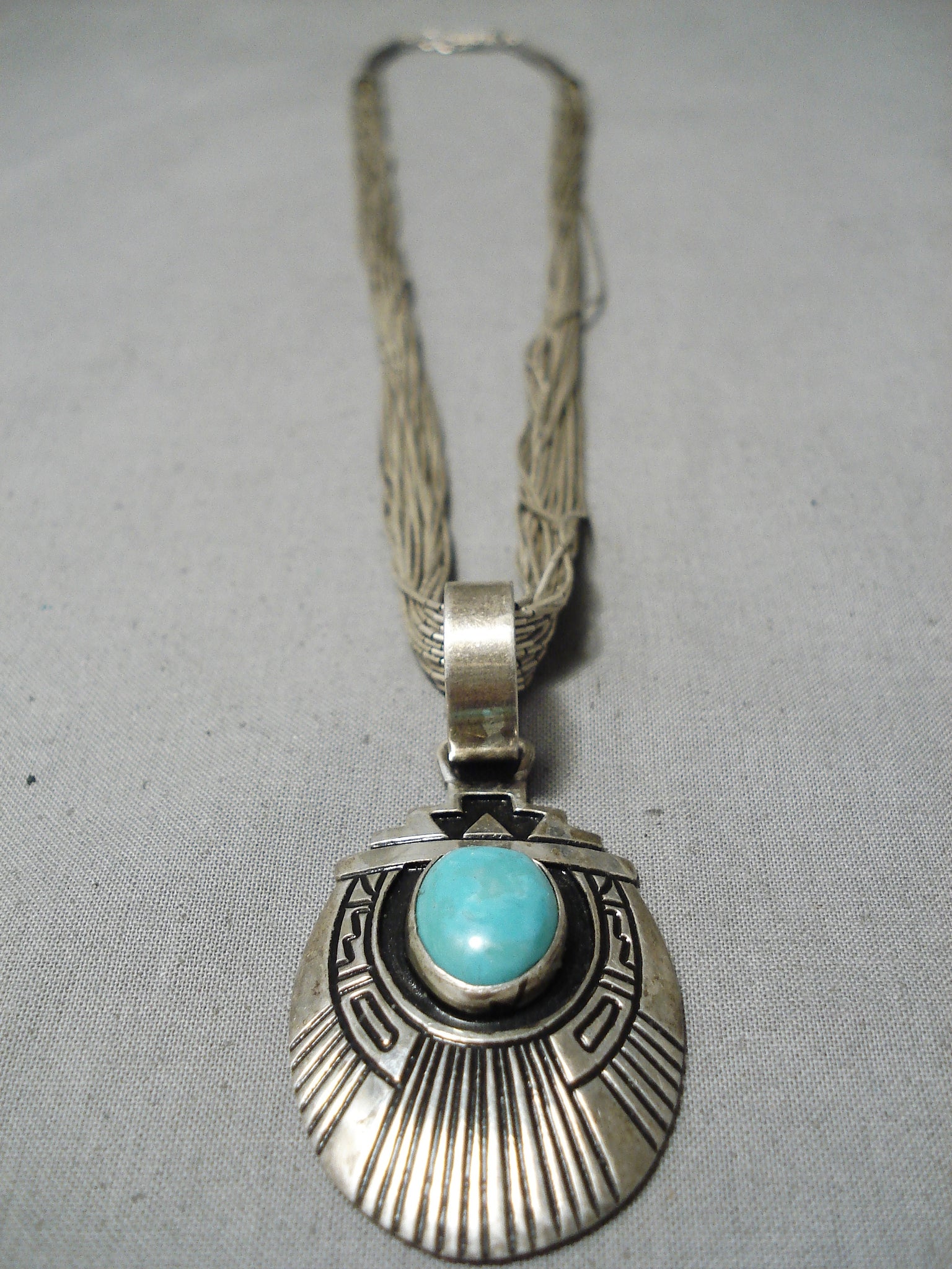Dynamic Vintage Native American Navajo Blue Gem Turquoise Sterling Silver Necklace Old