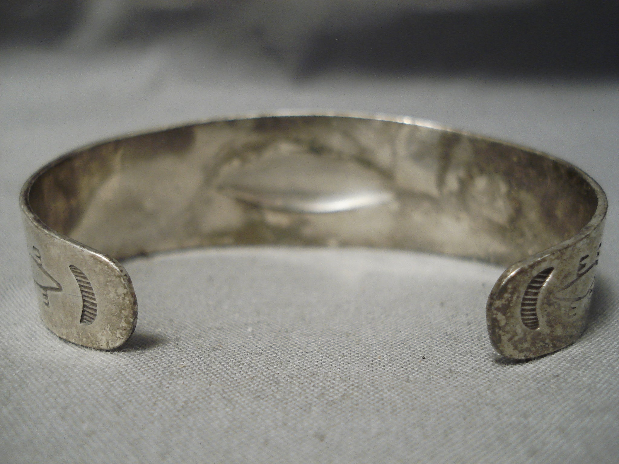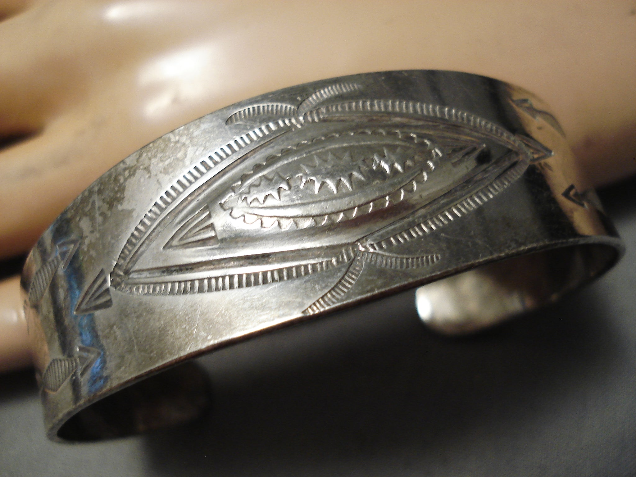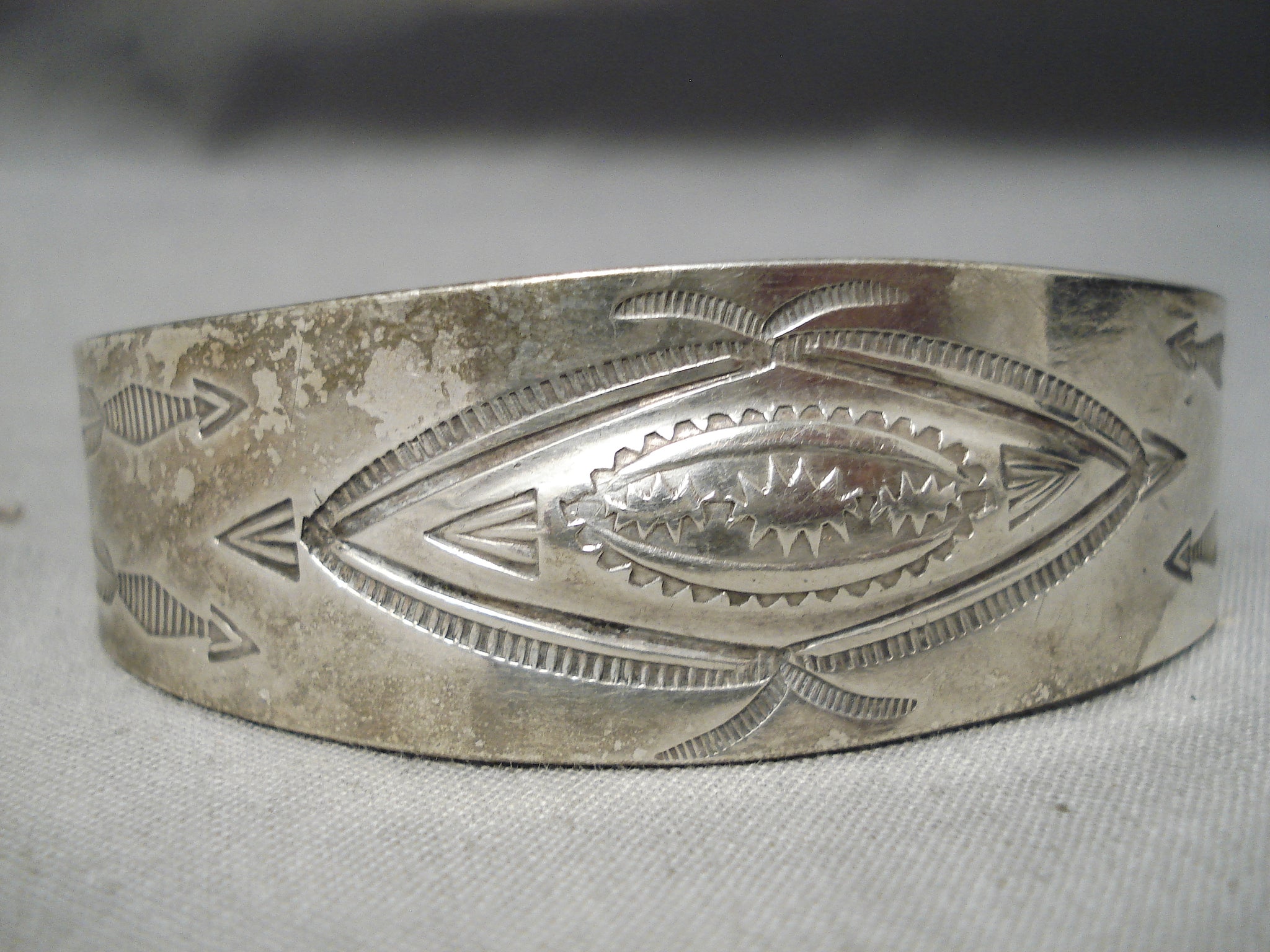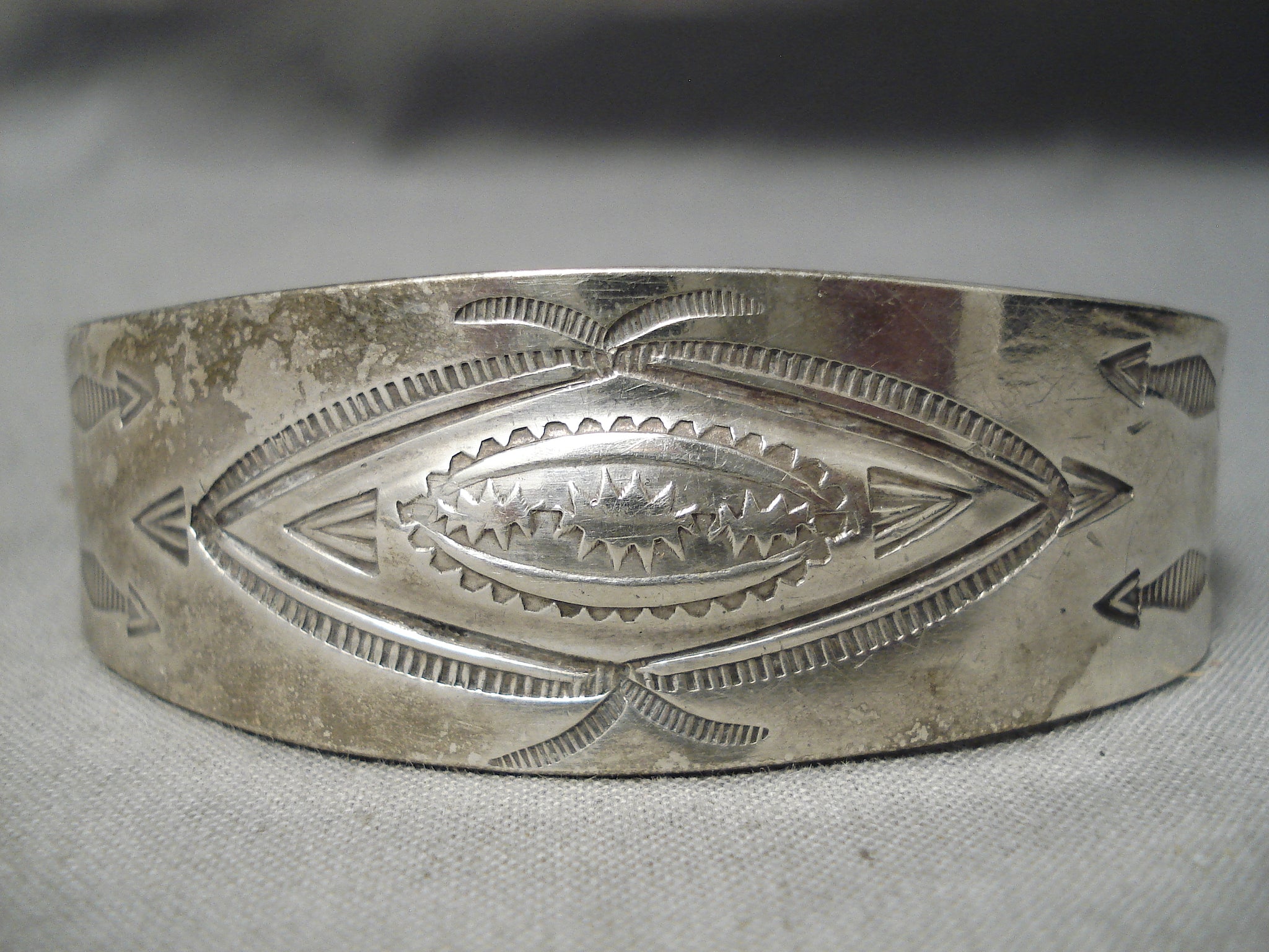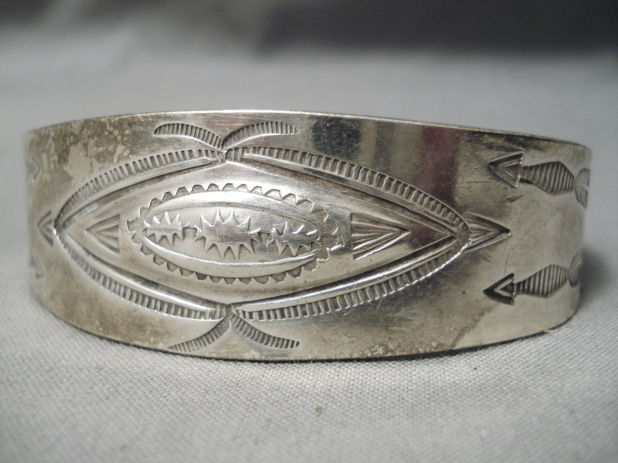 This is a fabulous vintage Navajo all silver bracelet being from the earlier 1900's. This remarkable hand repoussed silver bracelet contains incredible stampings that consist of whirling logs, arrows, sun stampings and teepees. The width of the bracelet measures around 7/8". Sterling silver. Cir. 1930's+ . The inside end to end measures around 5-1/2" with an additional 1-1/4" gap. Sturdy 29 grams.
