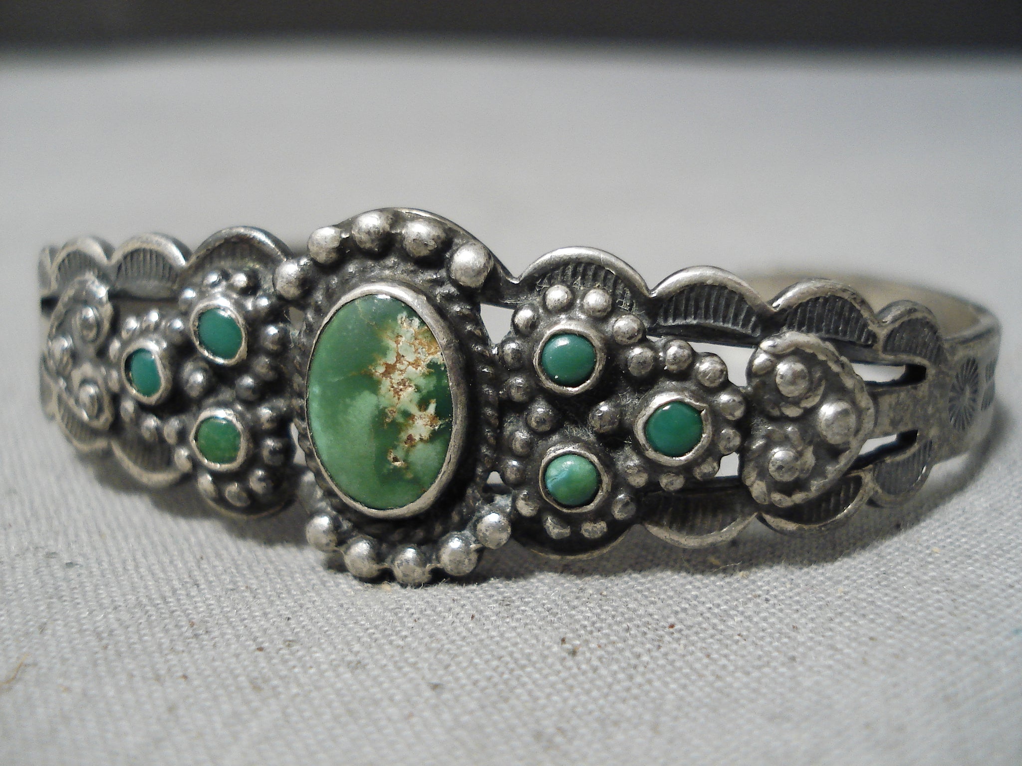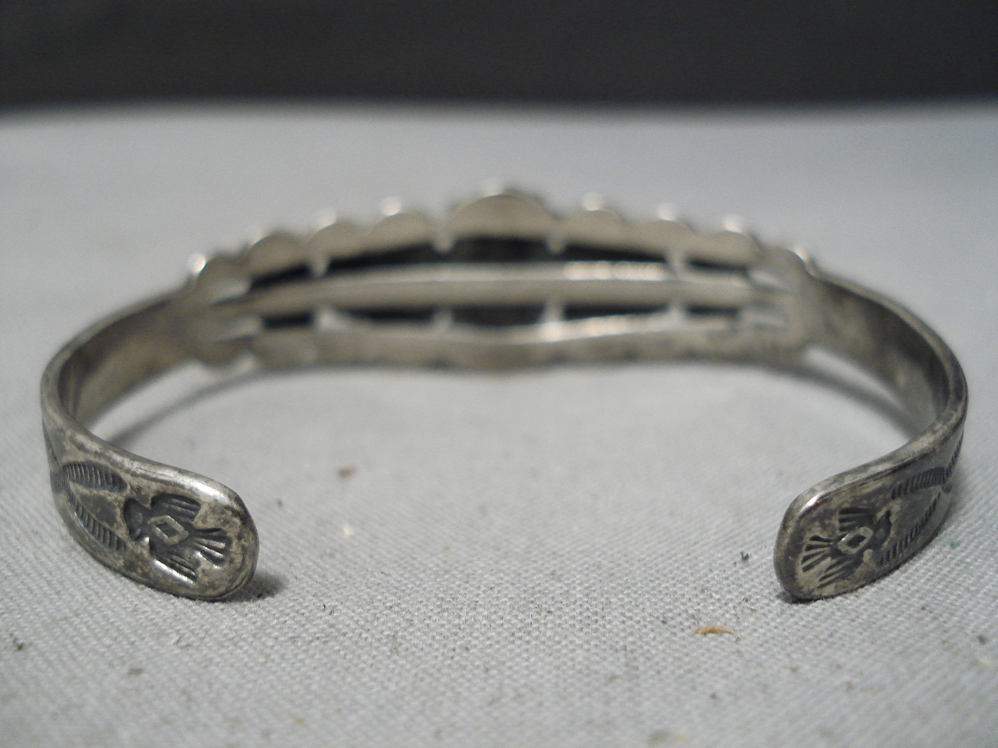 This is a fabulous vintage Navajo silver bracelet. This earlier 1900's piece contains 7 beautiful Cerrillos turquoise stones. The surrounding silver works include raindrops, cloud patterns, sun stampings and arrows. The center stone measures around 3/8" x 1/4". The width of the bracelet measures around 5/8". Sterling silver. Cir. Mid century . The inside end to end measures around 5-1/4" with an additional 1" gap. Sturdy 16 grams.