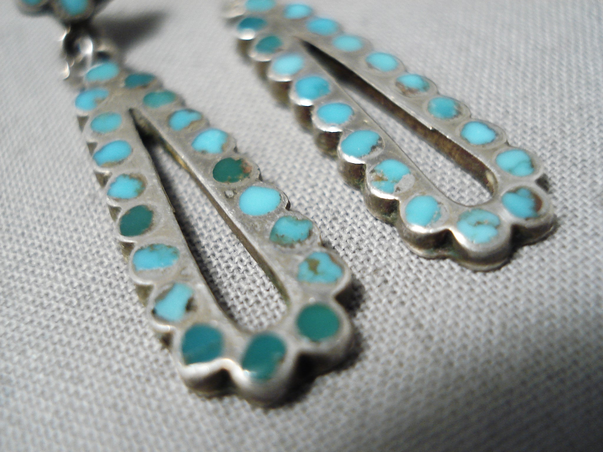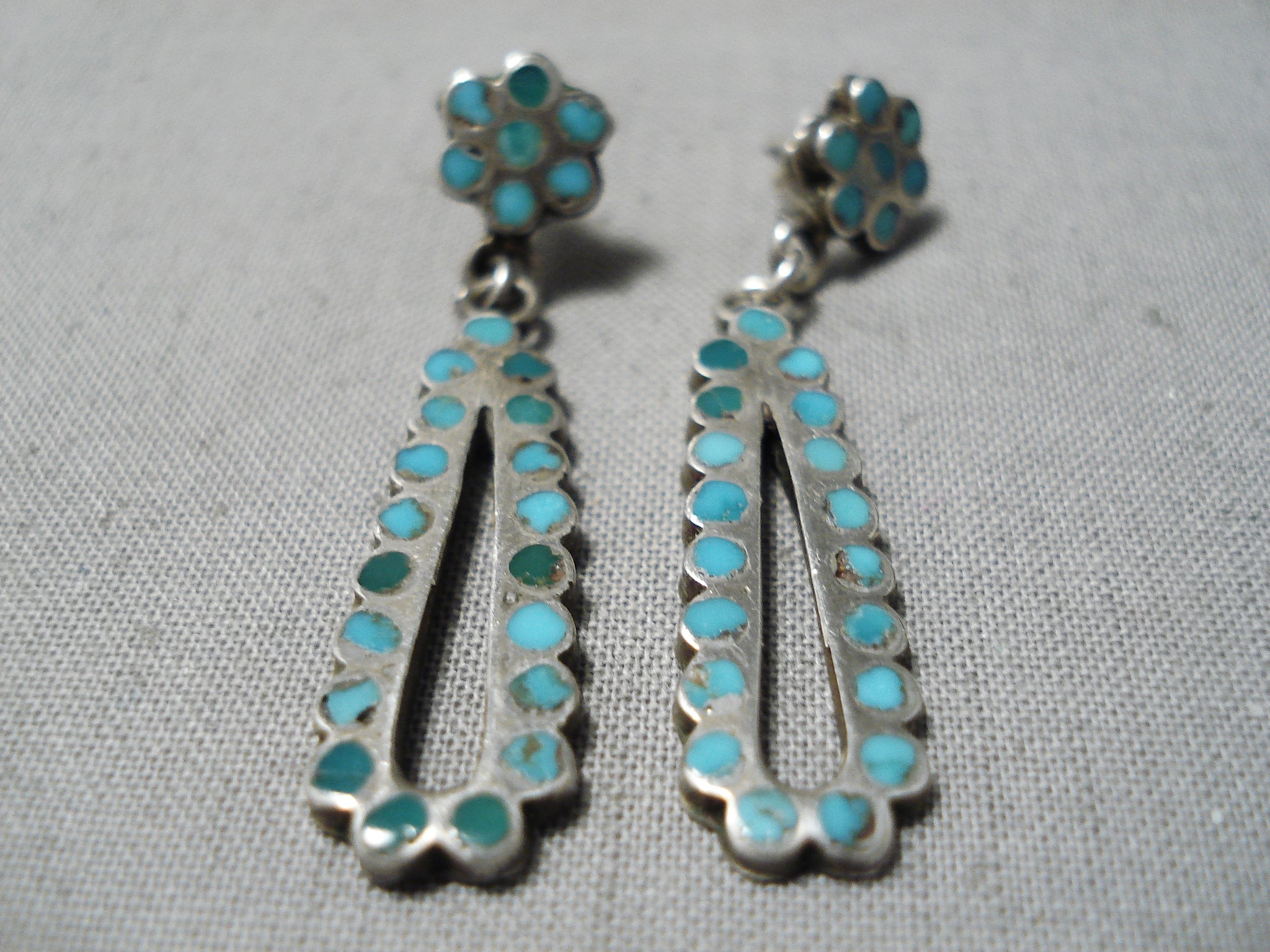 This is a superior vintage Zuni inlaid silver earrings. These earrings are very rare Dishta earrings and consist of remarkable inlaid snake eye turquoise stones. The inlay is perfect with a beautiful accenting inlaid flower inlay at the tops. Each earring measures around 1-3/4" X 3/8". Sterling silver. Cir. 1930's/ 40's. The earrings weigh around 4 grams.