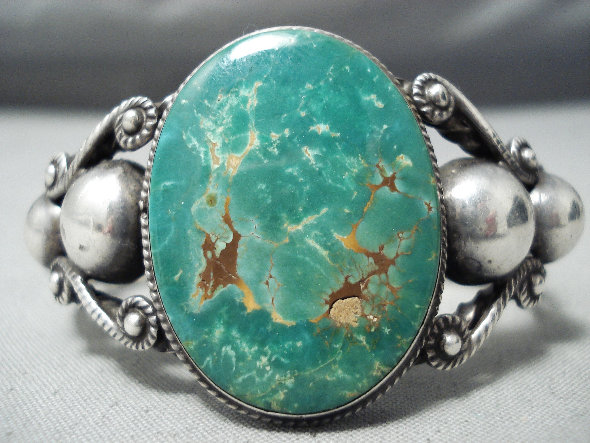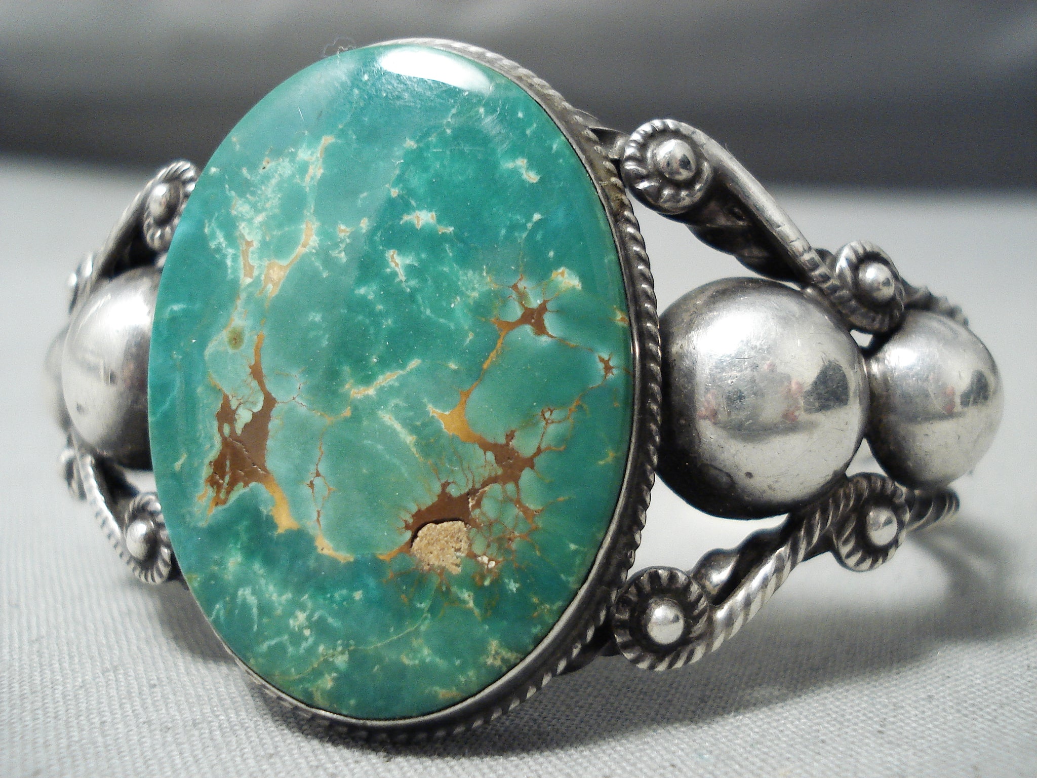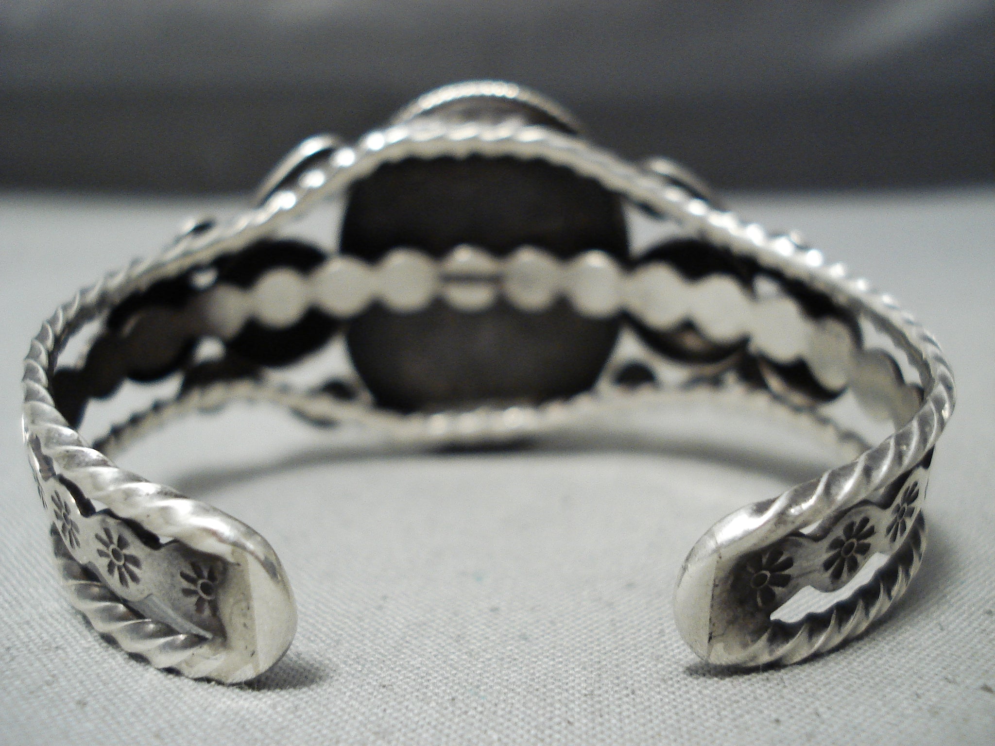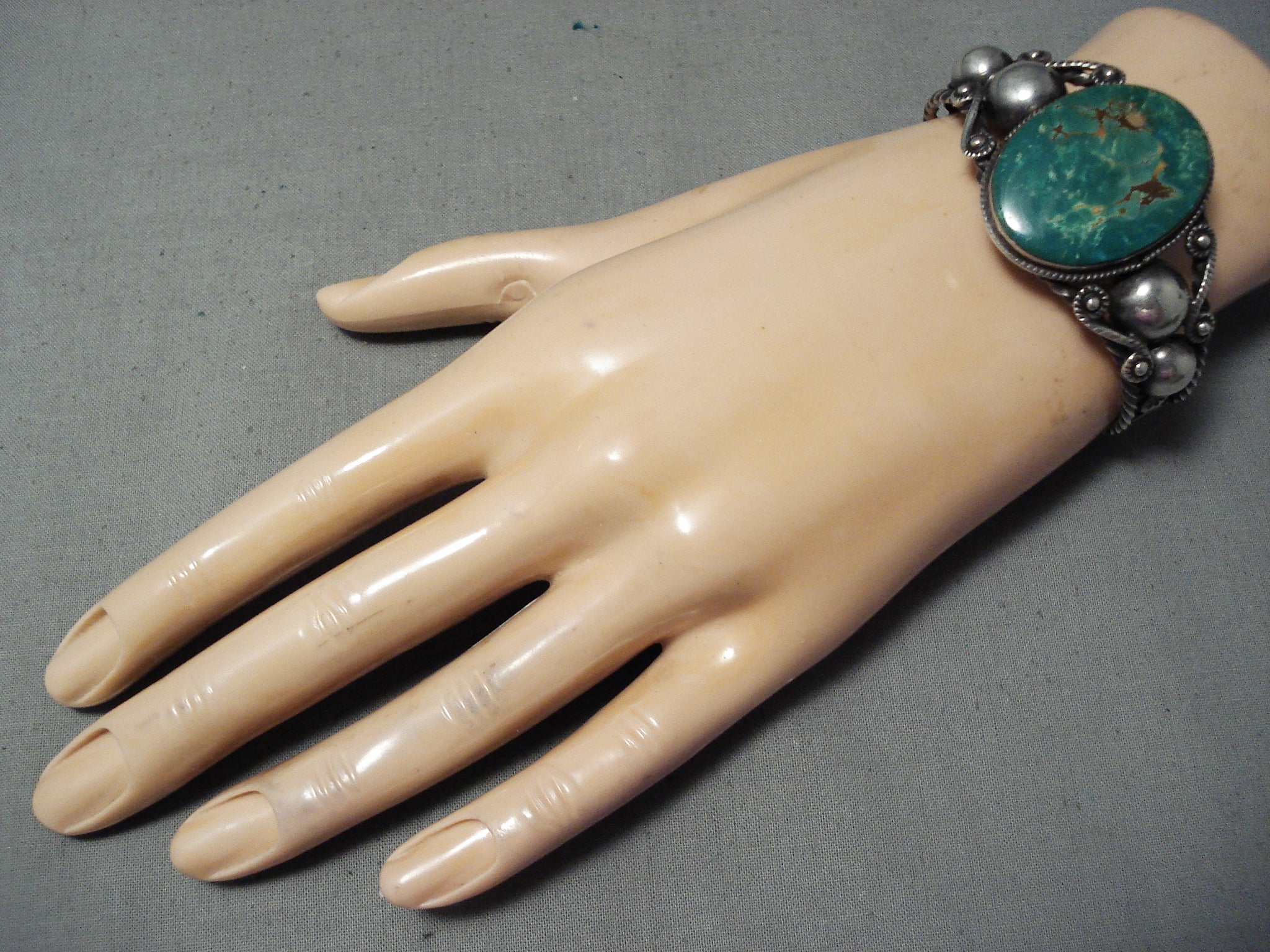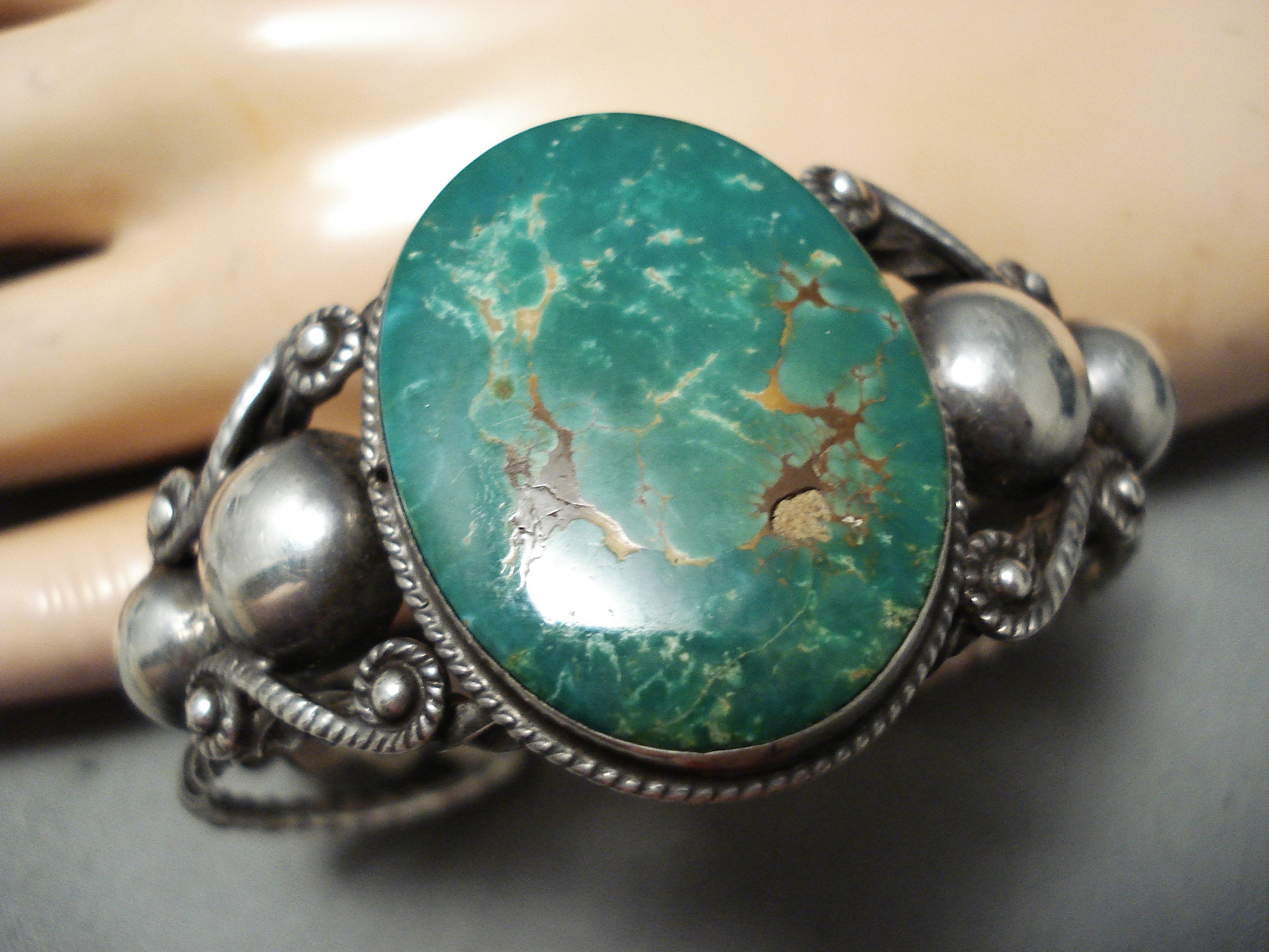 This is a fabulous vintage Navajo single stone silver bracelet. This outstanding piece contains a wonderful center dome shaped green coloration turquoise stone. The stone appears to be from the earlier Royston or Cerrillos turquoise mine. Surrounding the stone is a tight silver rope. Accenting the edges of the phenomenal triple silver shank cuff are unique and amazing silver swirling "s" patterns with large silver raindrops. What I also love about this bracelet is that remarkable center shank, it is absolutely unique with its design being cloud shaped with sun stampings running down the ends. The center stone measures around 1-1/4" x 1". The width of the bracelet measures around 1-1/8". Sterling silver, marked. Cir. 1930's+. The inside end to end measures around 5-1/2" with an additional 3/4" gap. Sturdy 31 grams.