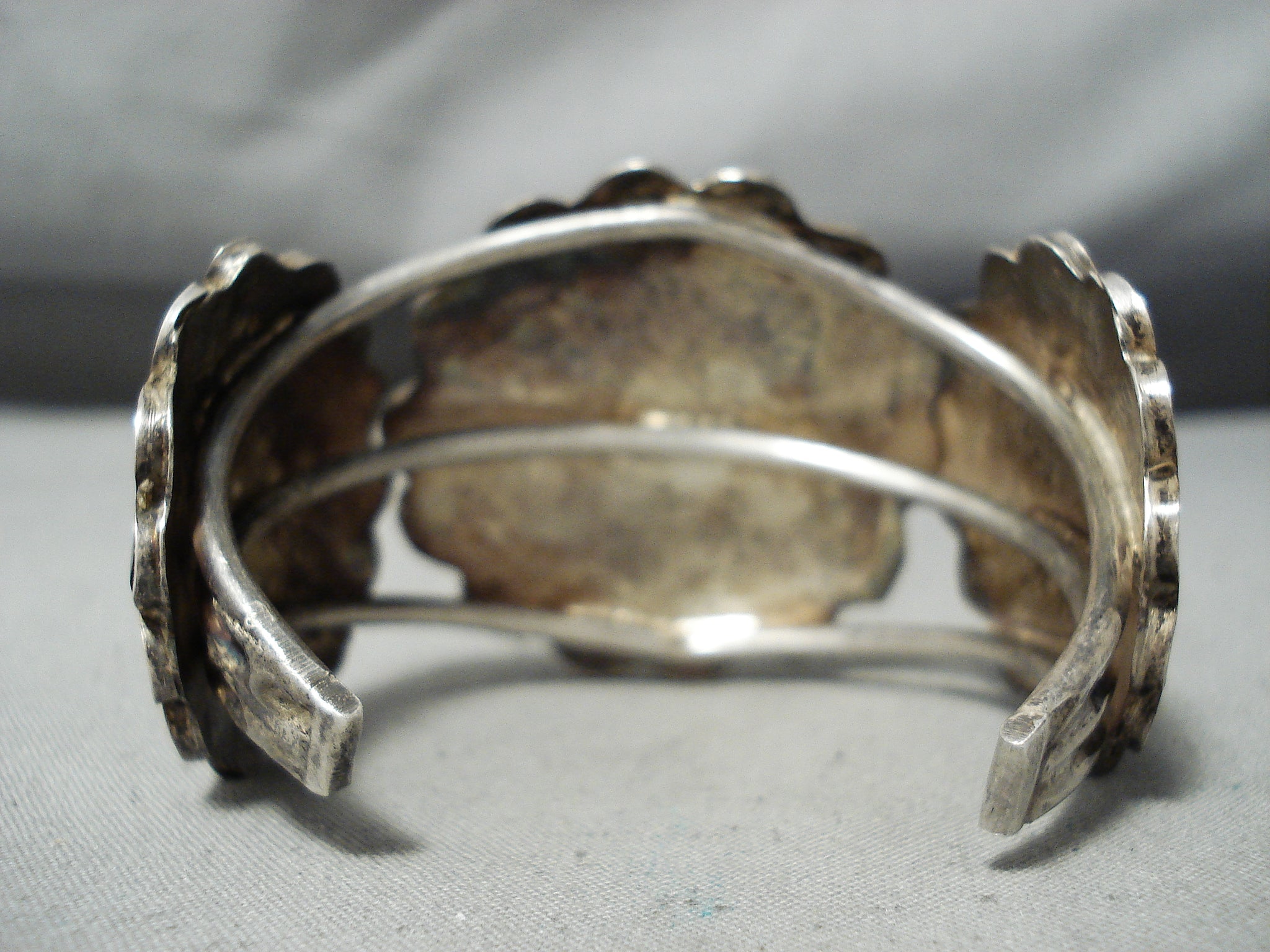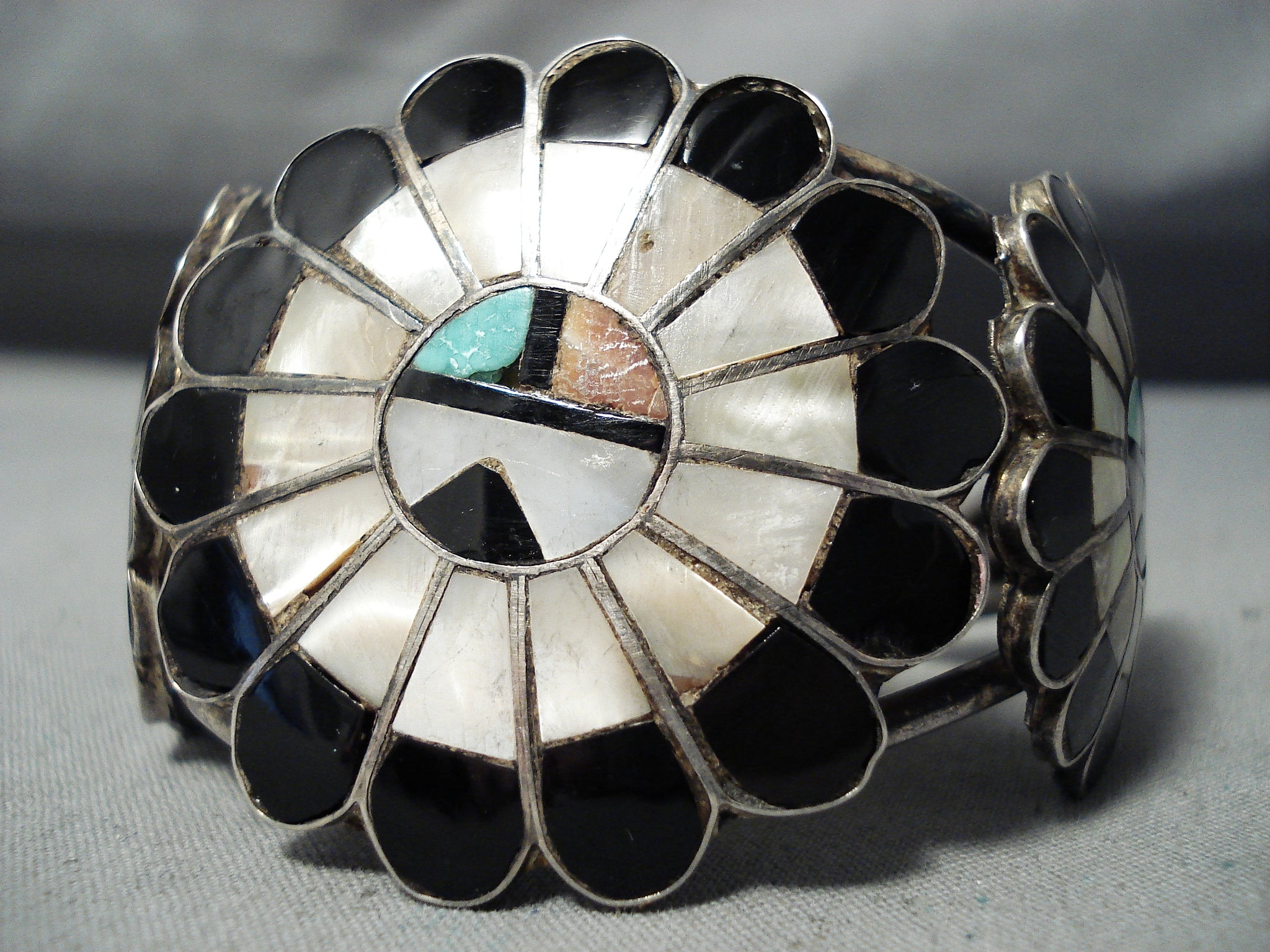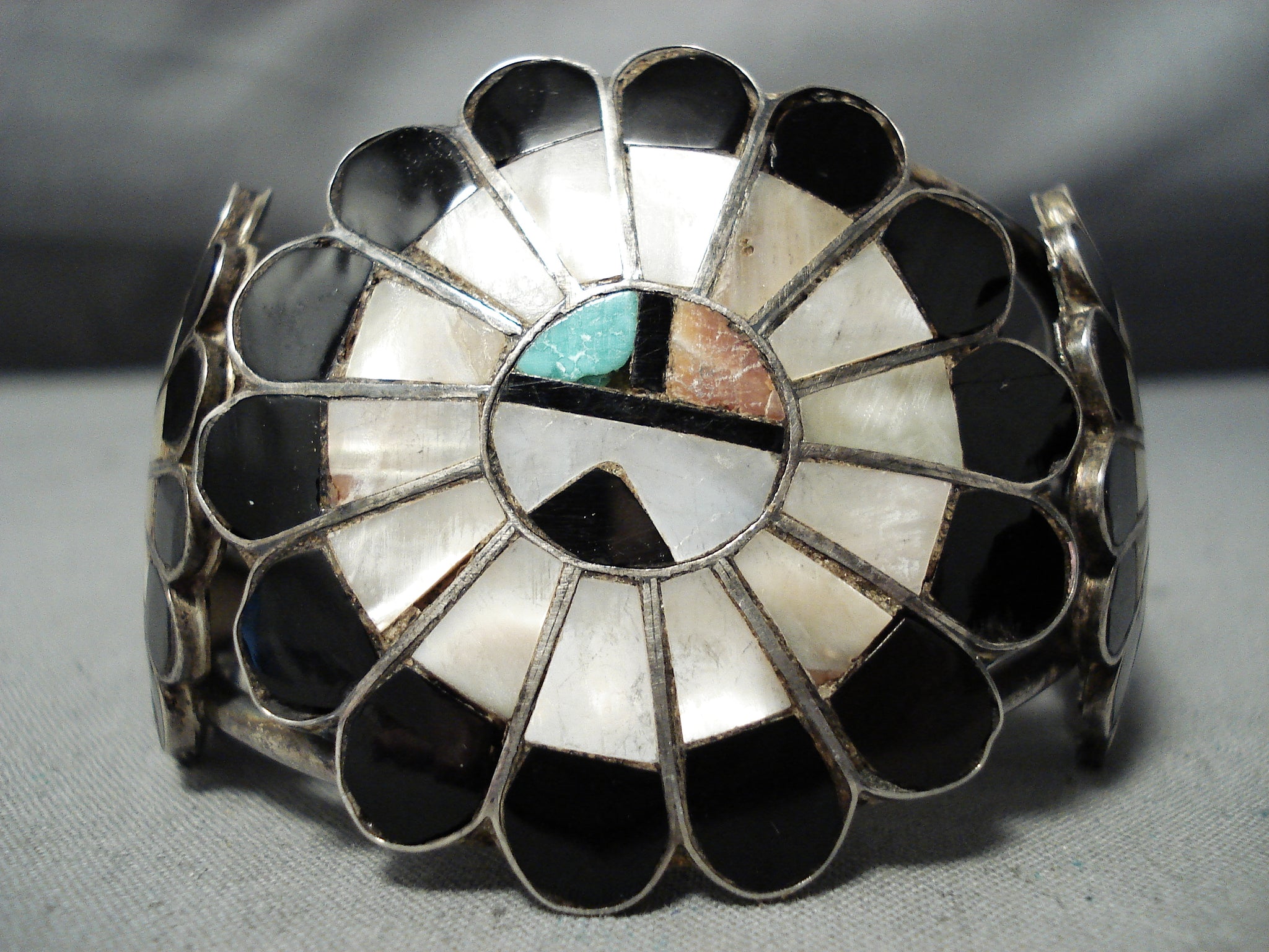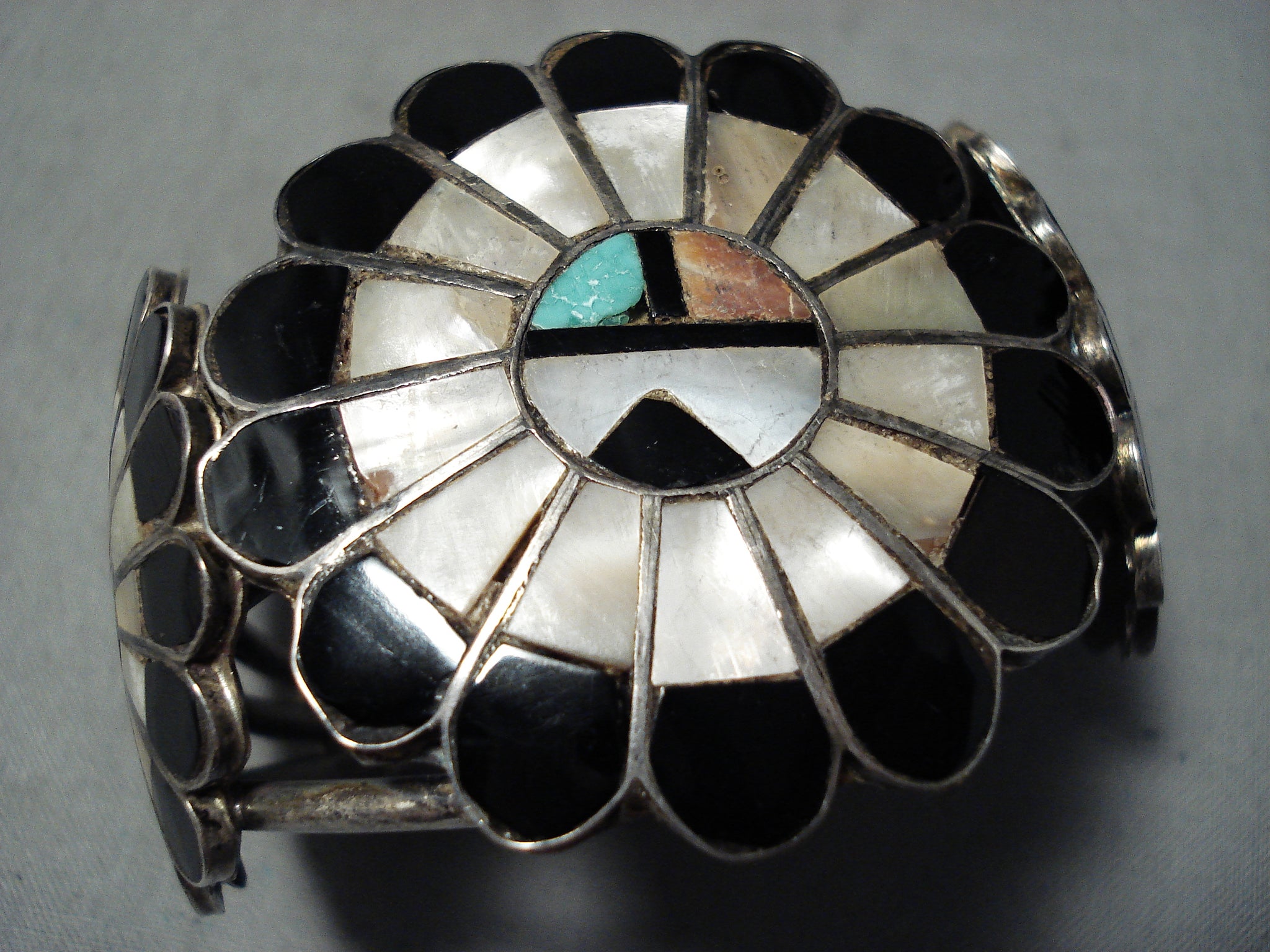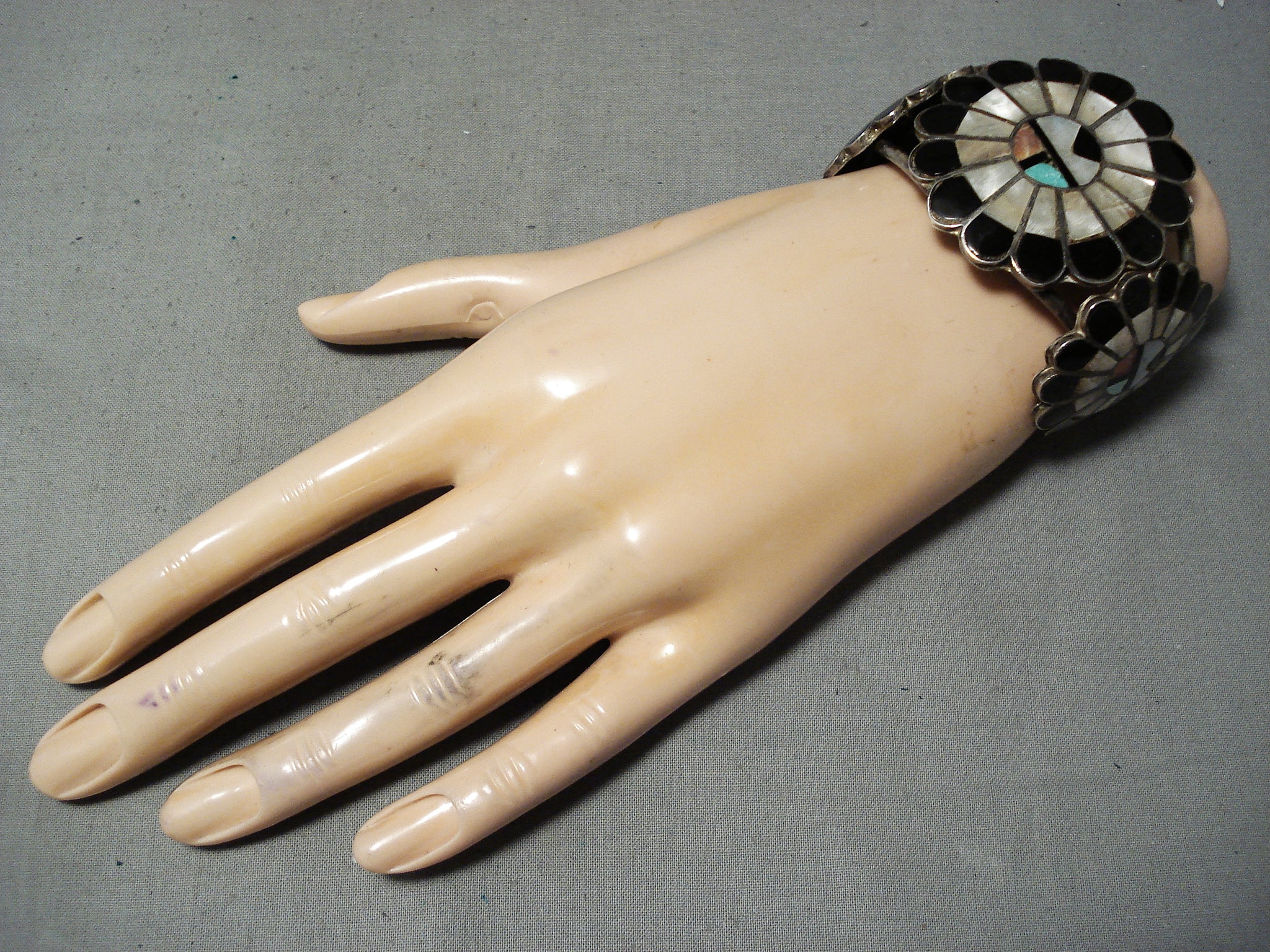 Early Huge Vintage Native American Zuni Turquoise Sterling Silver Inlay Bracelet