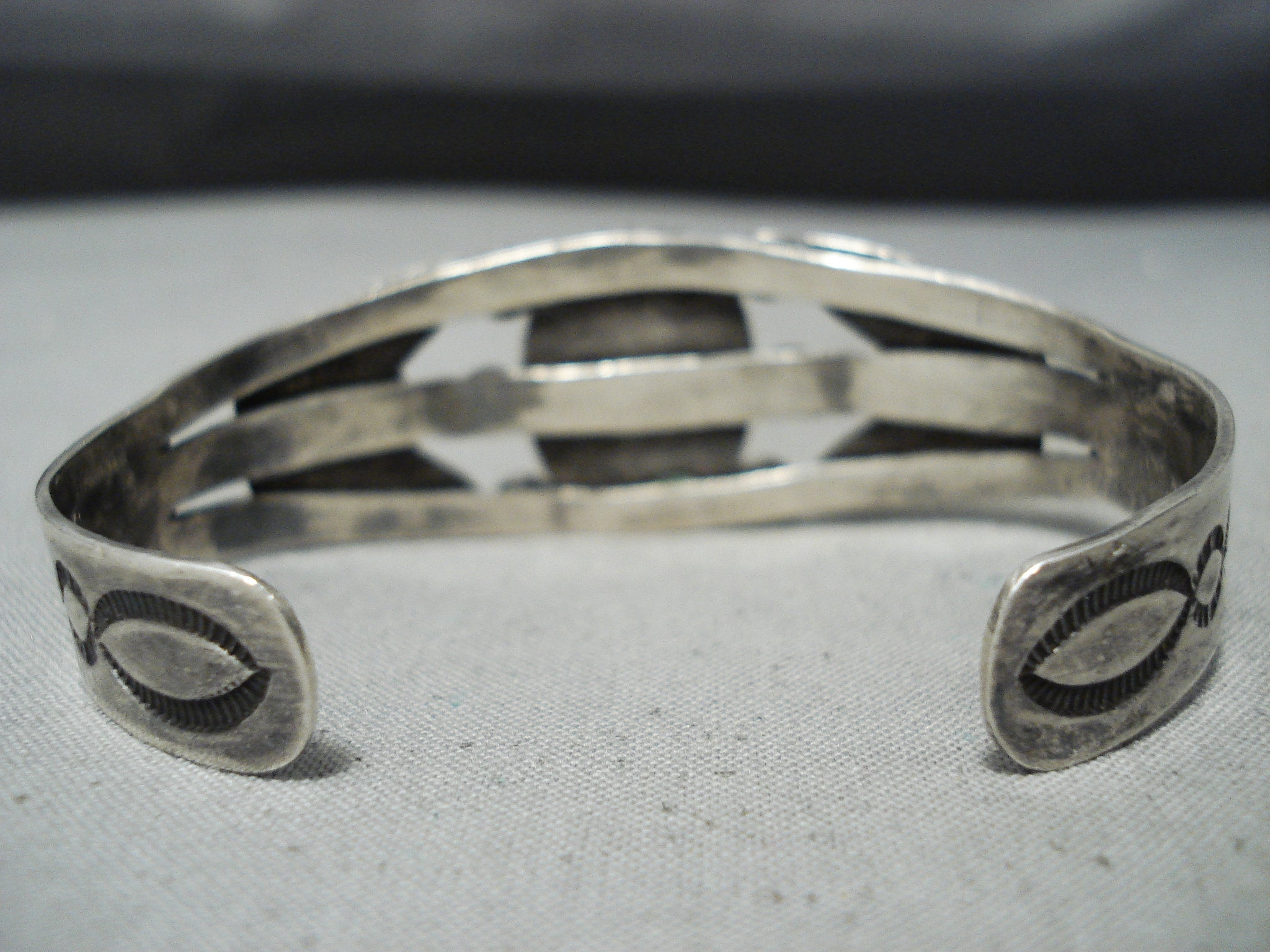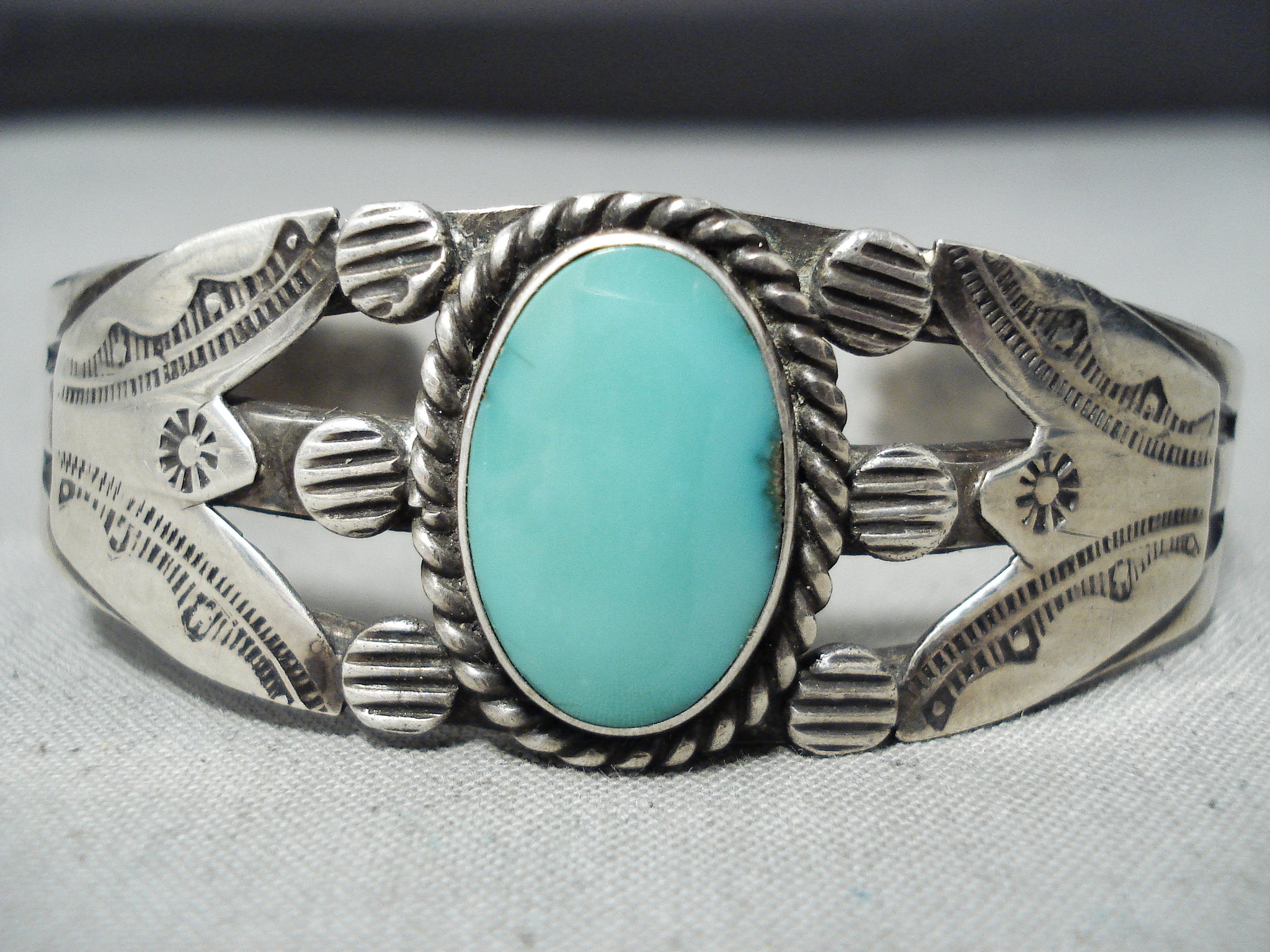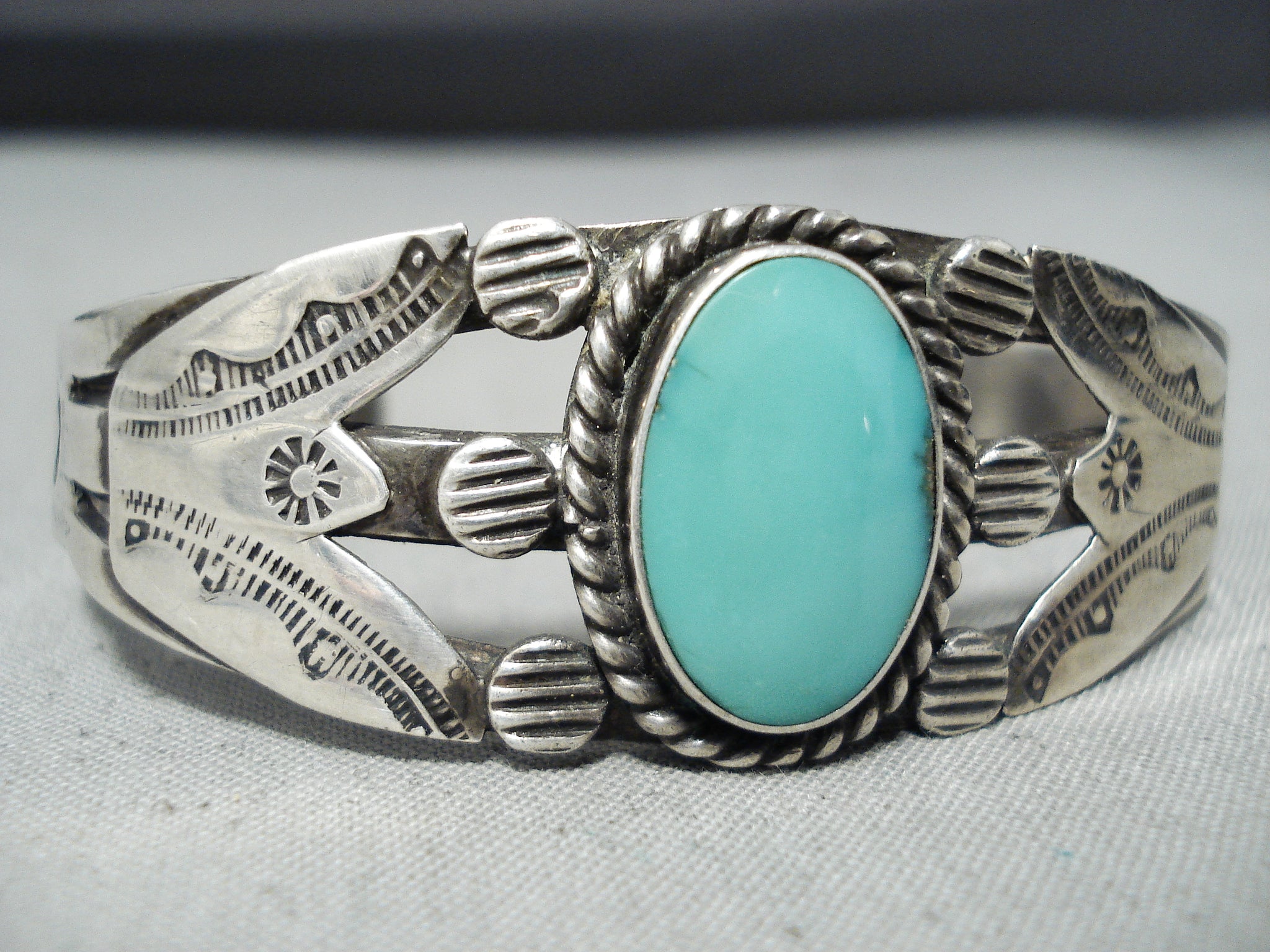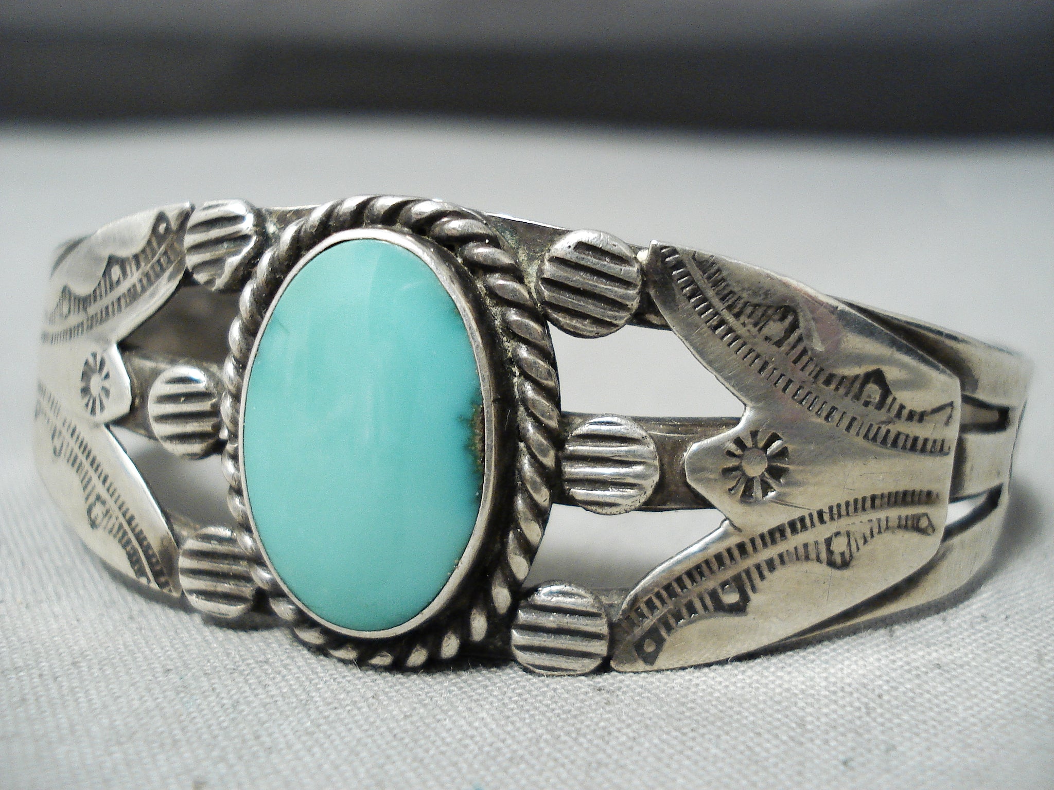 Early Vintage Native American Navajo Turquoise Sterling Silver Flank Bracelet Old
