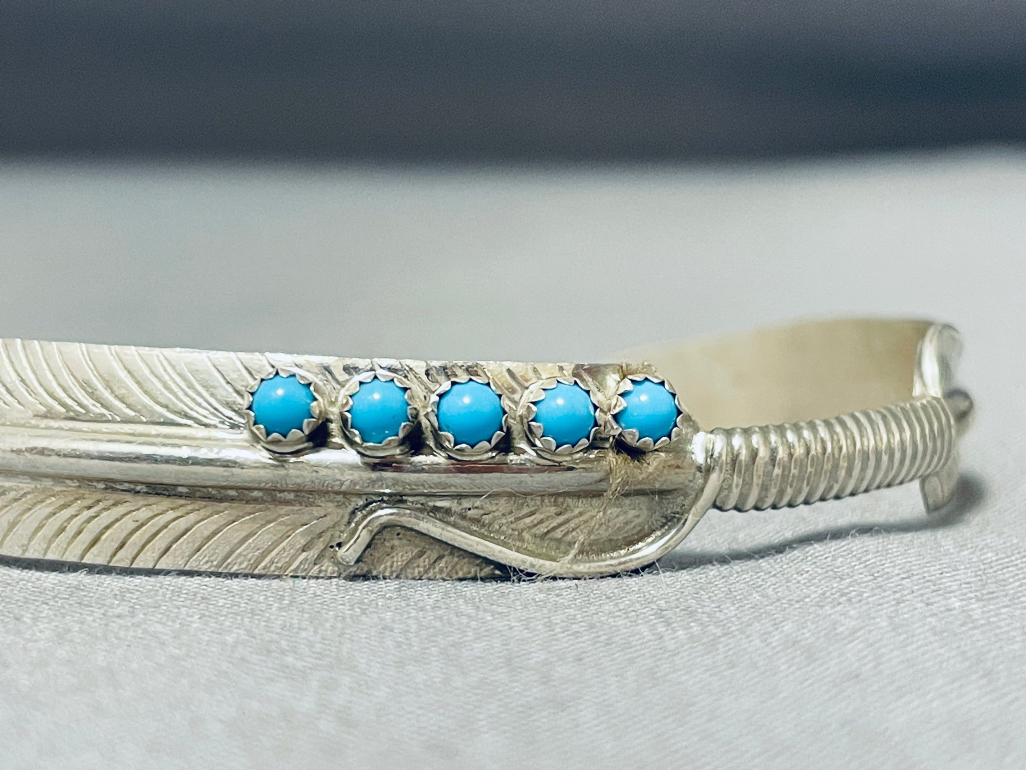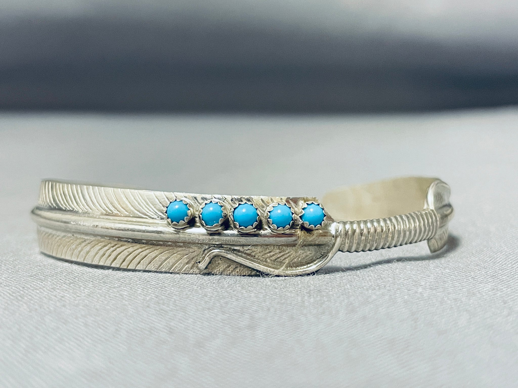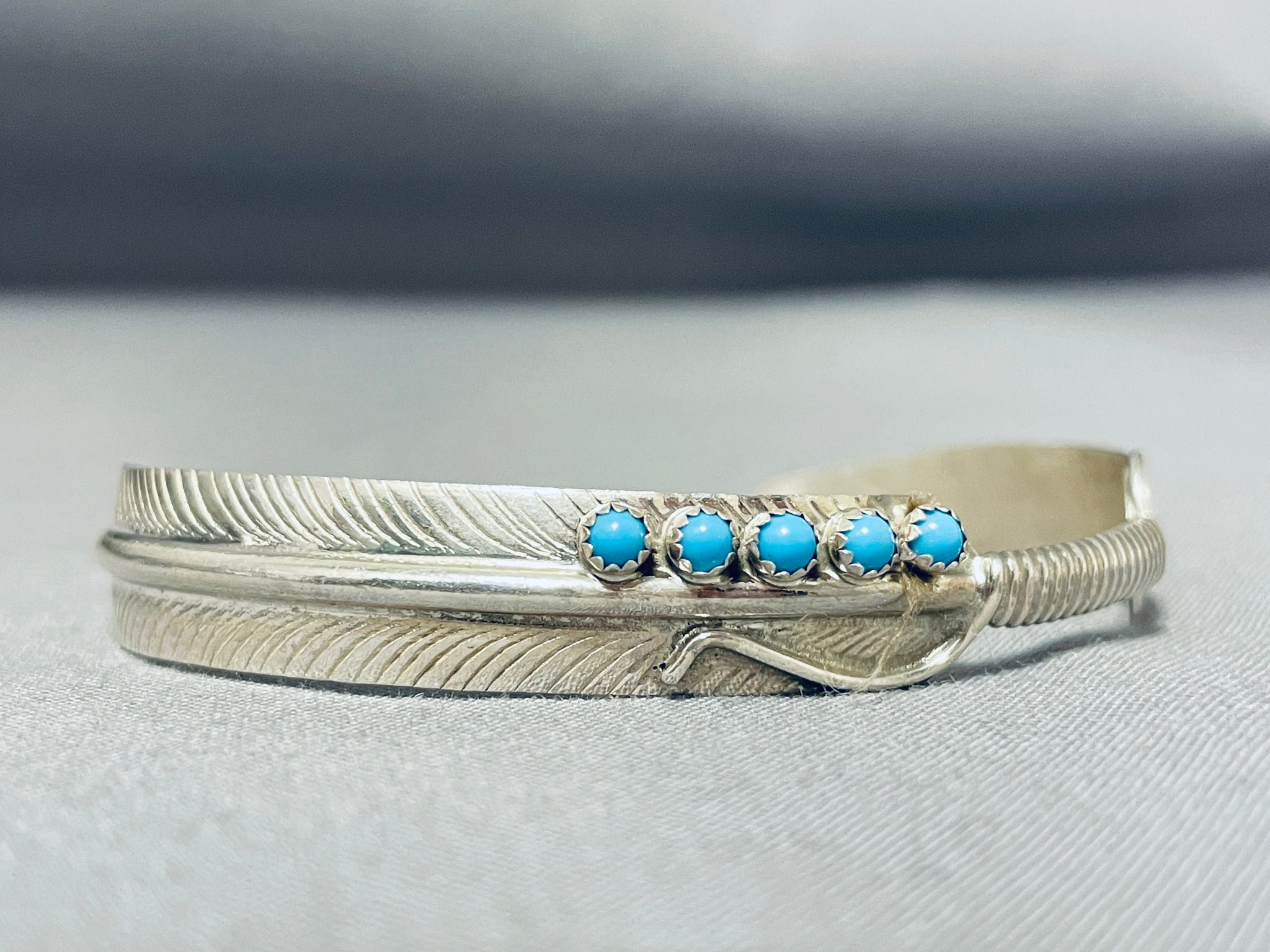 Elegant Native American Hopi Sleeping Beauty Turquoise Sterling Silver Feather Bracelet