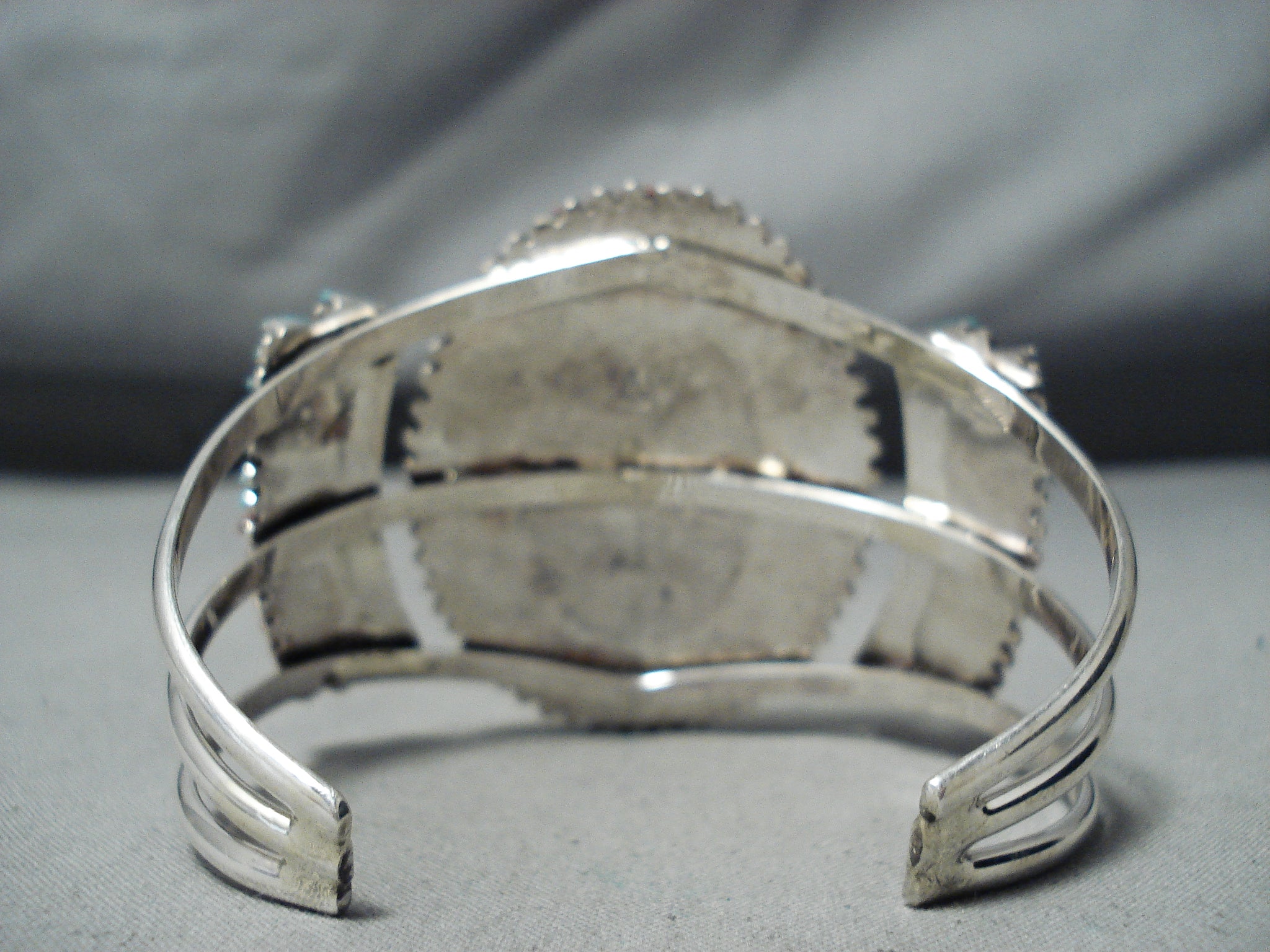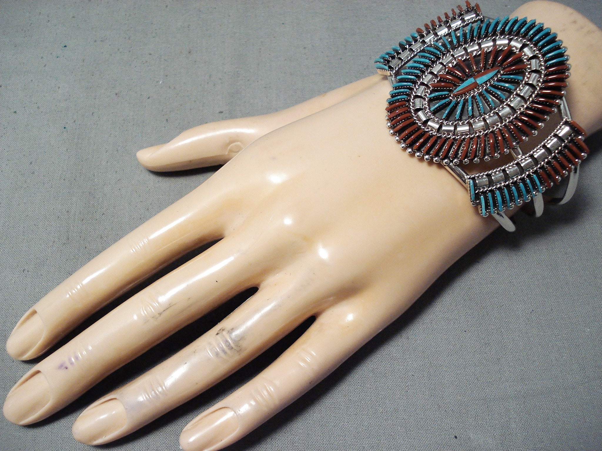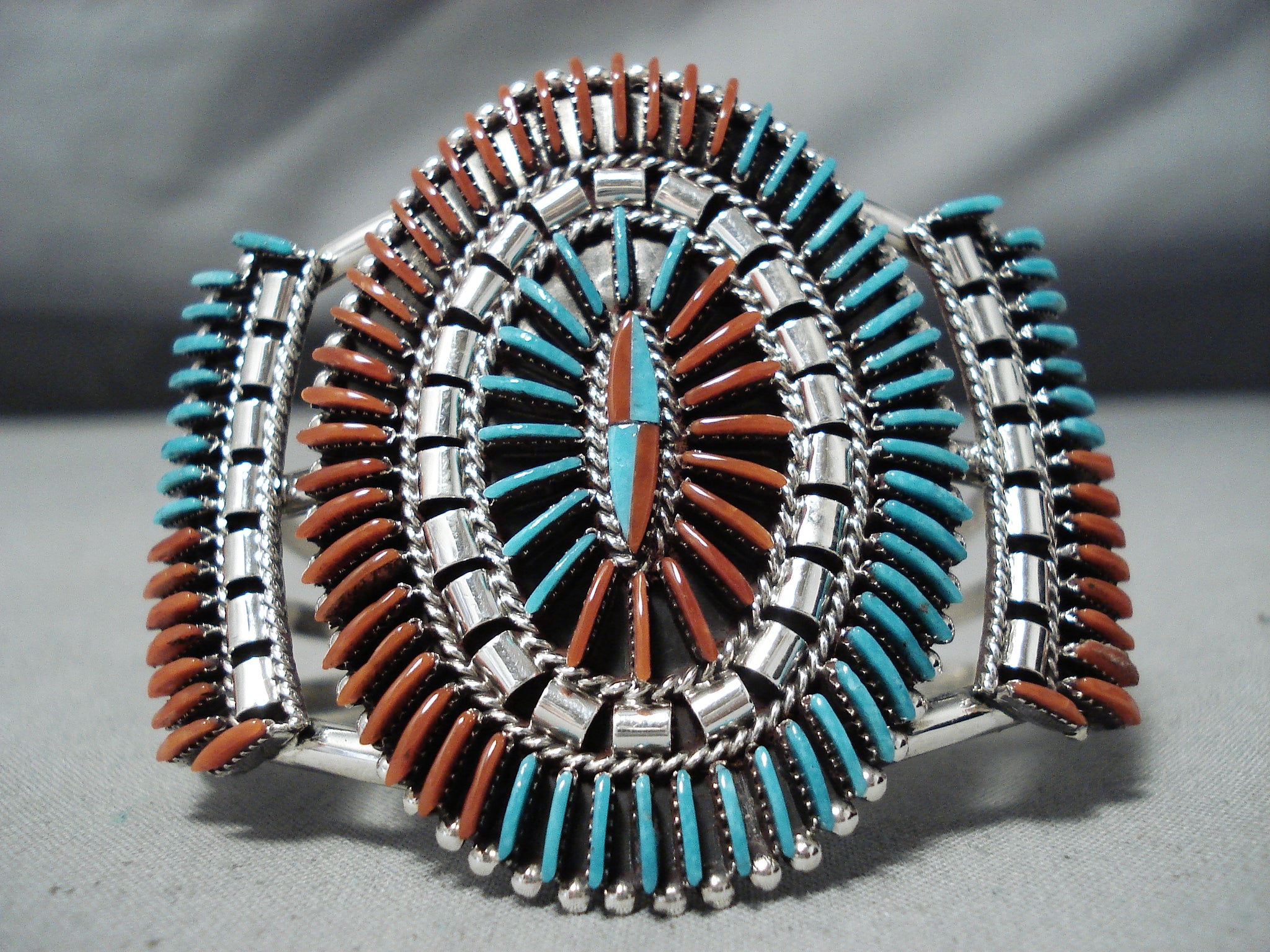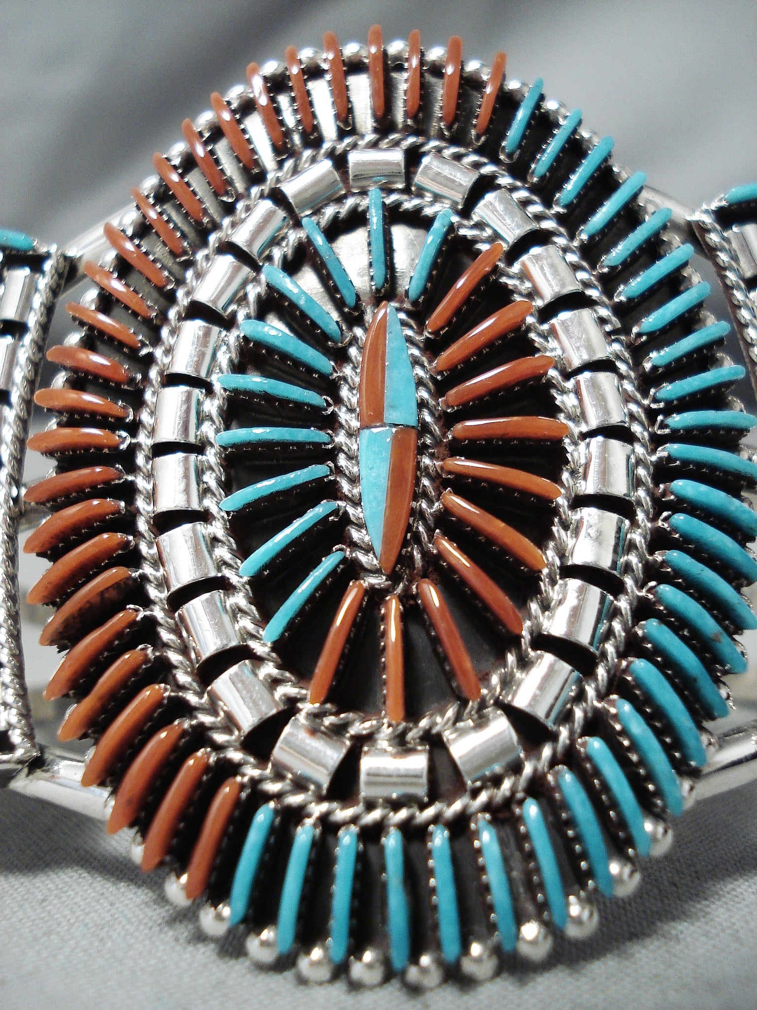 Enormous Native American Zuni Turquoise Coral Needlepoint Sterling Silver Bracelet