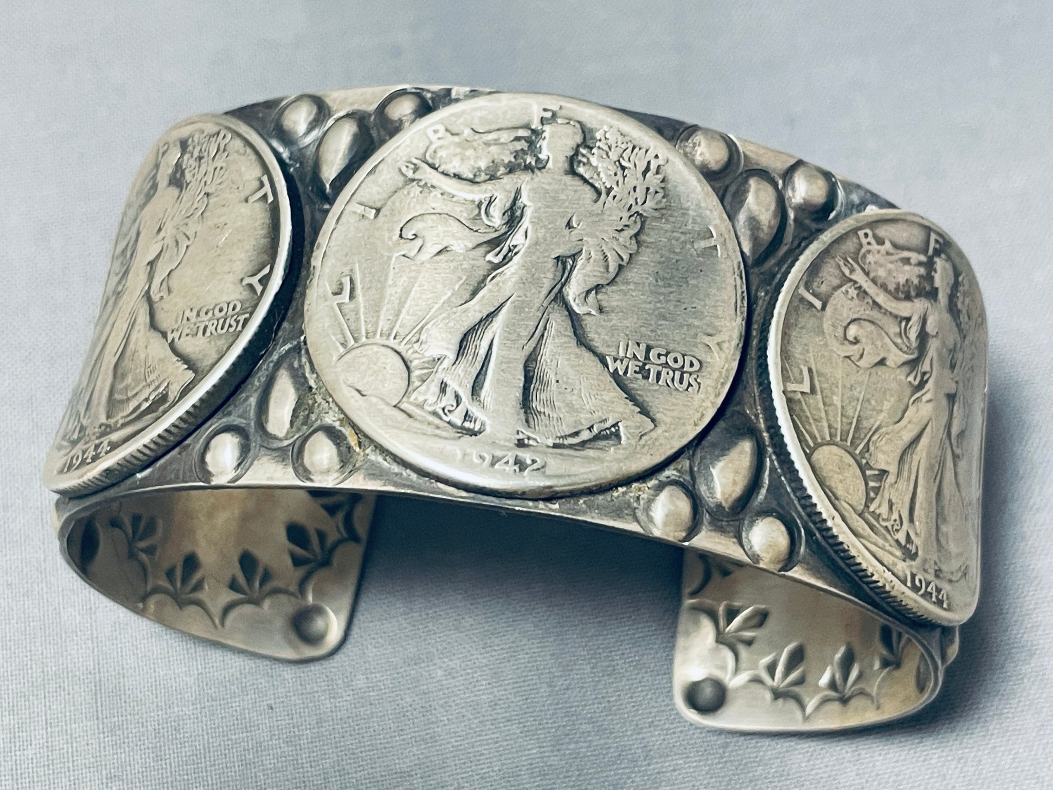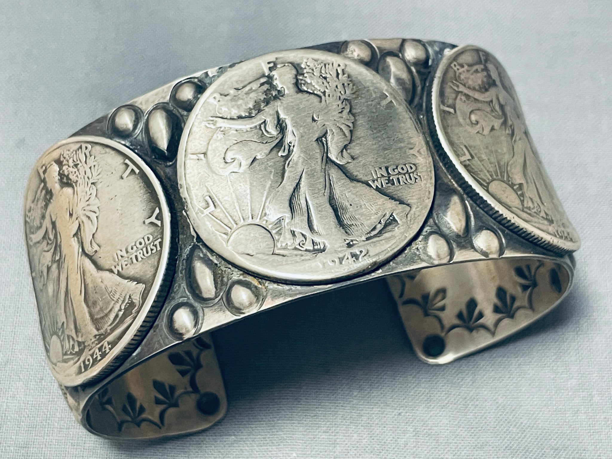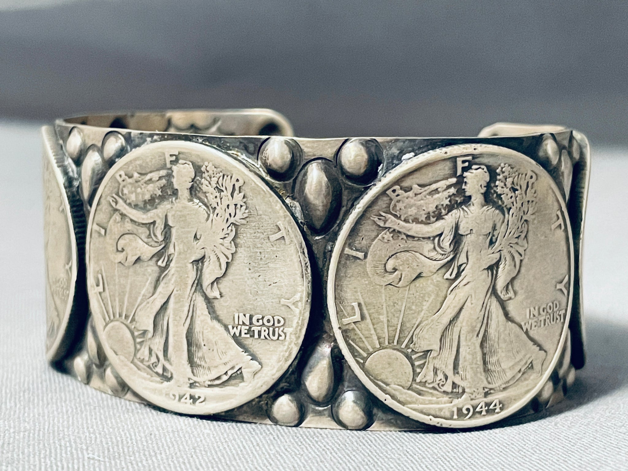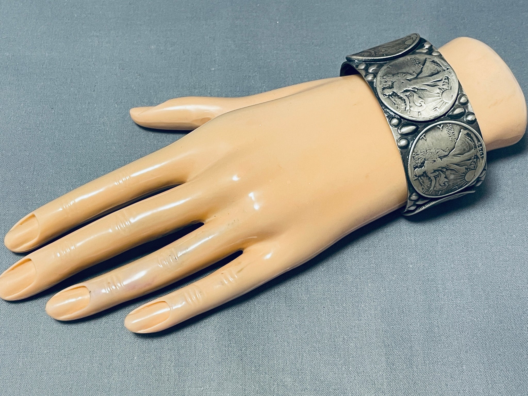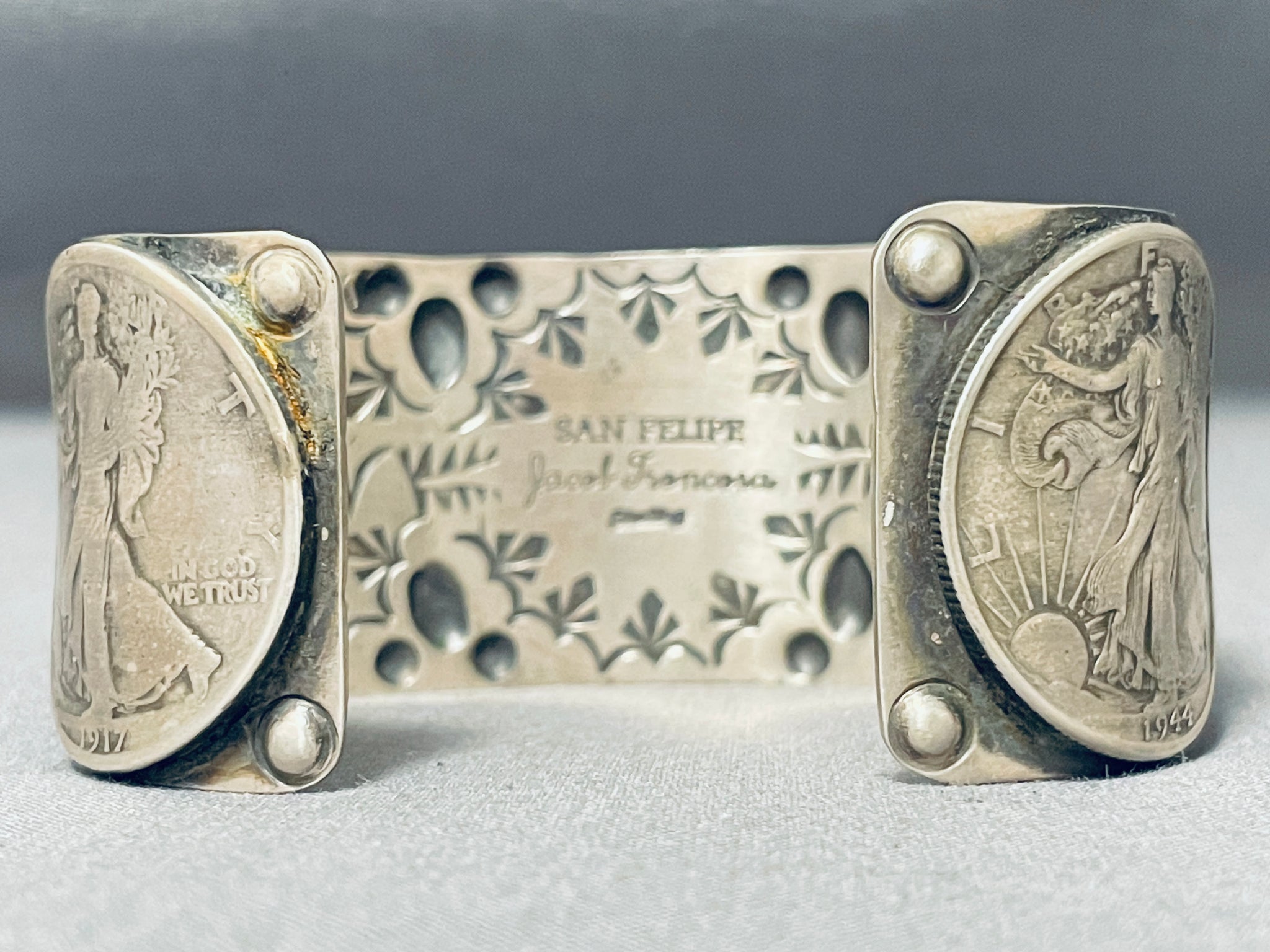 This is a superior San Felipe bracelet featuring 5 silver coins and silver beads, on a solid silver cuff with handstamping along the inside! Truly Striking! The width of the bracelet measures around 1-1/4". Signed by San Felipe artist, Jake Francosa. Sterling silver, marked. The inside end to end measures around 6" with an additional 1-1/8" gap. Sturdy 102 grams.