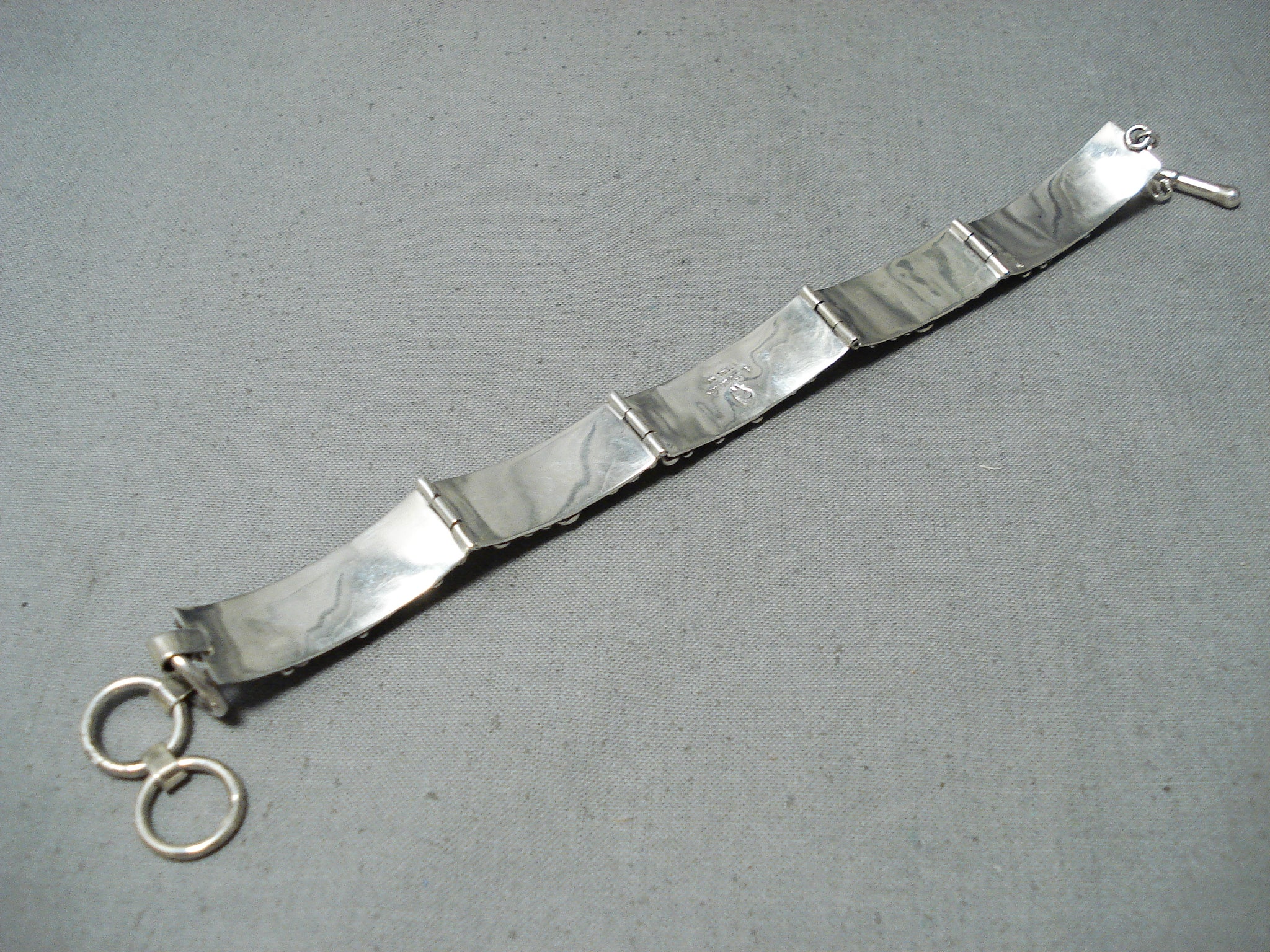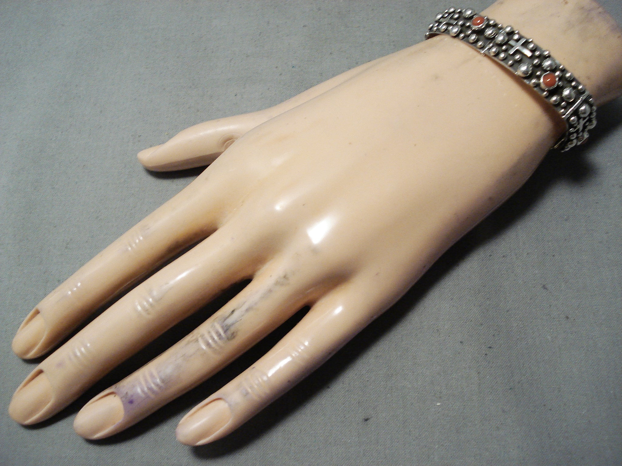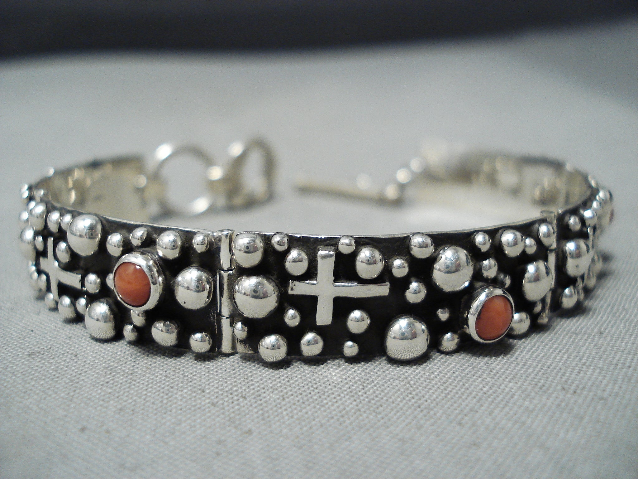 Exceptional Native American Navajo Coral Sterling Silver Cross Hinged Bracelet