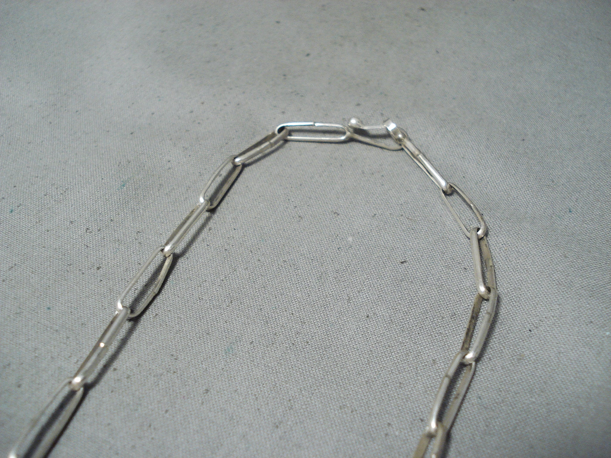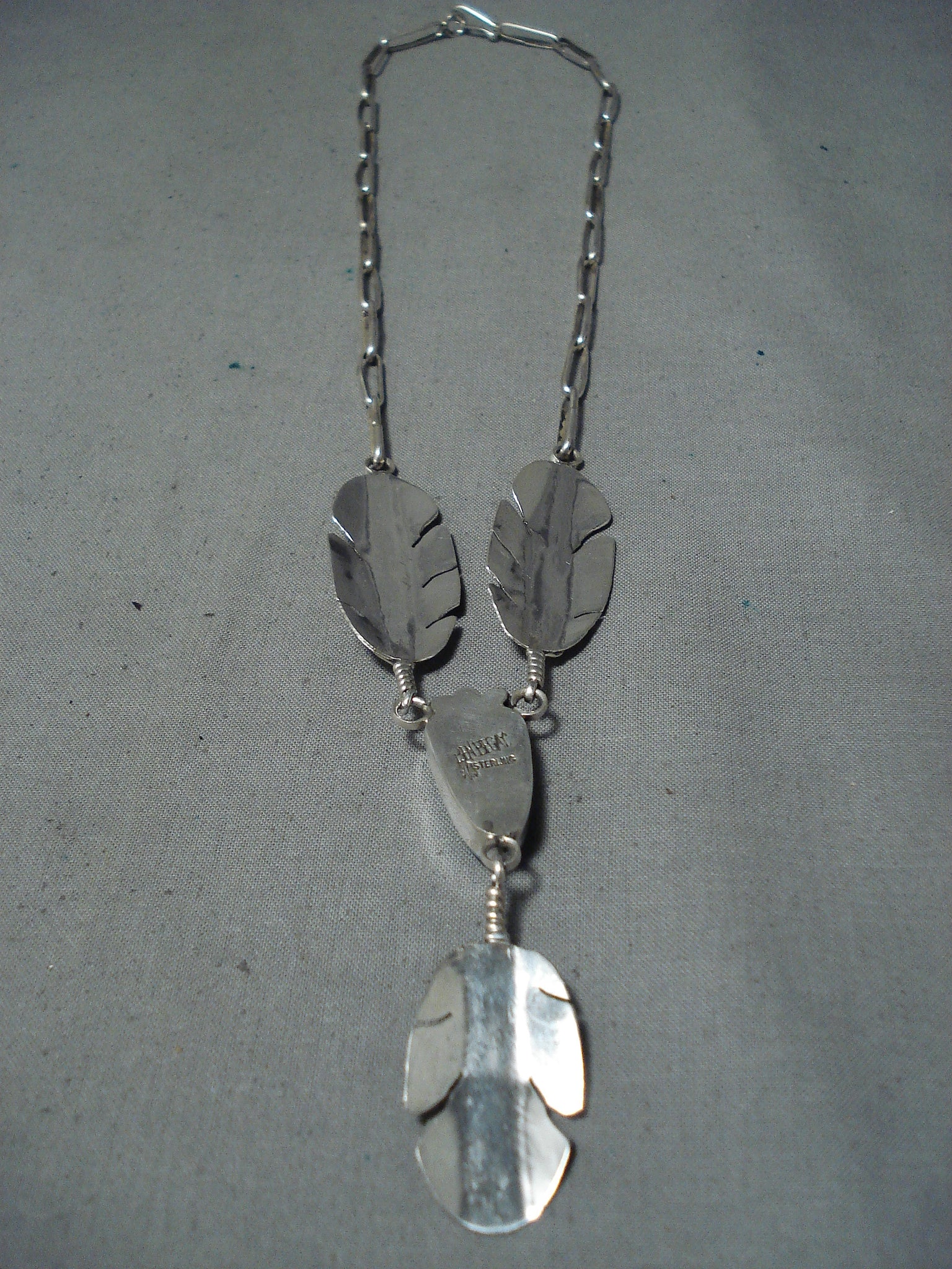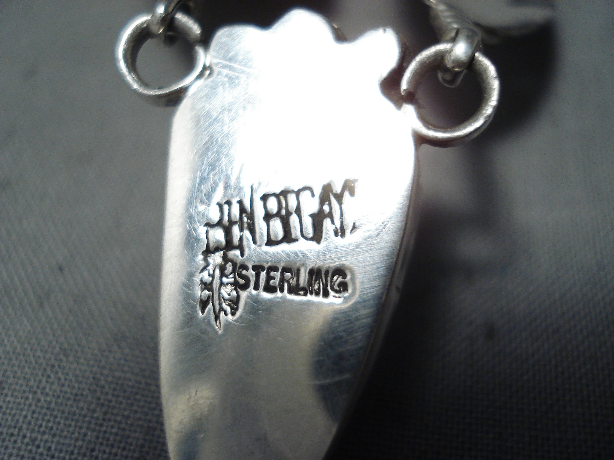 We are proud to offer this marvelous Navajo silver necklace having a Kingman turquoise pendant and 3 handcarved silver feather pendants on a silver chain with oblong handcarved silver links and a handmade silver hook and eye clasp! Truly Impressive! The turquoise pendant measures about 7/8" x 1/2". The largest silver feather pendant measures around 1-3/4" x 3/4". Sterling silver, marked. Signed by Navajo artist, Ben Begaye. The length of the necklace measures around 24". Sturdy 27 grams.