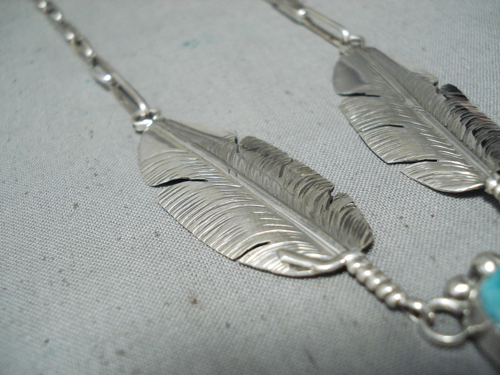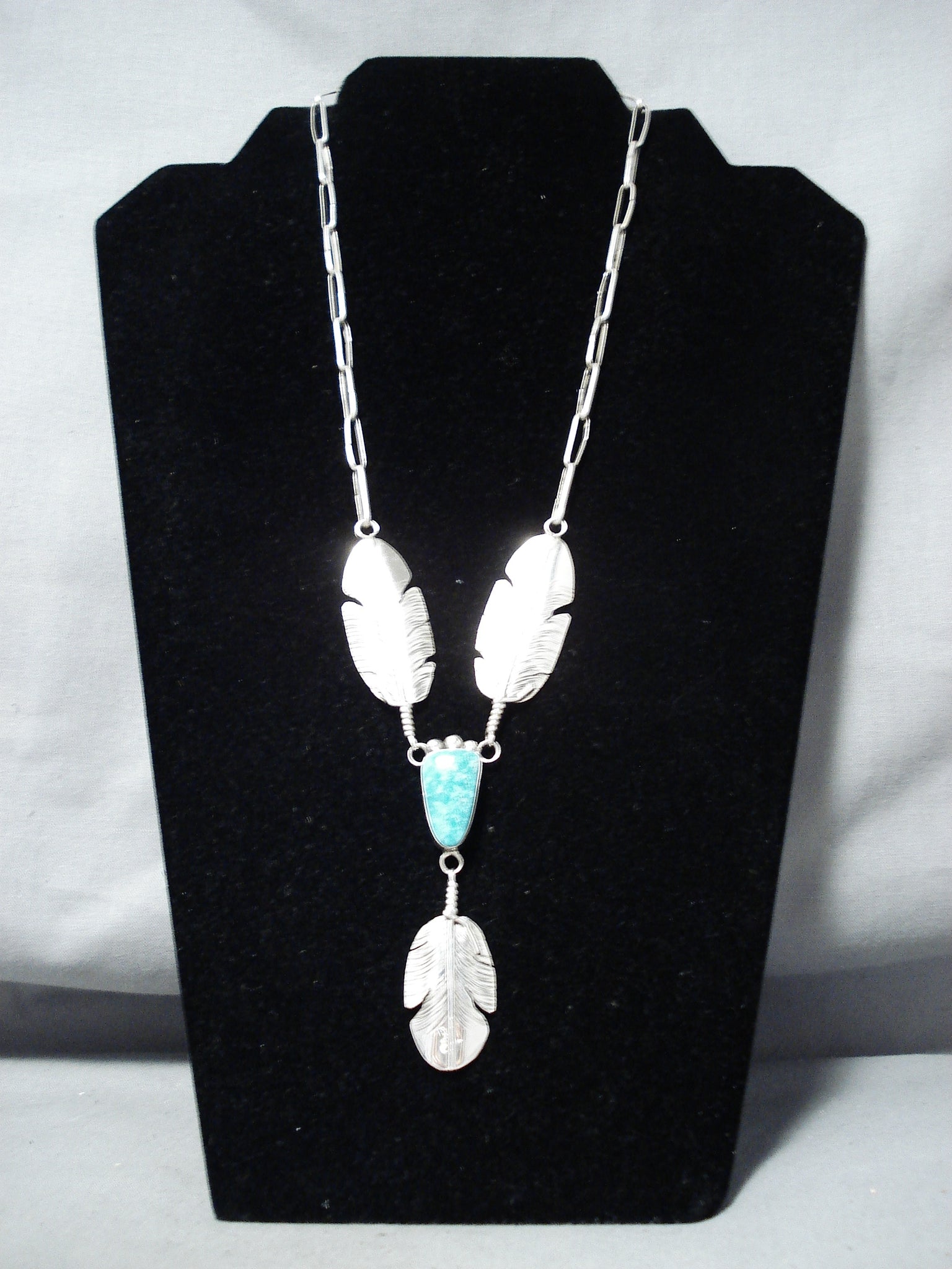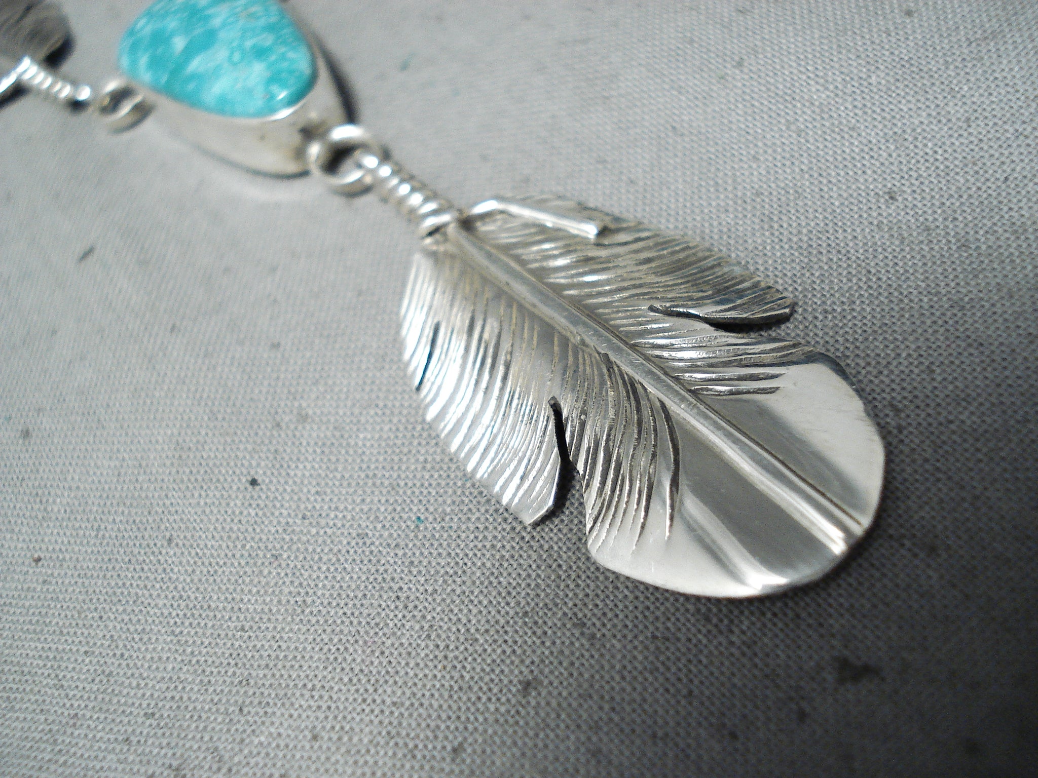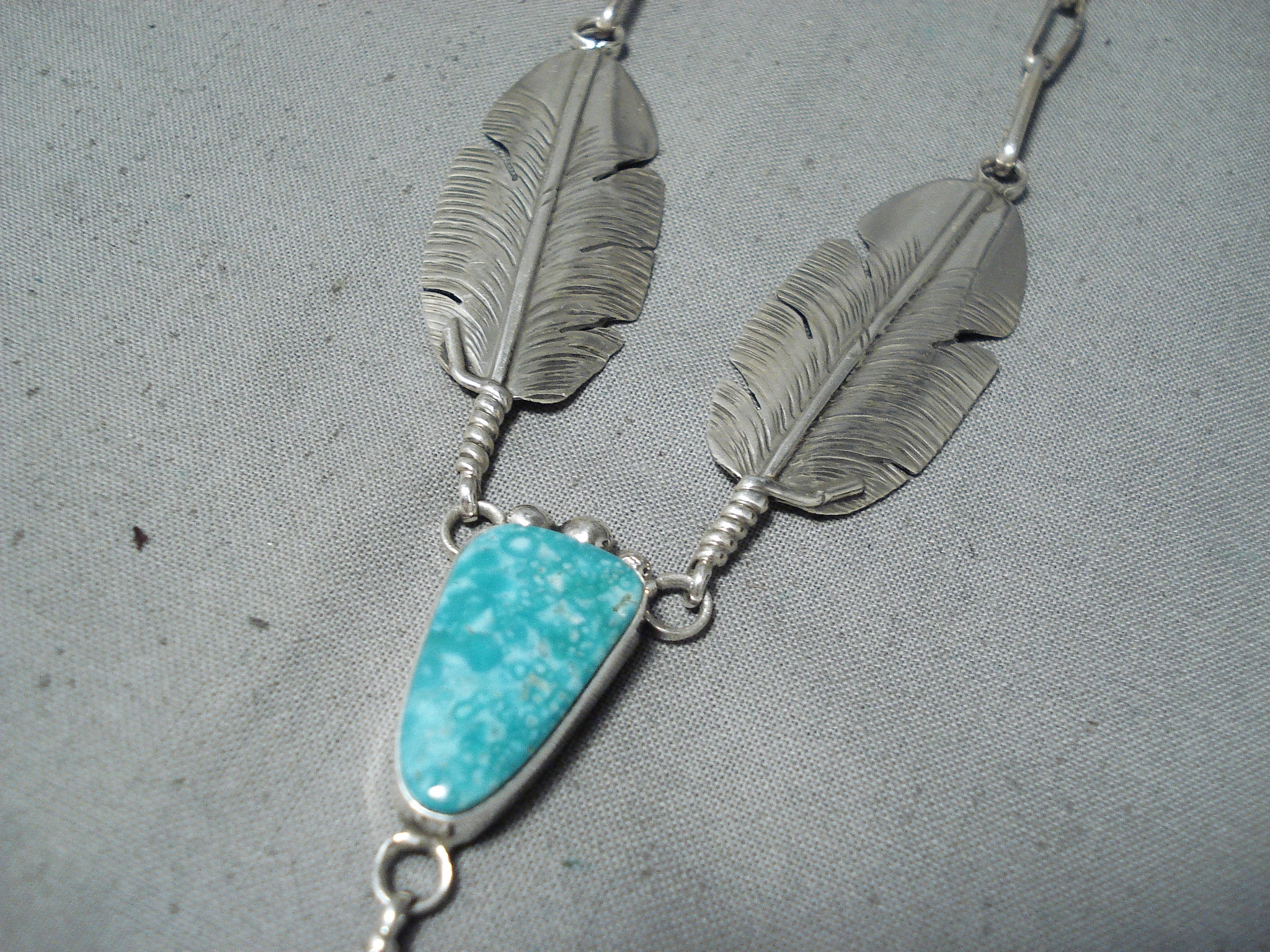 Exceptional Native American Navajo Kingman Turquoise Sterling Silver Feather Necklace