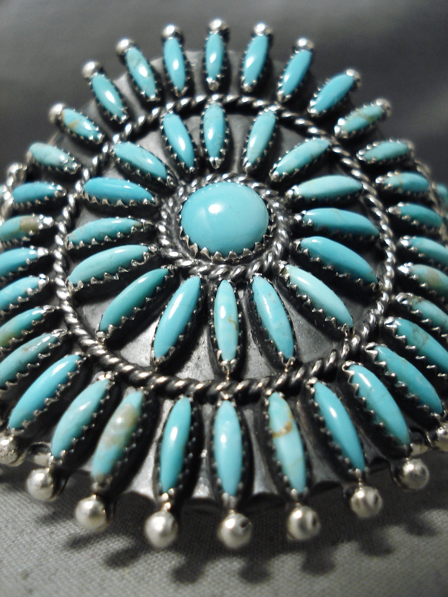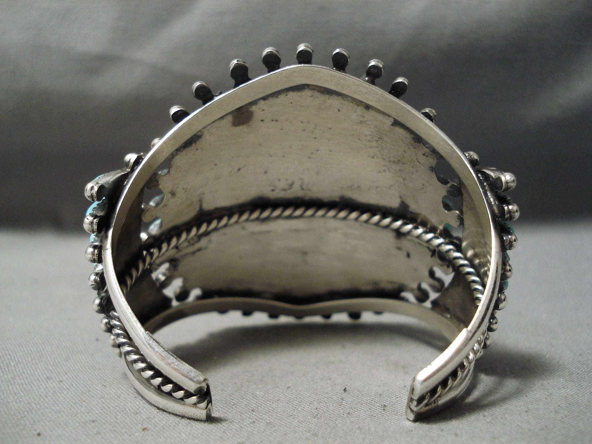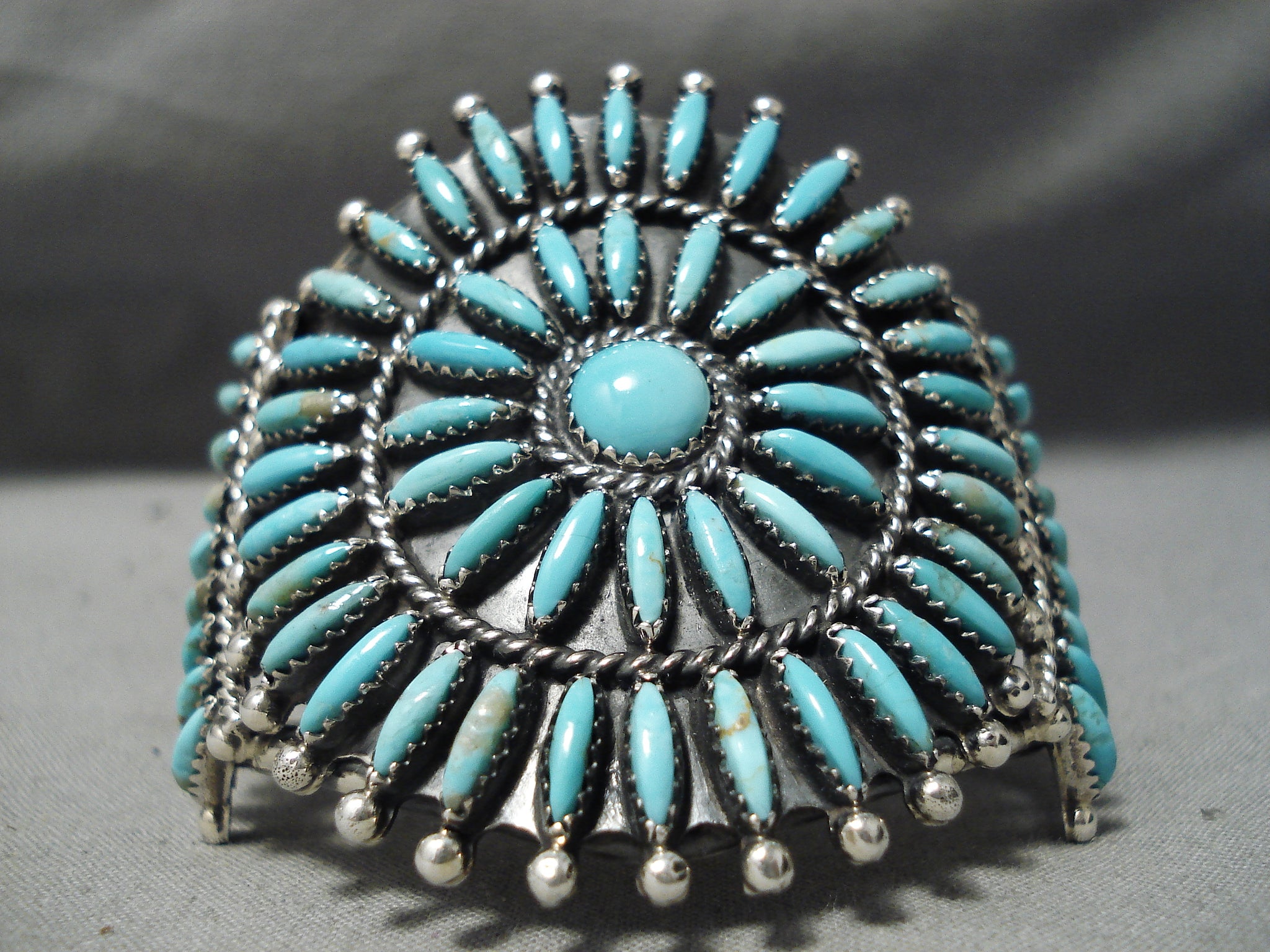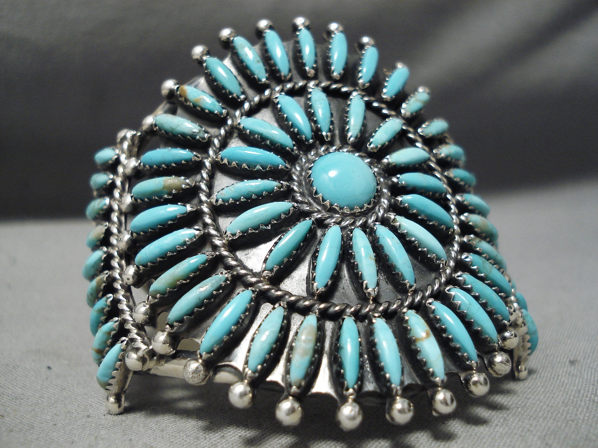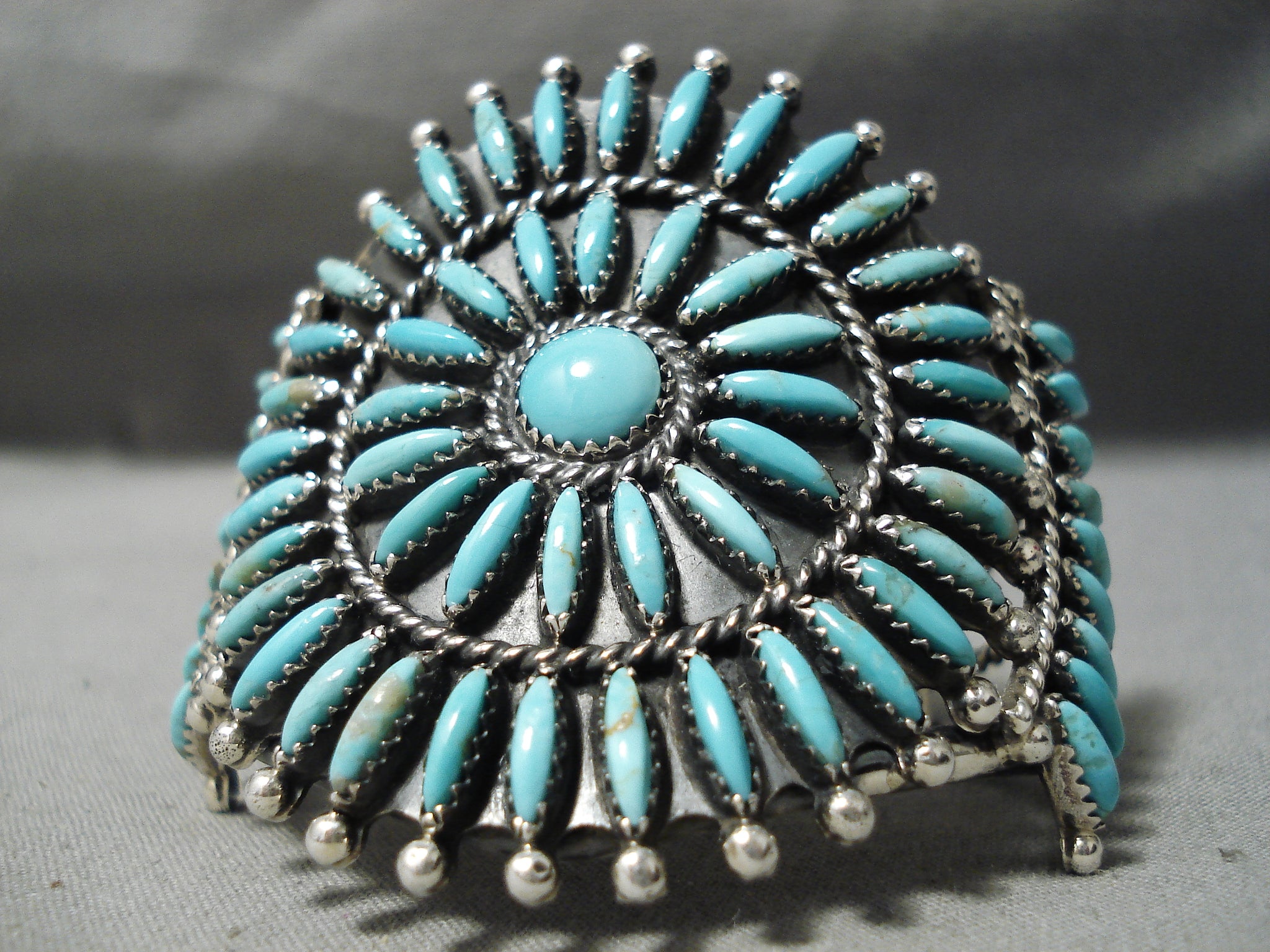Up for sale is this wonderful Navajo silver bracelet. This traditional, wide bracelet is a wonderful arrangement of 65 impressive southwestern sky blue elongated turquoise stones as they’re arranged in perfect balance around the 5/16” center turquoise round. Silver rope and beads separate and accent the concentric circles and satellite stations. The center stone measures around 5/16" x 5/16". The width of the bracelet measures around 2-1/4". Sterling silver, marked. The inside end to end measures around 4-7/8" with an additional 1" gap. Sturdy 50 grams. Cir. Mid to late century.