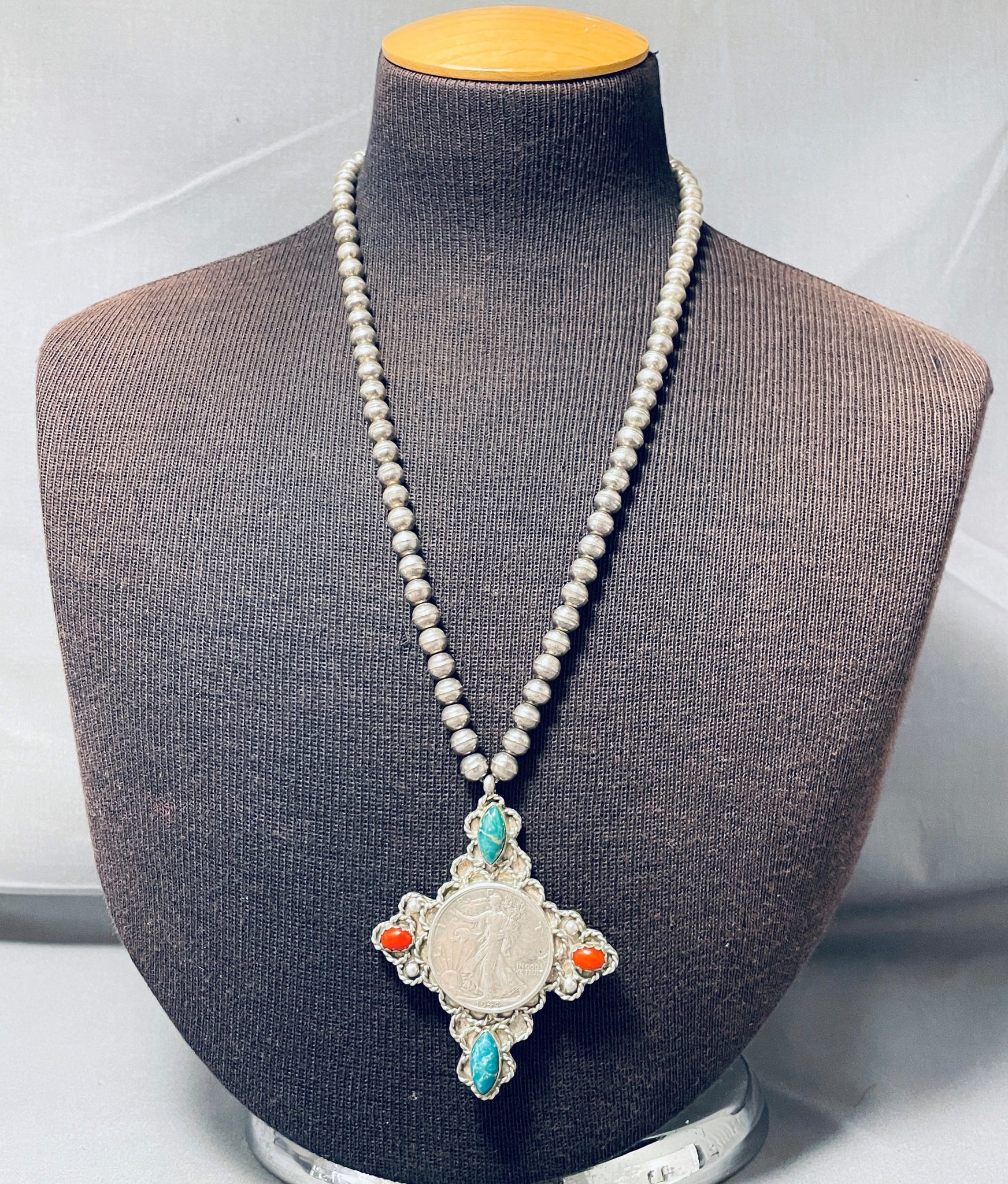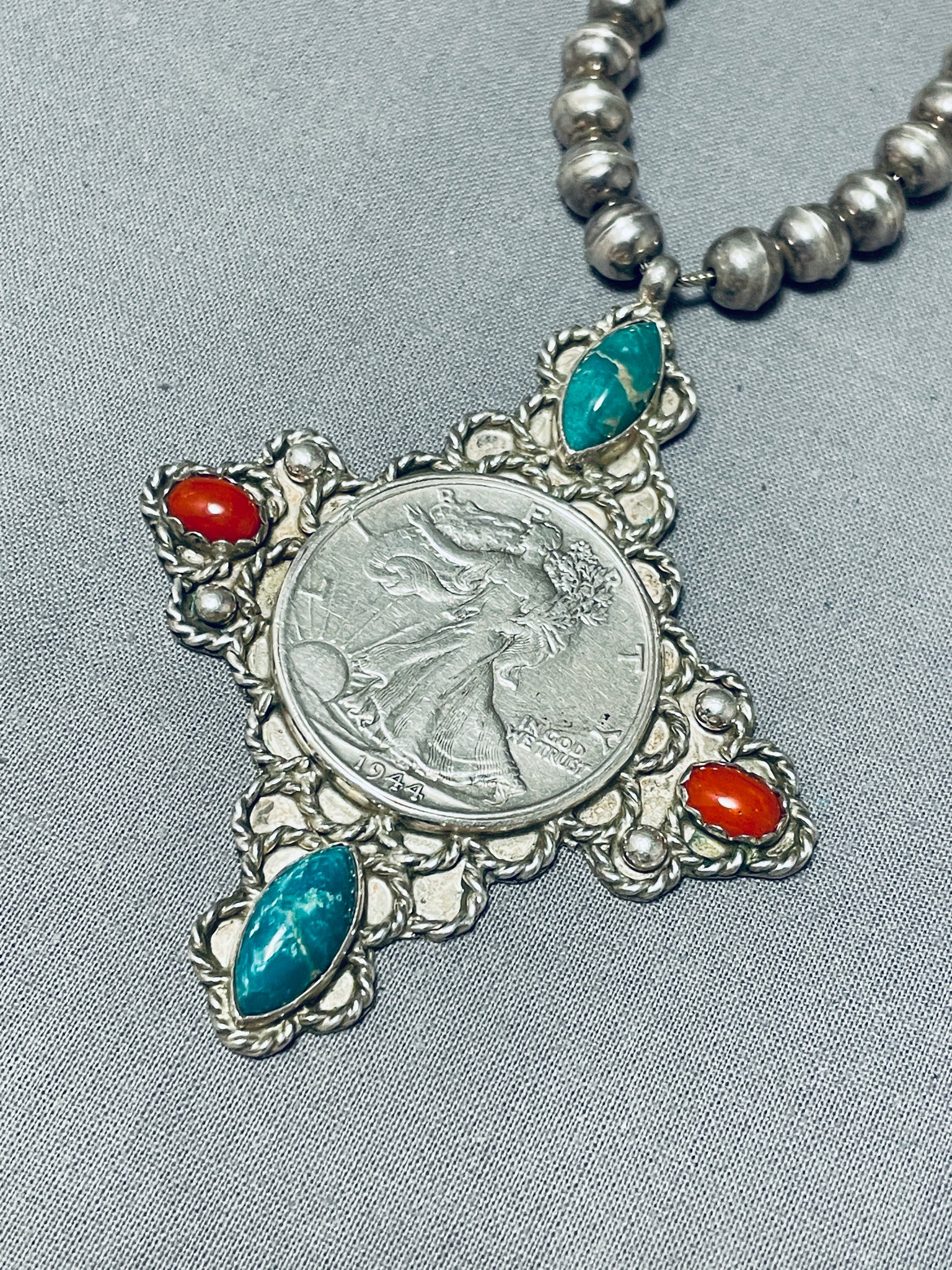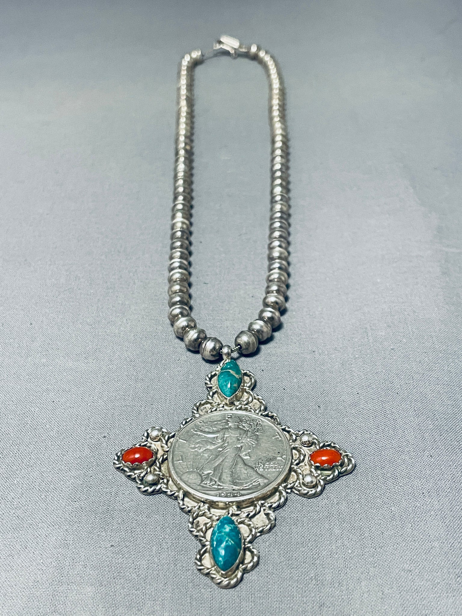 This is an astonishing vintage Navajo silver necklace. Here we have a silver bead necklace with a large ornate attached cross pendant with 2 Damale turquoise stones and 2 coral stones at the points, with a 1944 half dollar in the very center! Sterling silver. The length of the necklace measures around 28". Sturdy 68 grams. Cir Mid Century.