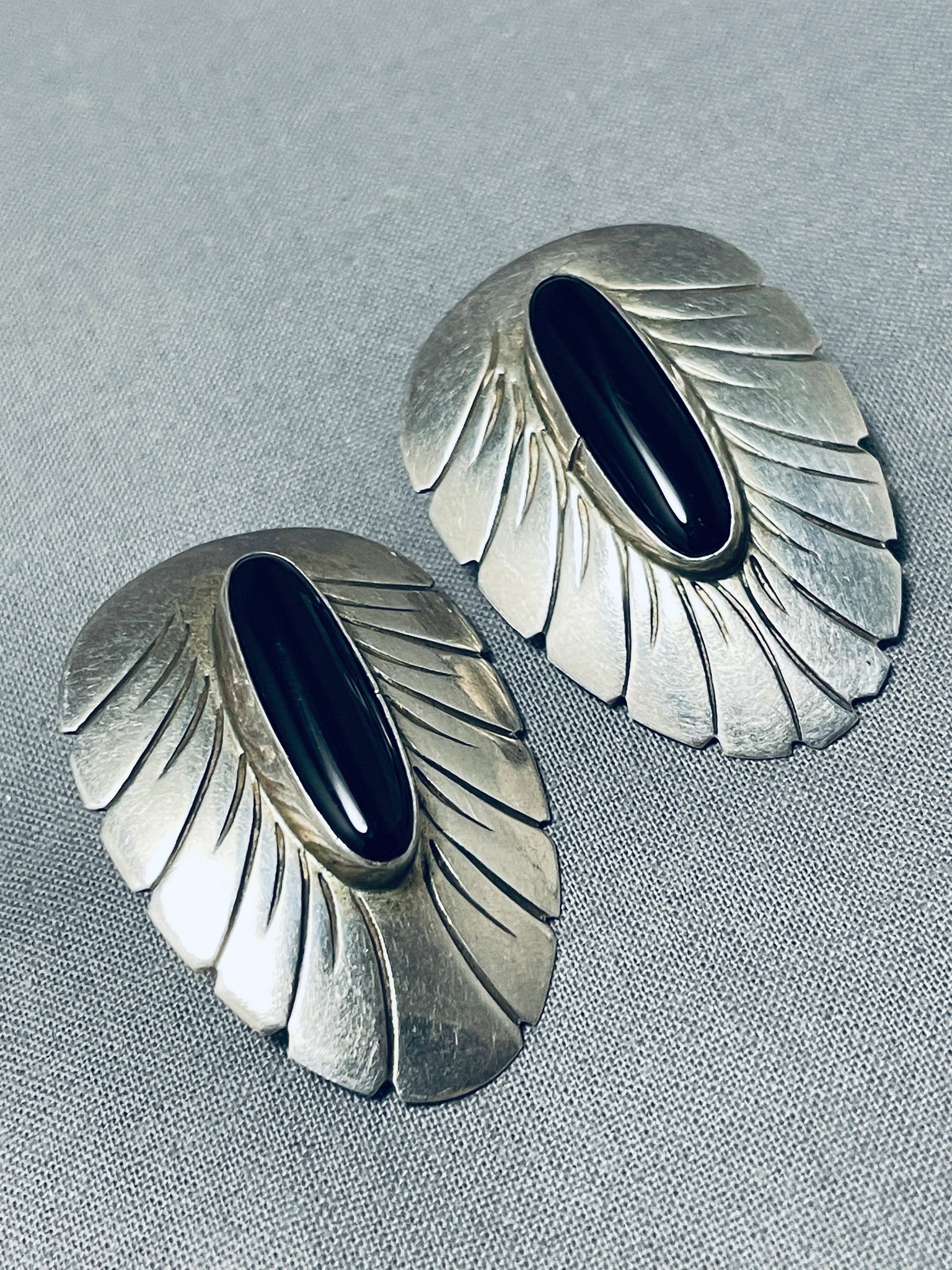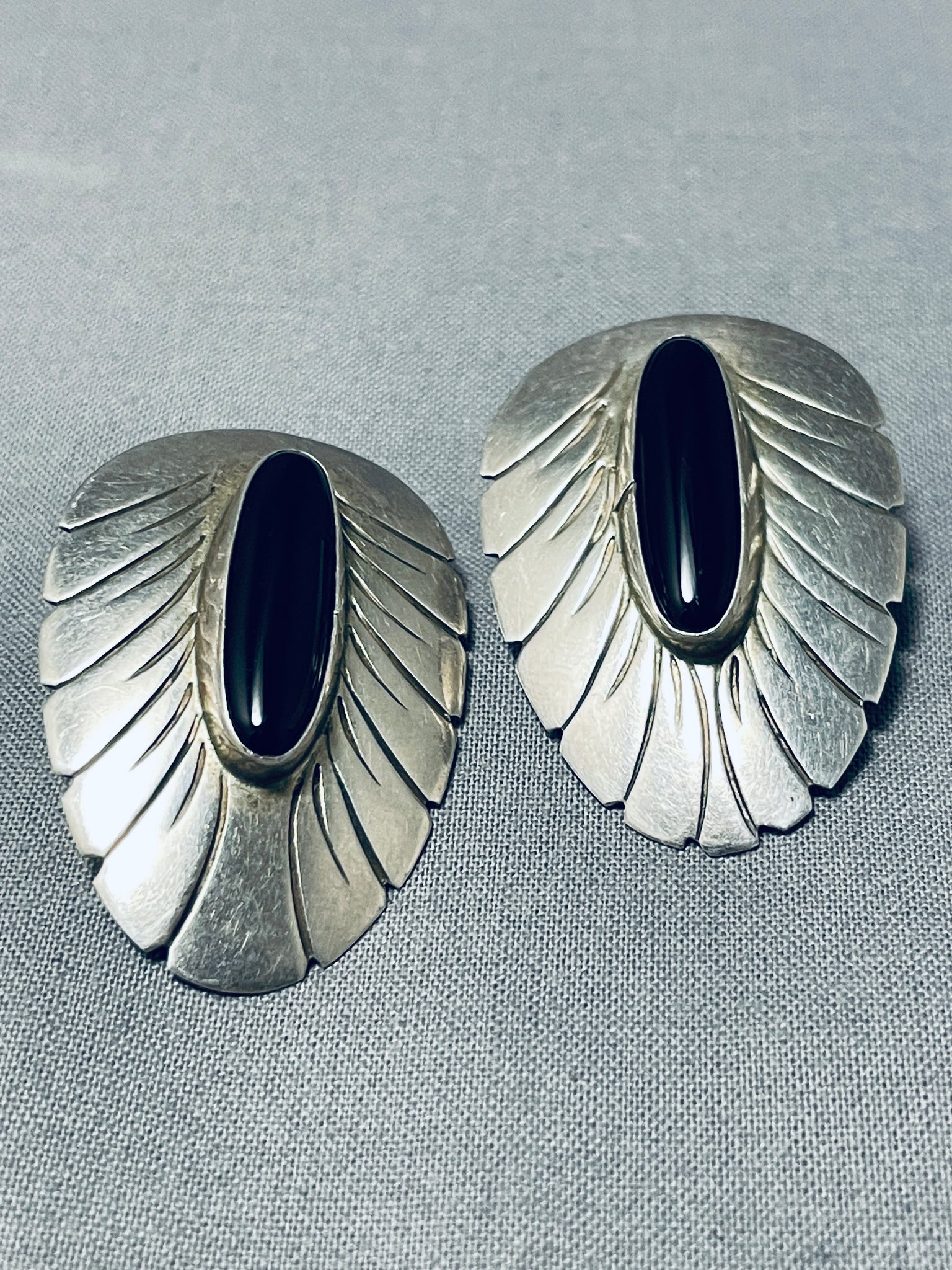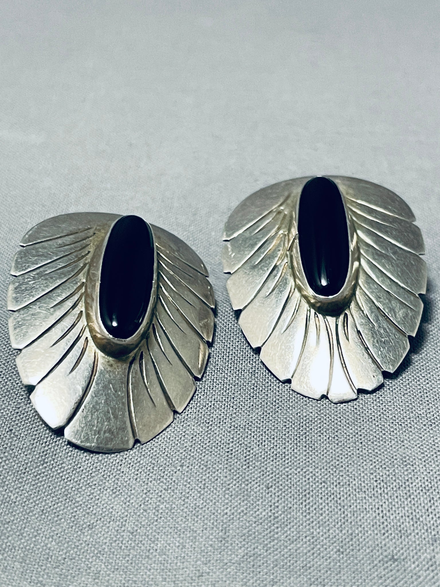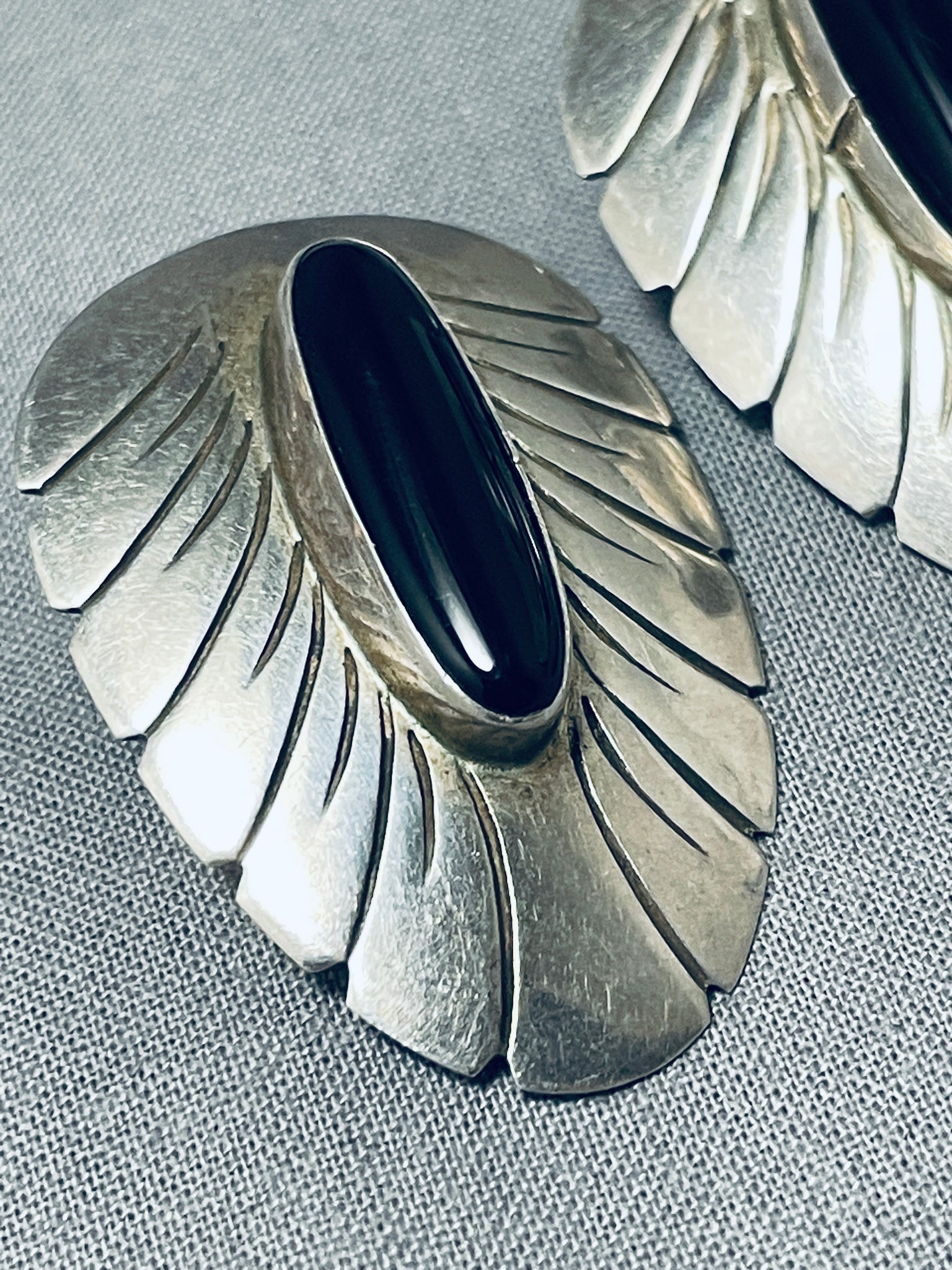 Exceptional Vintage Native American Navajo Jet Sterling Silver Earrings Signed