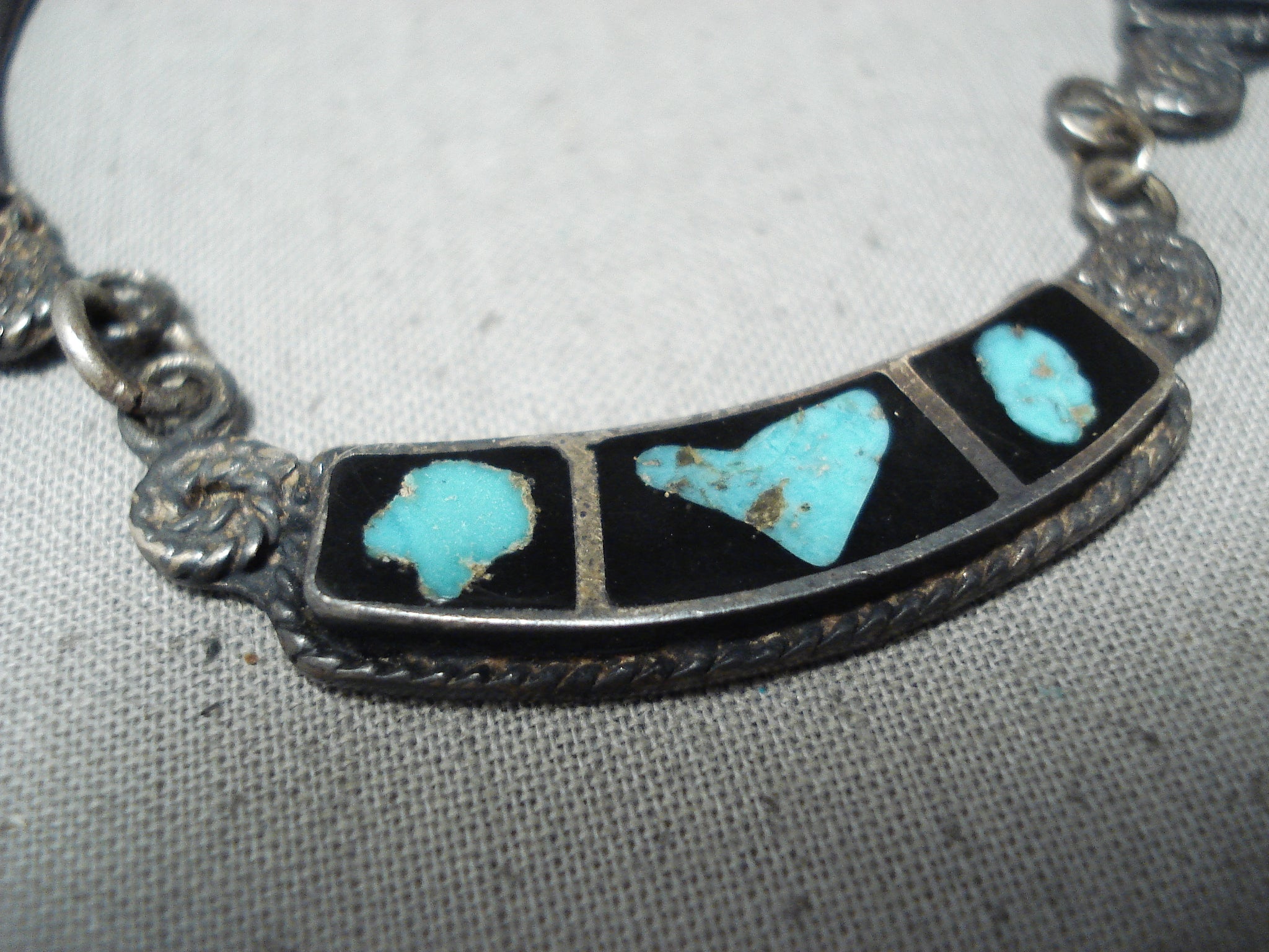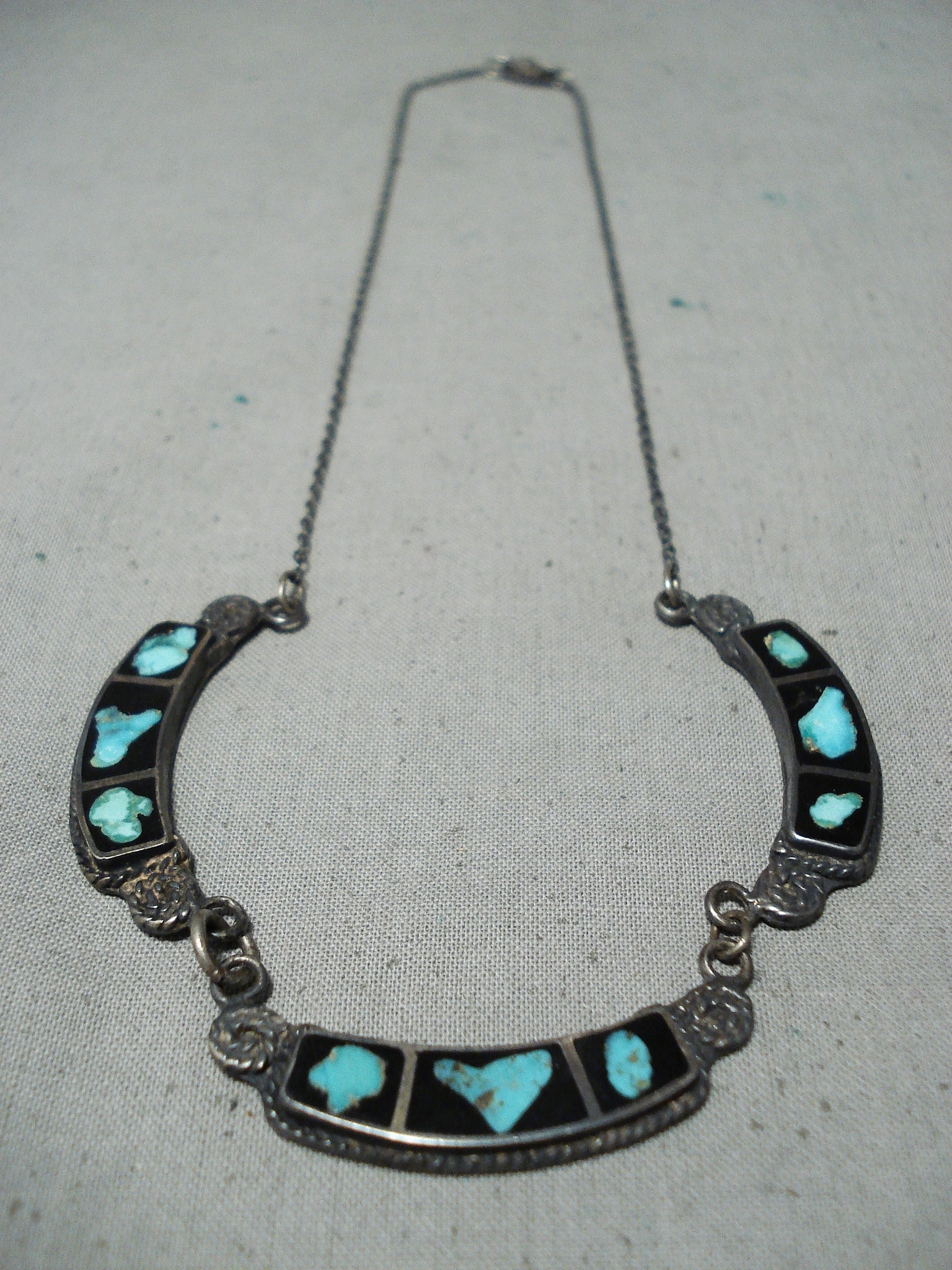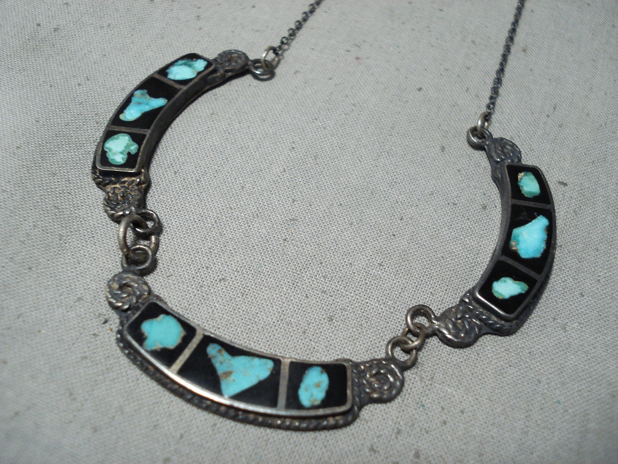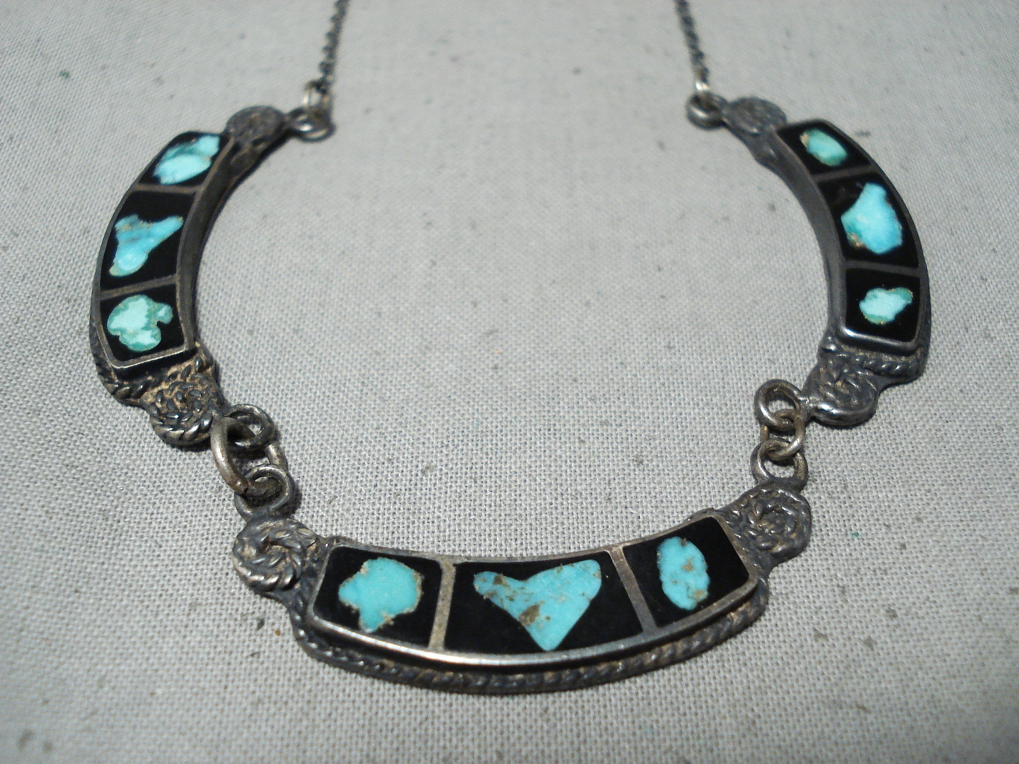 Exceptional Vintage Native American Navajo Turquoise And Onyx Sterling Silver Necklace Old