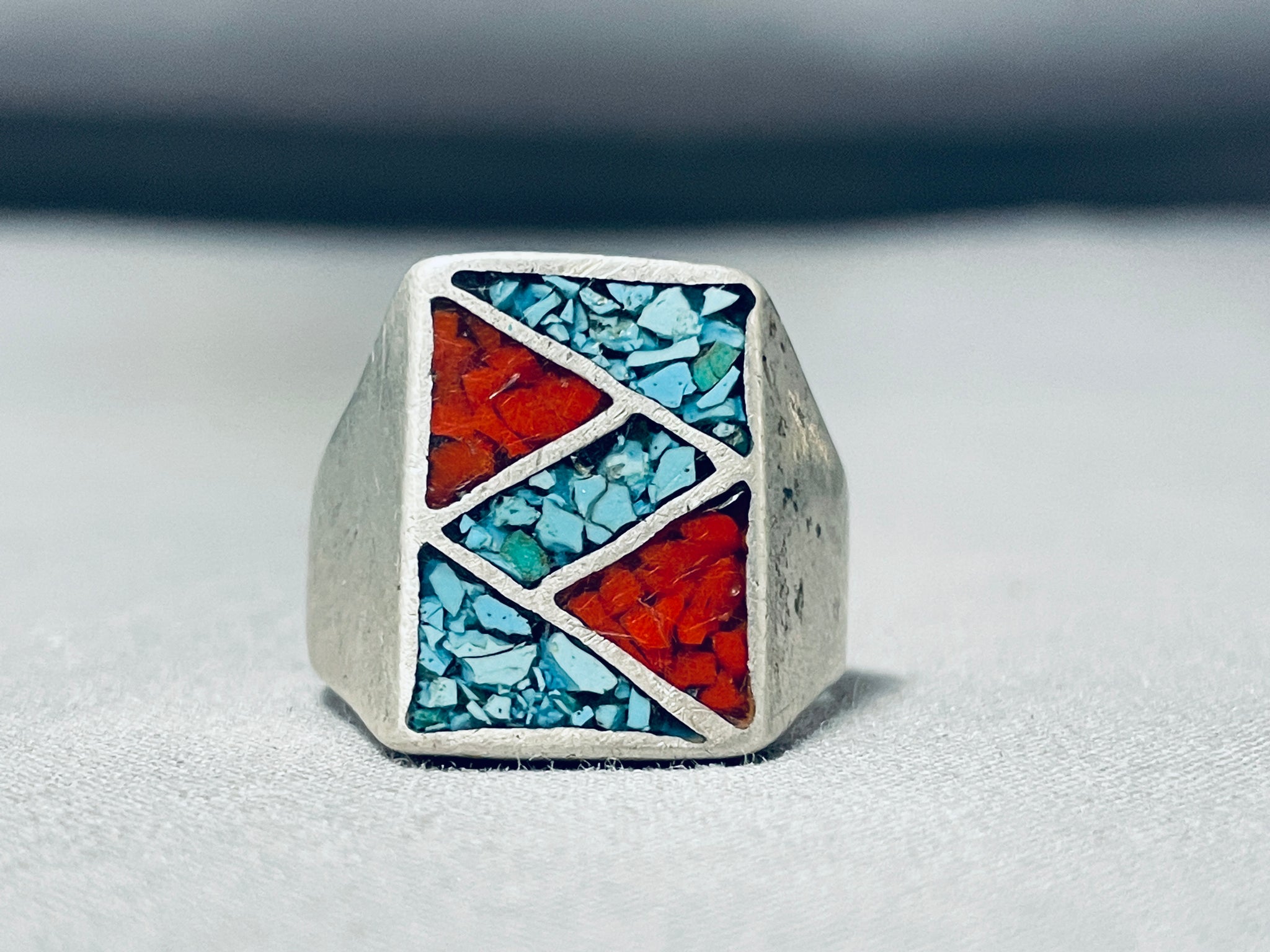 Up for sale is this superior vintage Navajo silver ring. The interesting rectangular face of the ring has geometric sections of vibrant chip inlay turquoise and coral! The wide band begins at the sides and gently tapers to the back. The ring face measures around 3/4" x 7/8". The ring size is around 10. Cir. 1970's+. Sterling silver. Sturdy 12 grams.