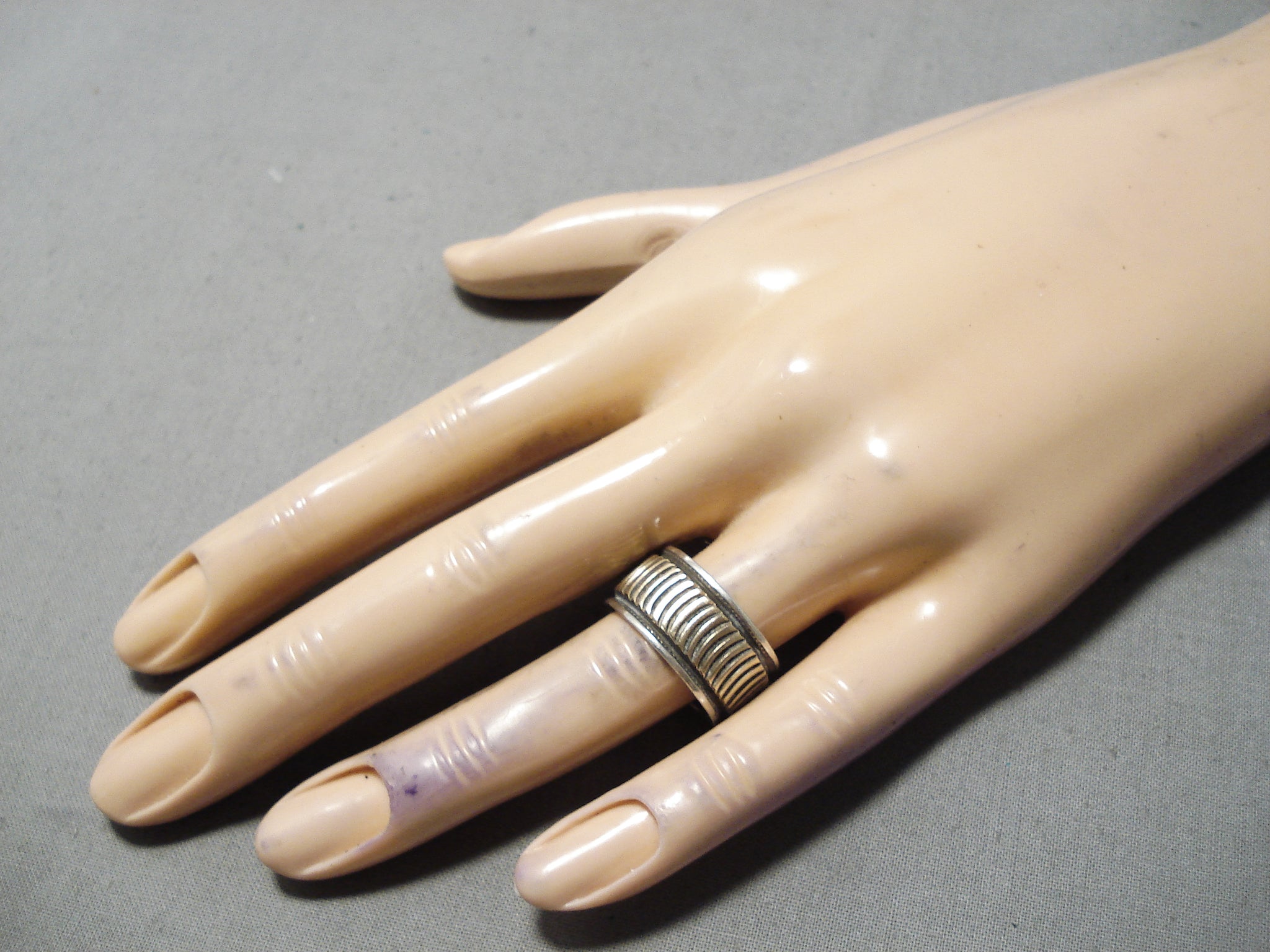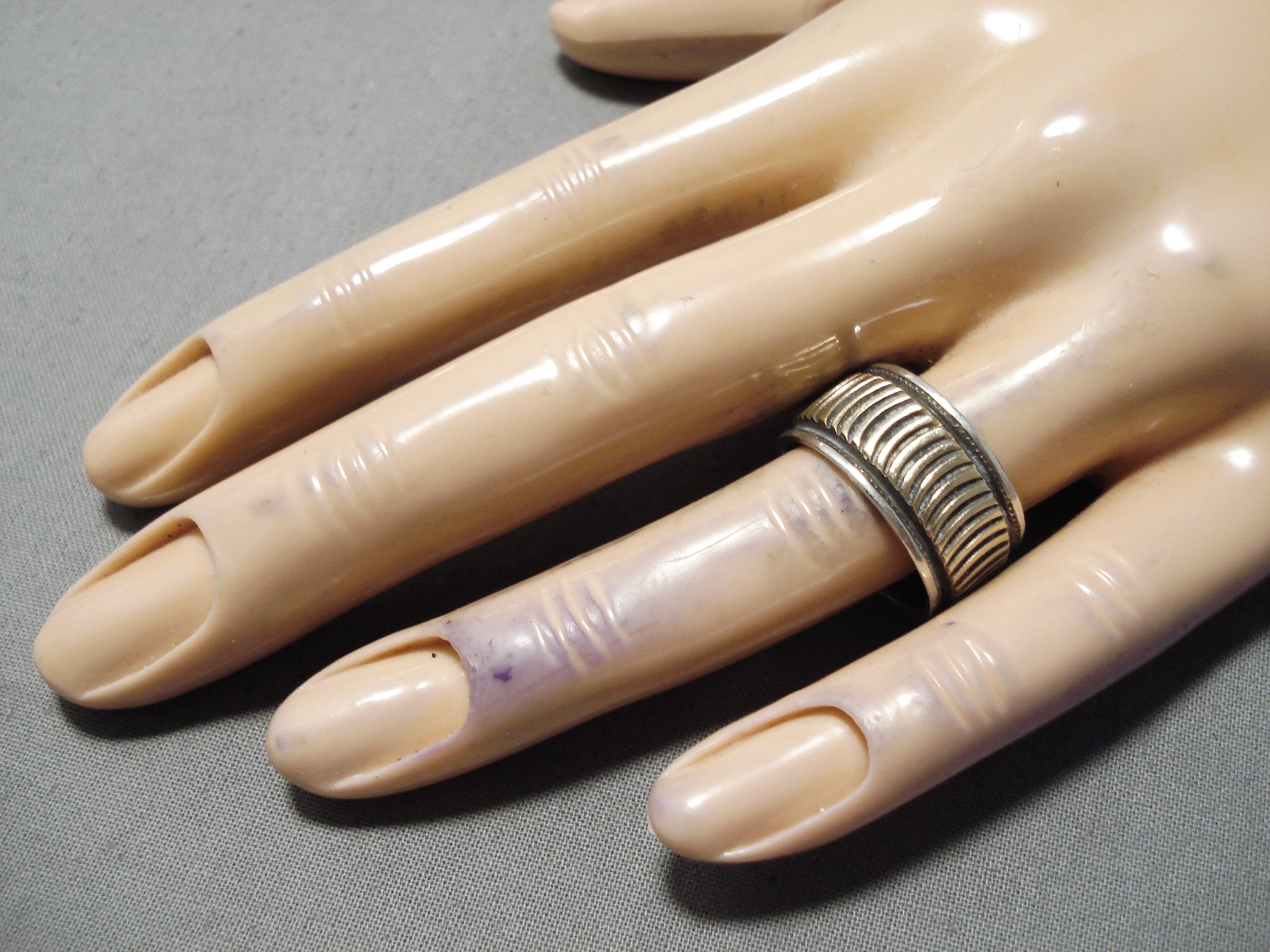 This is a fascinating vintage Navajo 14k gold and silver ring. The center of this band hosts a deep handcarved 14k eternity spine – with just a hint of curve to it! Awesome! The ring face measures around 3/8" x 3/4". Signed by Navajo artist, Bruce Morgan. The ring size is around 7-1/2. Sterling silver and 14K gold, both marked. Sturdy 12 grams.