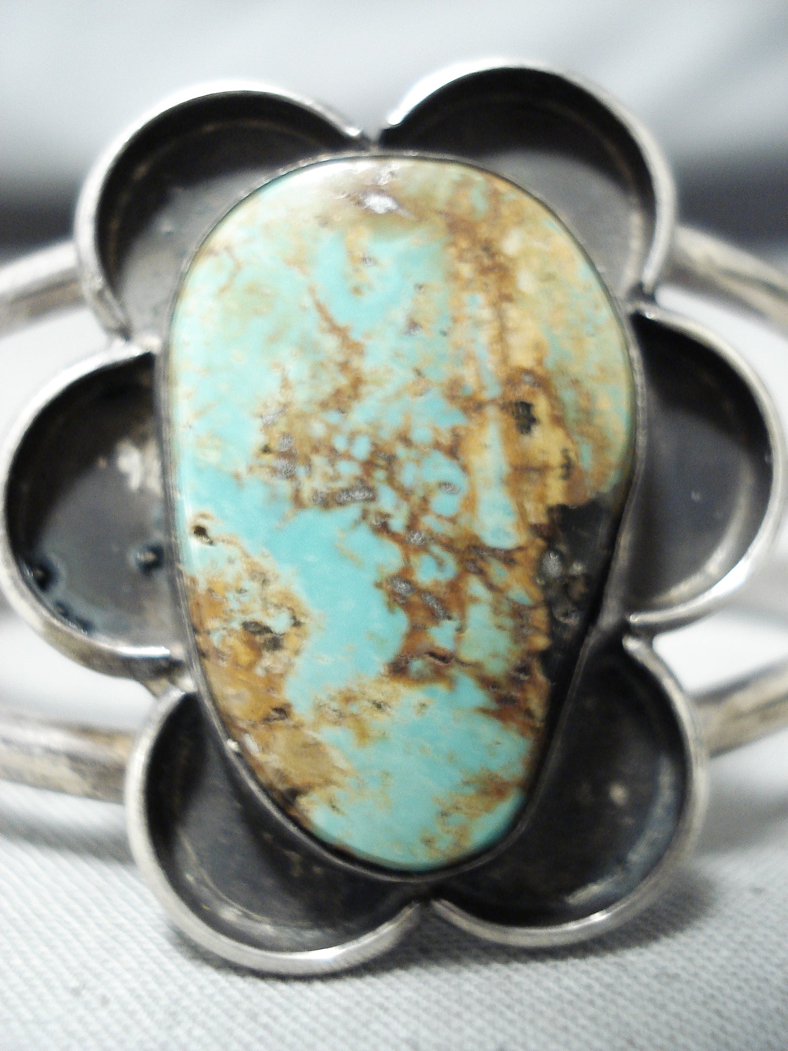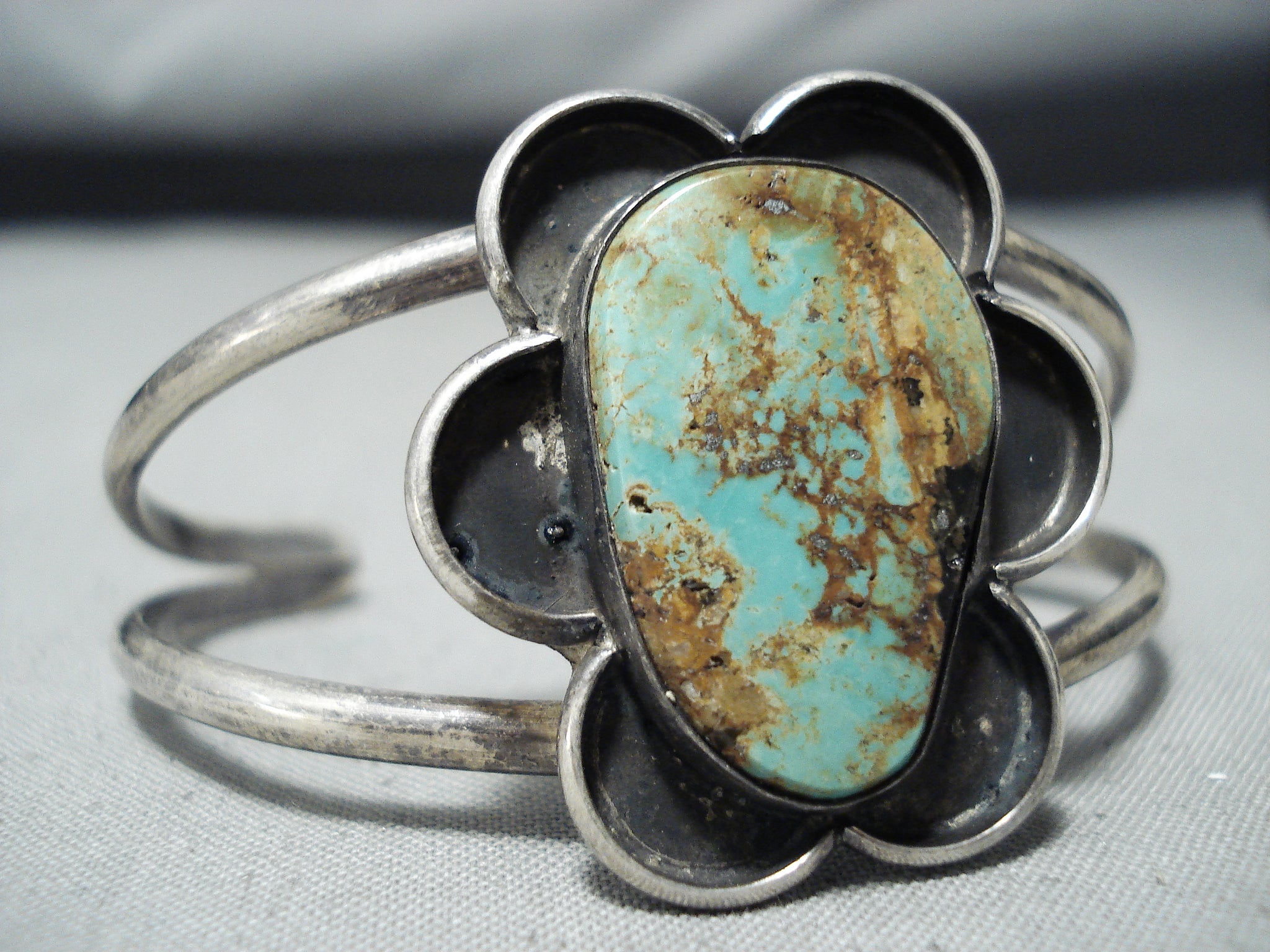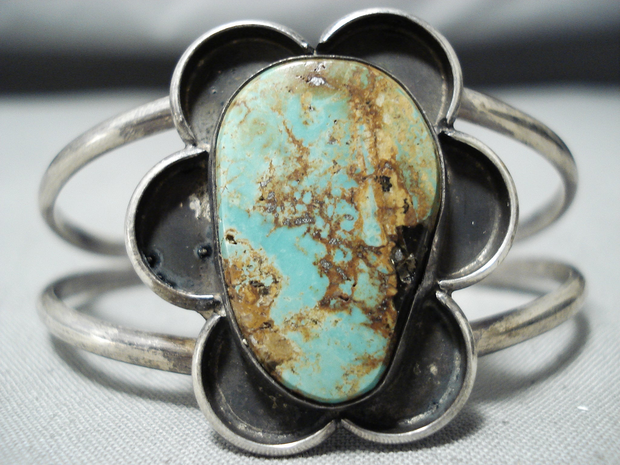 This is a tremendous vintage Navajo bracelet featuring a handcarved silver flower with a Royston turquoise stone center, on a graduated double rail silver cuff! Positively Remarkable! The center stone measures around 1" x 5/8". The width of the bracelet measures around 1-1/4". Sterling silver. The inside end to end measures around 4-3/4" with an additional 1-1/4" gap. Sturdy 19 grams. Cir Mid Century.