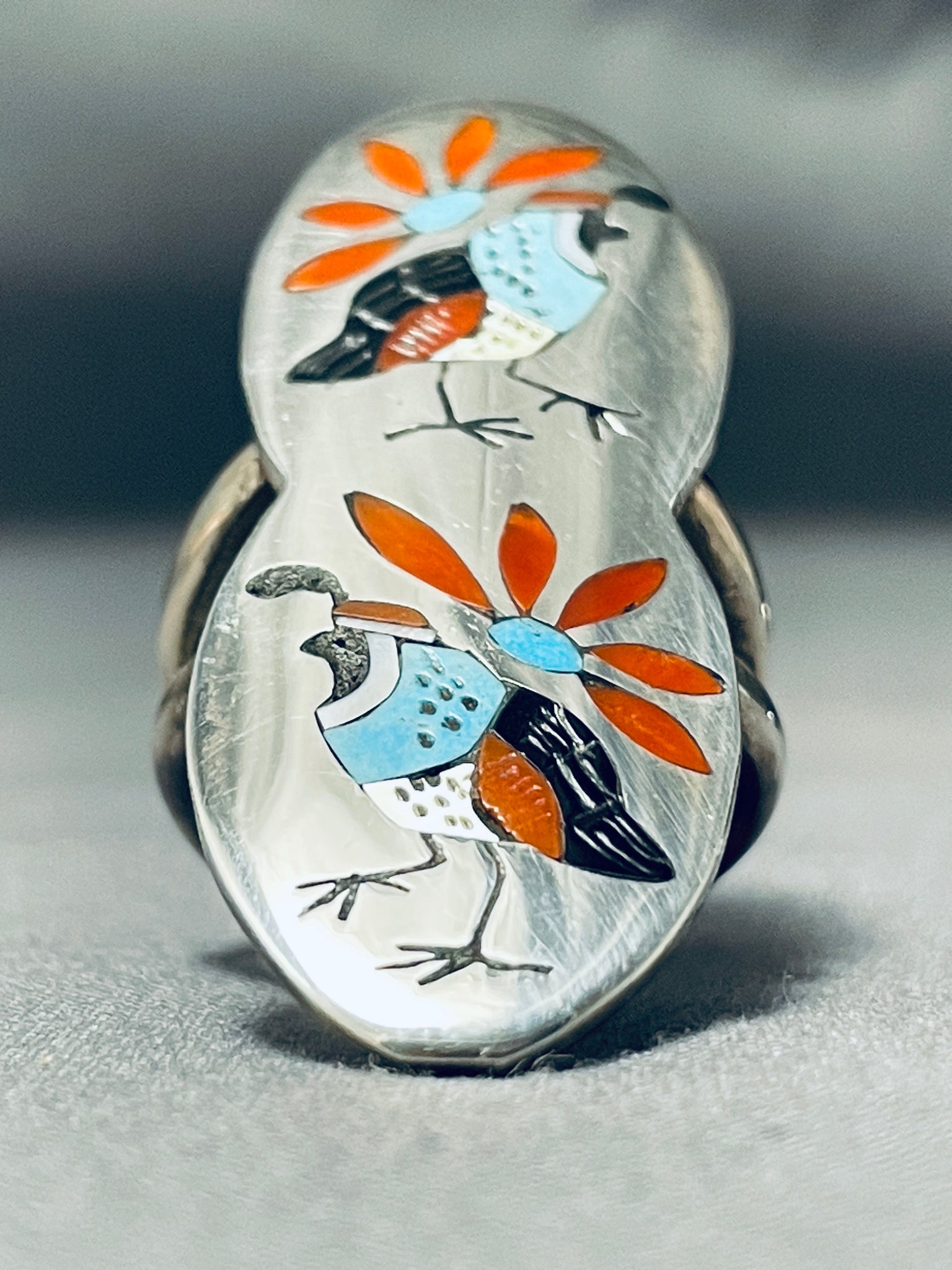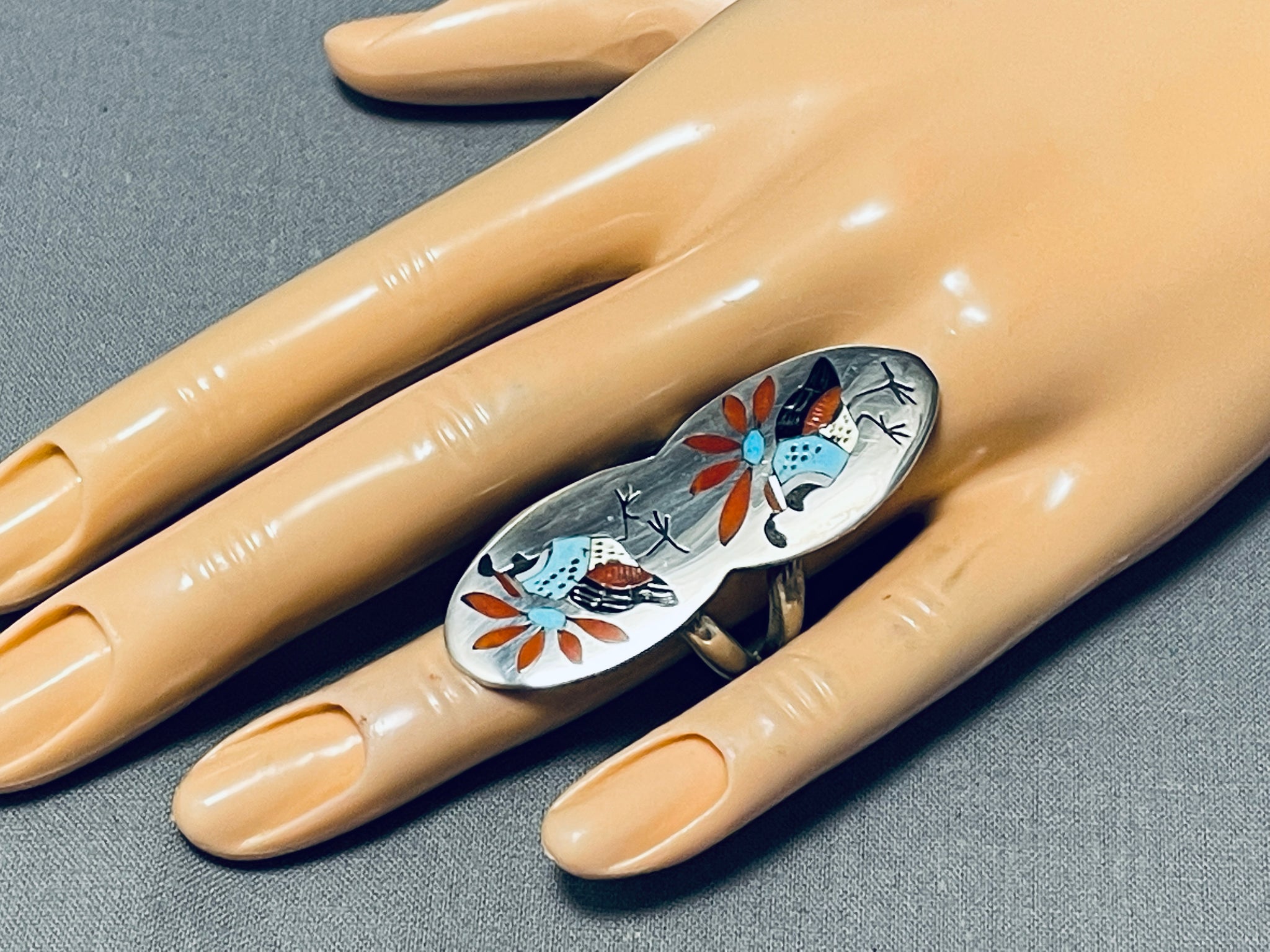 Extreme Intricacy Native American Zuni Turquoise Coral Sterling Silver Bird Ring