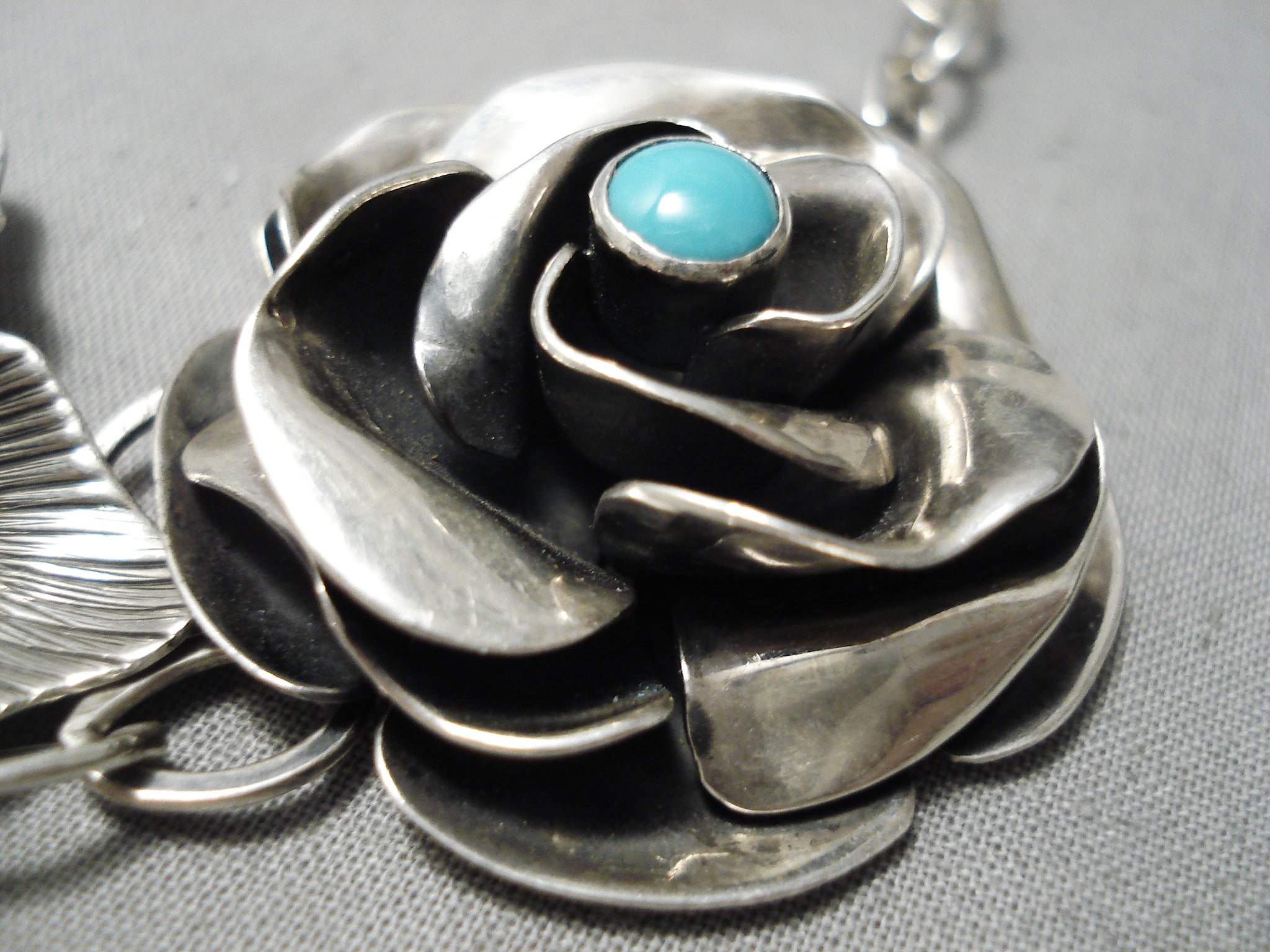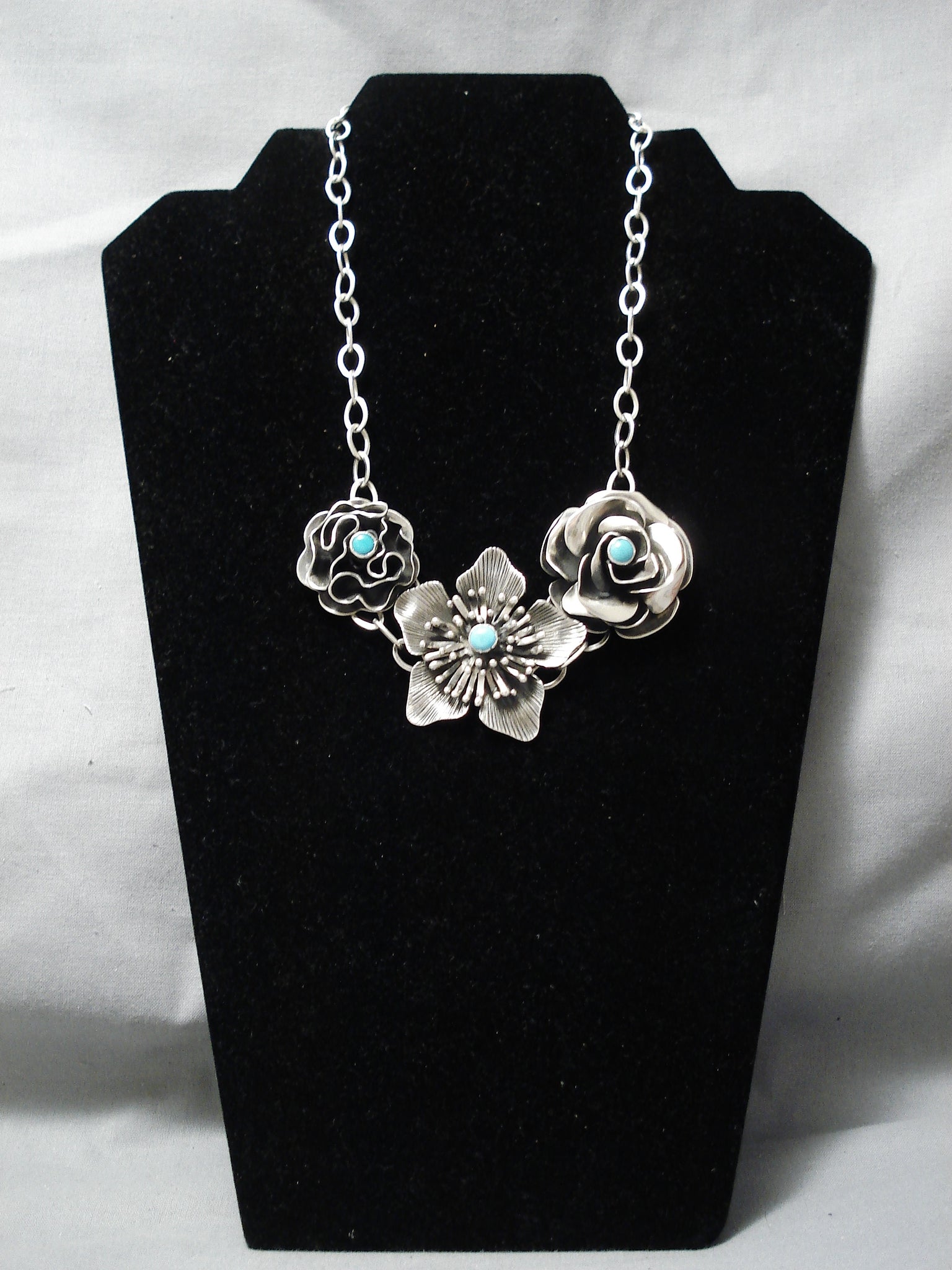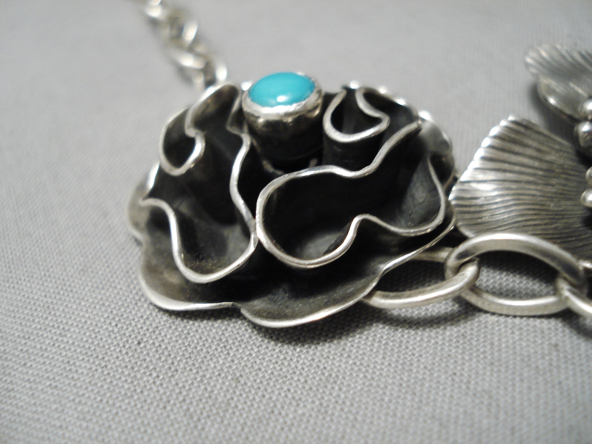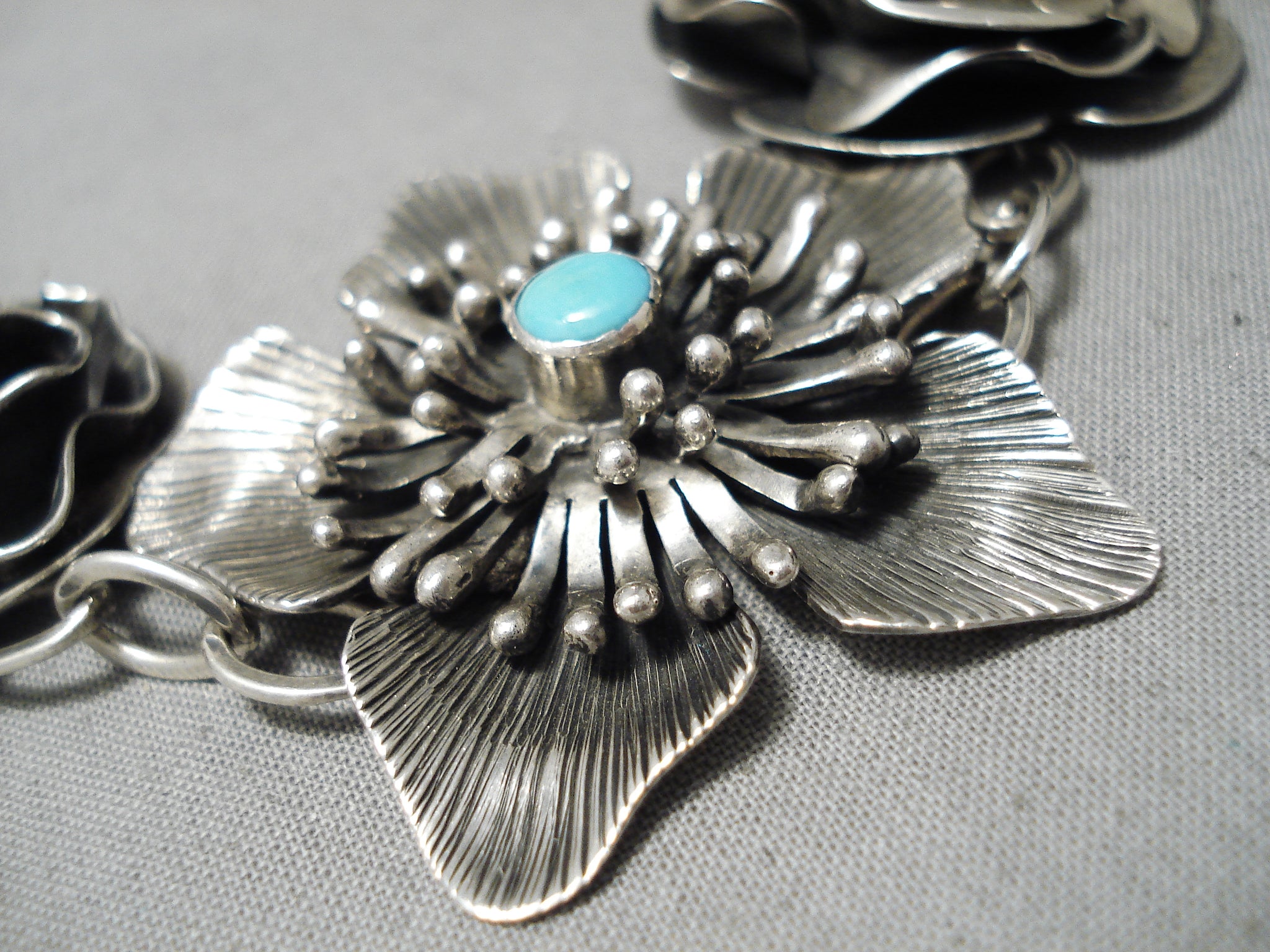 Extremely Detailed Handmade Flower Sterling Silver Turquoise Native American Navajo Necklace