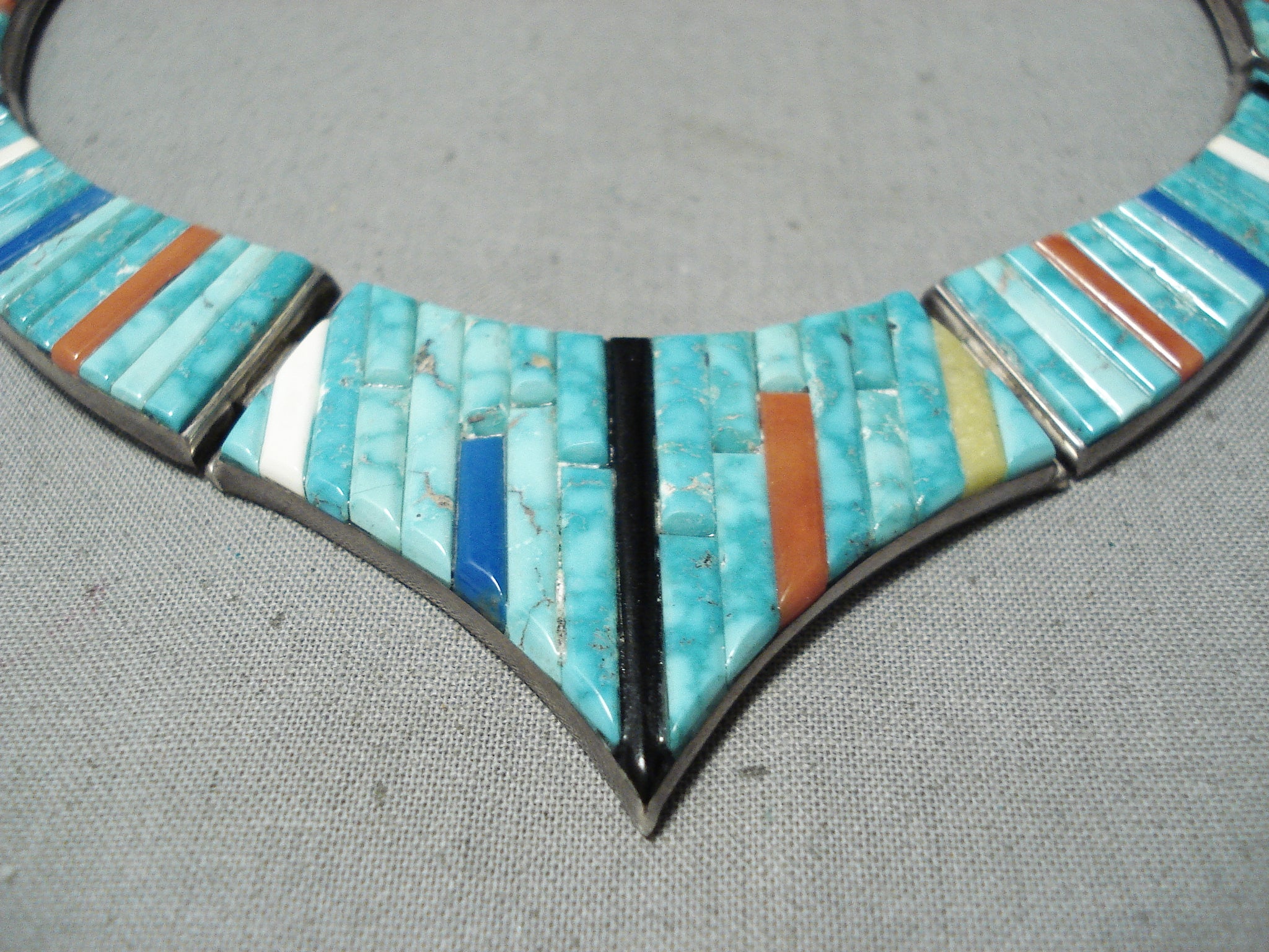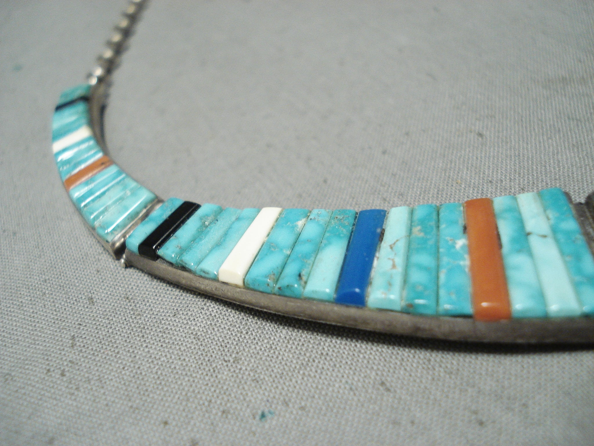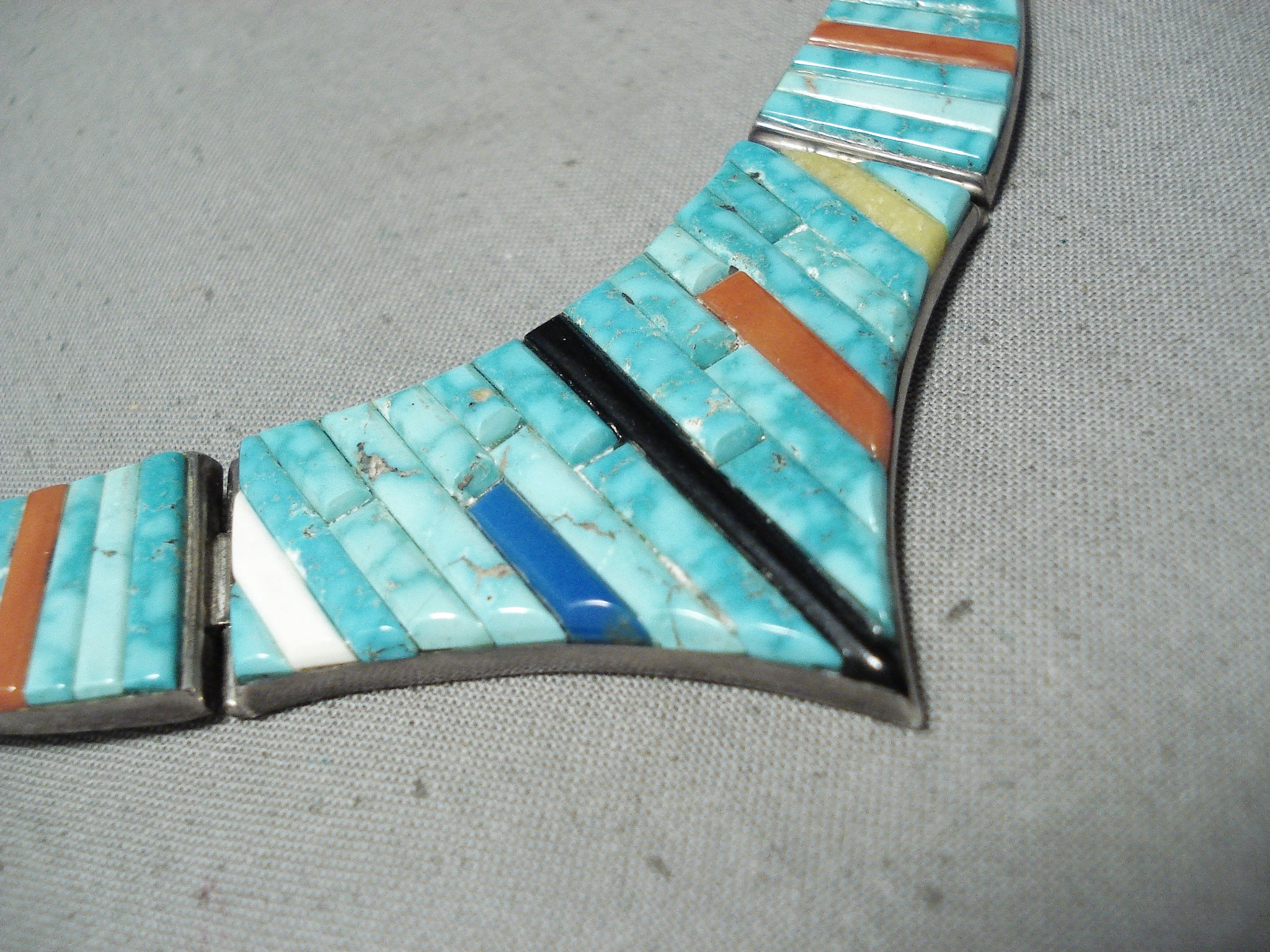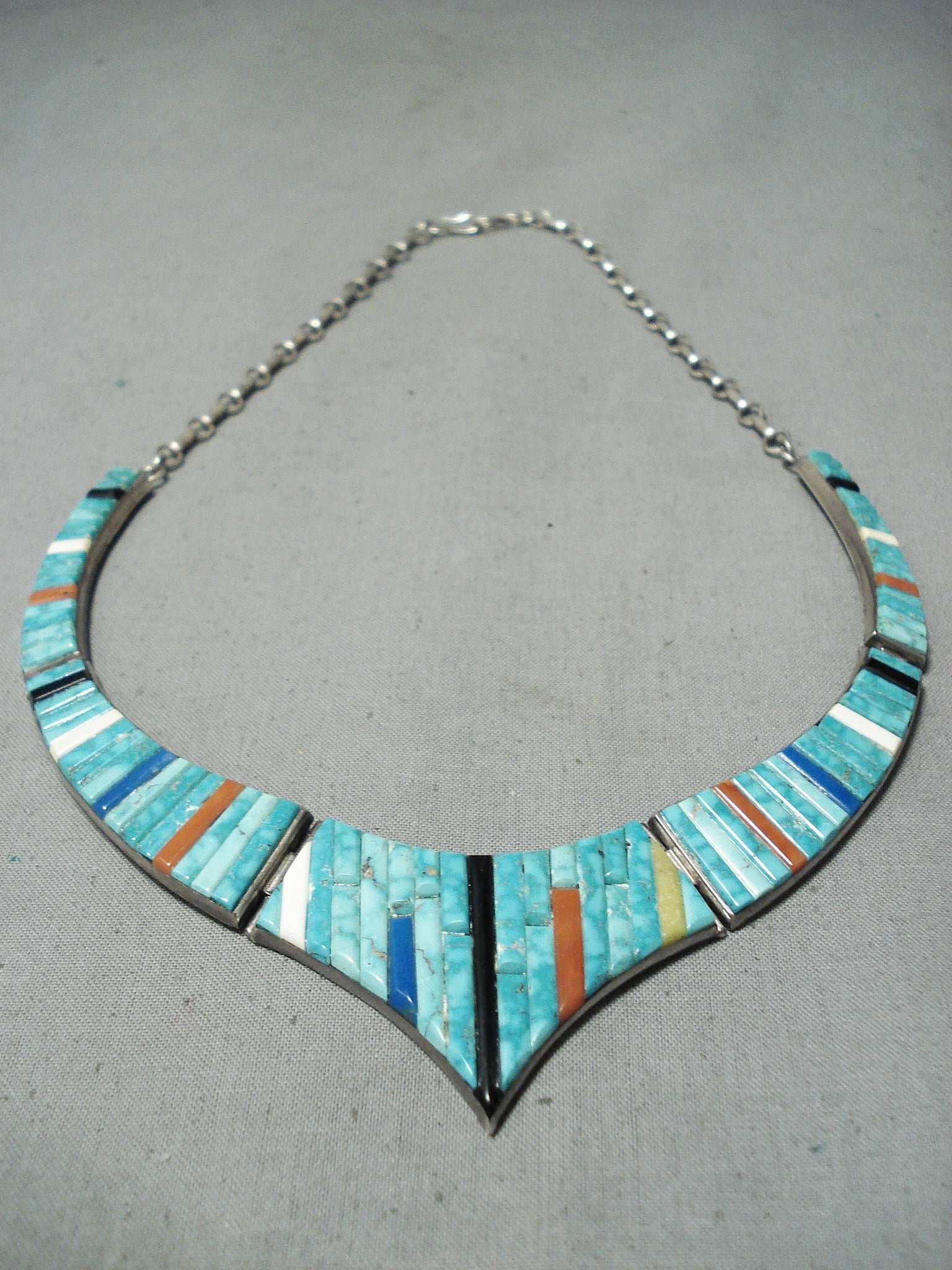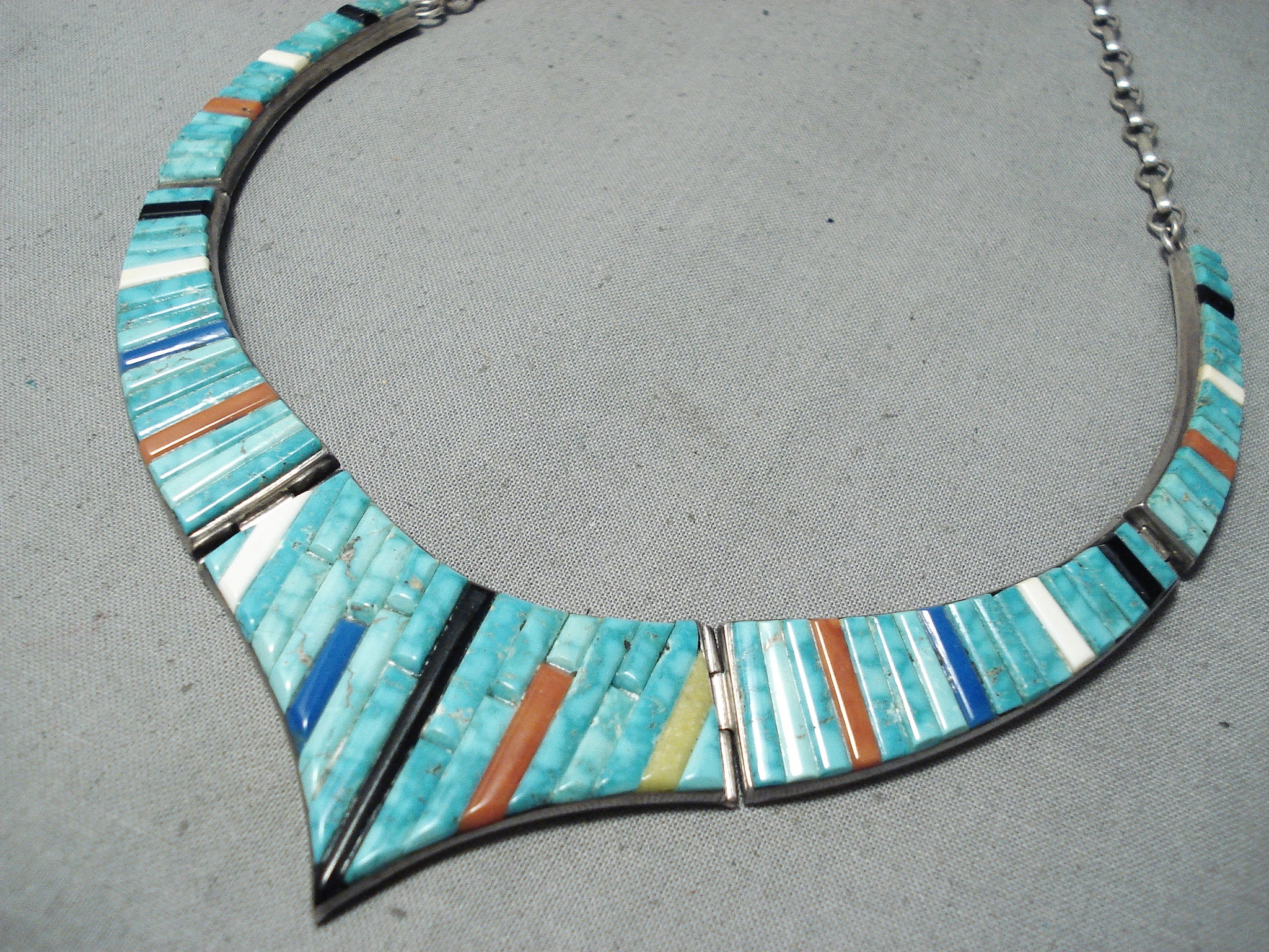 This is a museum quality vintage Navajo inlaid silver necklace. This outstanding piece contains five mind blowing inlaid sections that graudate in size towards the bottom. The bottom inlay section measures around 2-1/8" X 1-1/4". The inlay consists of turquoise, onyx, coral, and lapis. The turquoise appears to be from the Carico Lake turquoise mine which is very rare to find in inlay formation. Sterling silver, marked. Cir. 1970's+. Signed Navajo . The length of the necklace measures around 17". Sturdy 49 grams.