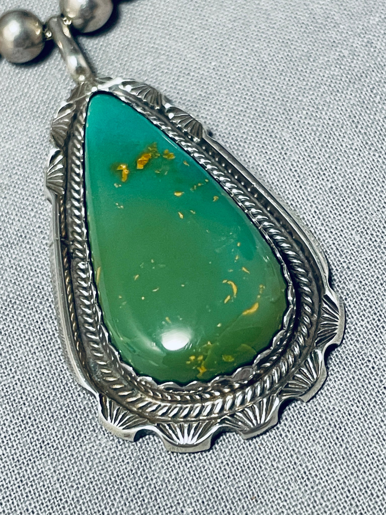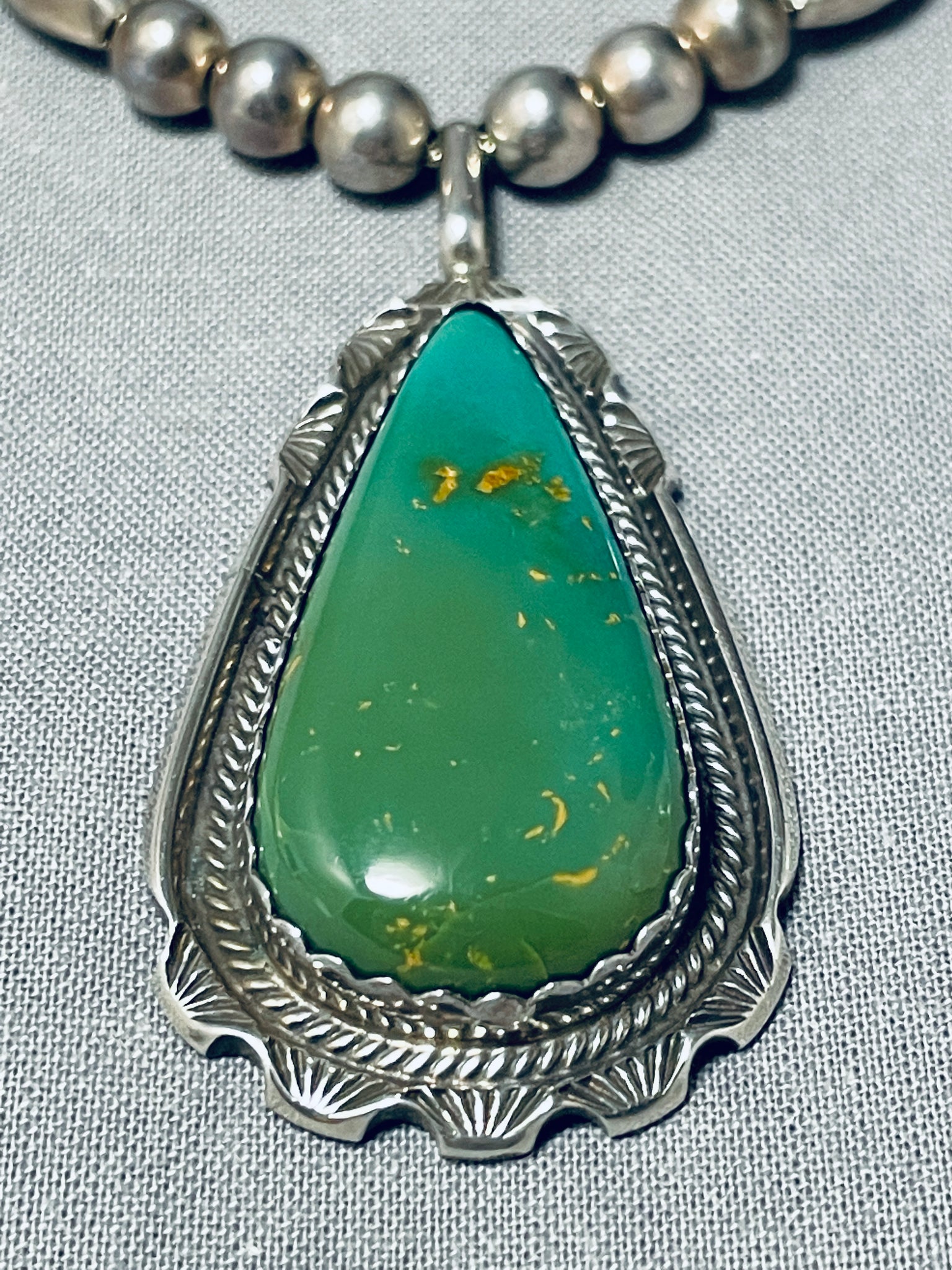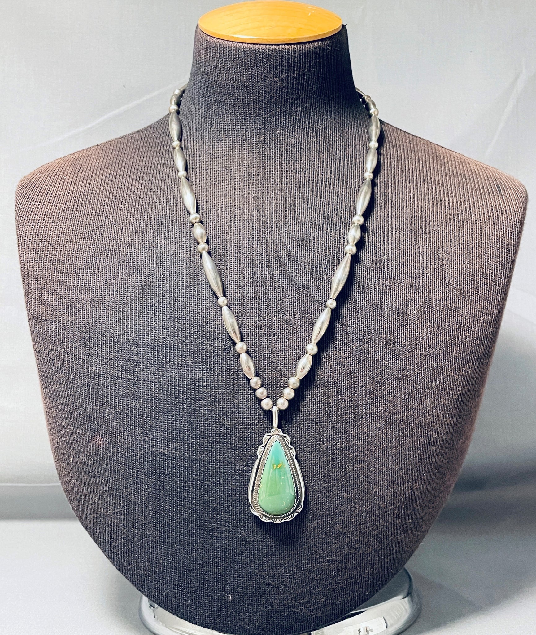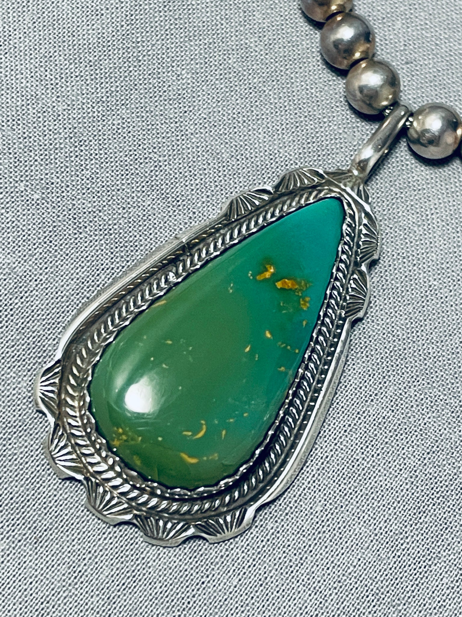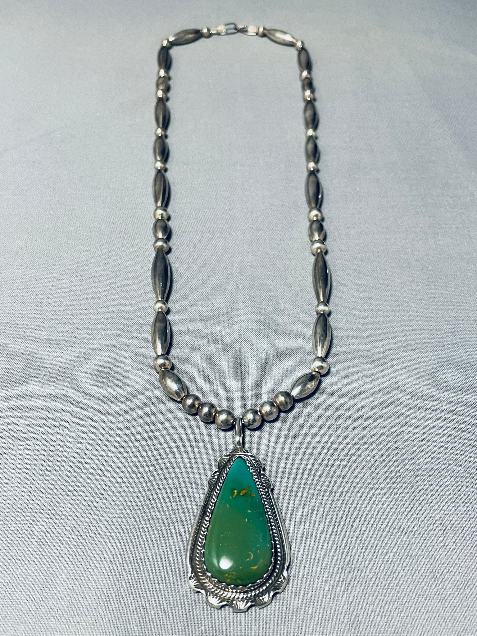 This is an amazing vintage Navajo single stone silver pendant necklace. This incredible necklace contains a beautiful large teardrop shaped green turquoise stone that is located on the large 2-1/8"X 1" teardrop shaped silver pendant including the bail. The stone appears to be from the wonderful Damale turquoise mine. The surrounding silver works consist of sun tsampings and a rope. Resting throughout the rest of the necklace are superior round and torpedo shaped silver beads with a traditional silver clasp. Sterling silver, marked. Cir. Mid century . The length of the necklace measures around 26". Sturdy 35 grams.