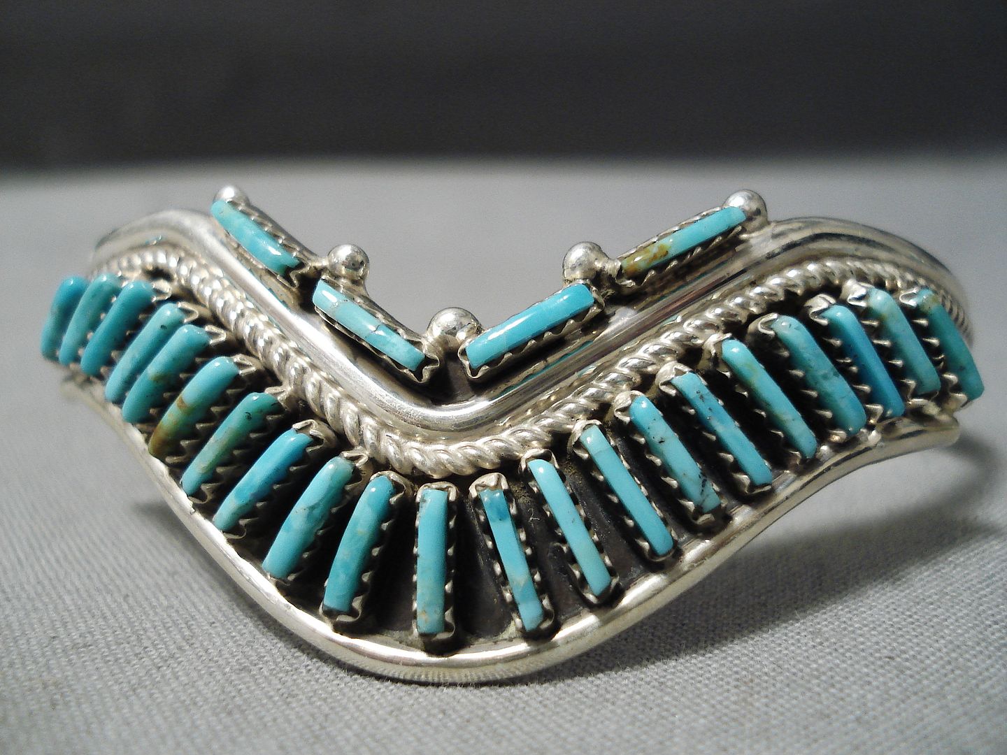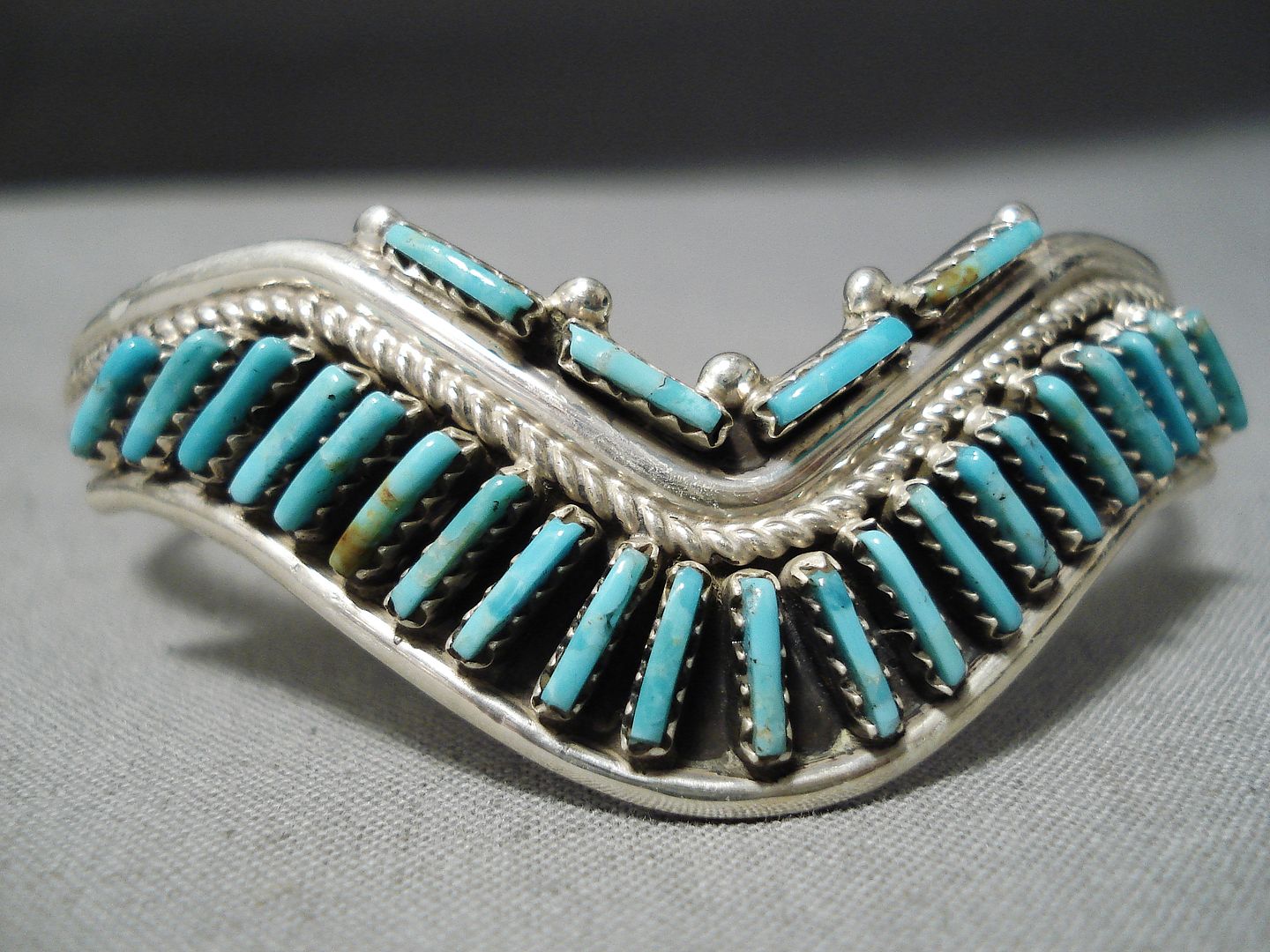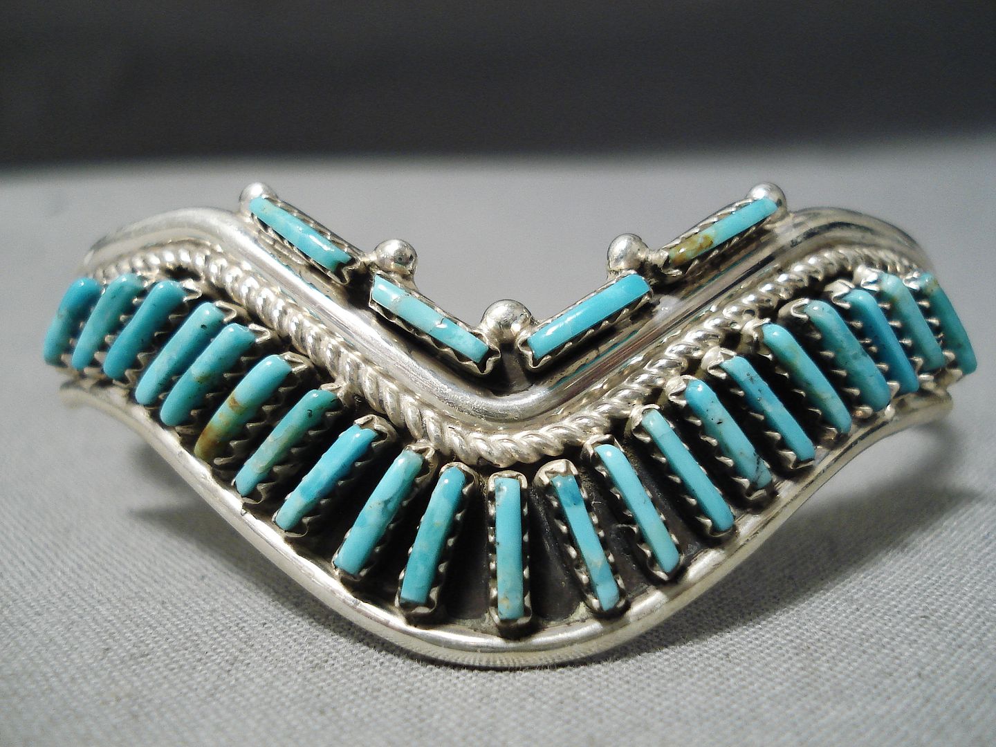 This is an astonishing vintage Navajo silver bracelet. Love the crown design of these beautiful turquoise needlepoint stones! The width of the bracelet measures around 3/4". Signed by Navajo artist, S.Begay. Sterling silver, marked. The inside end to end measures around 5-1/2" with an additional 1-1/8" gap. Sturdy 14 grams.