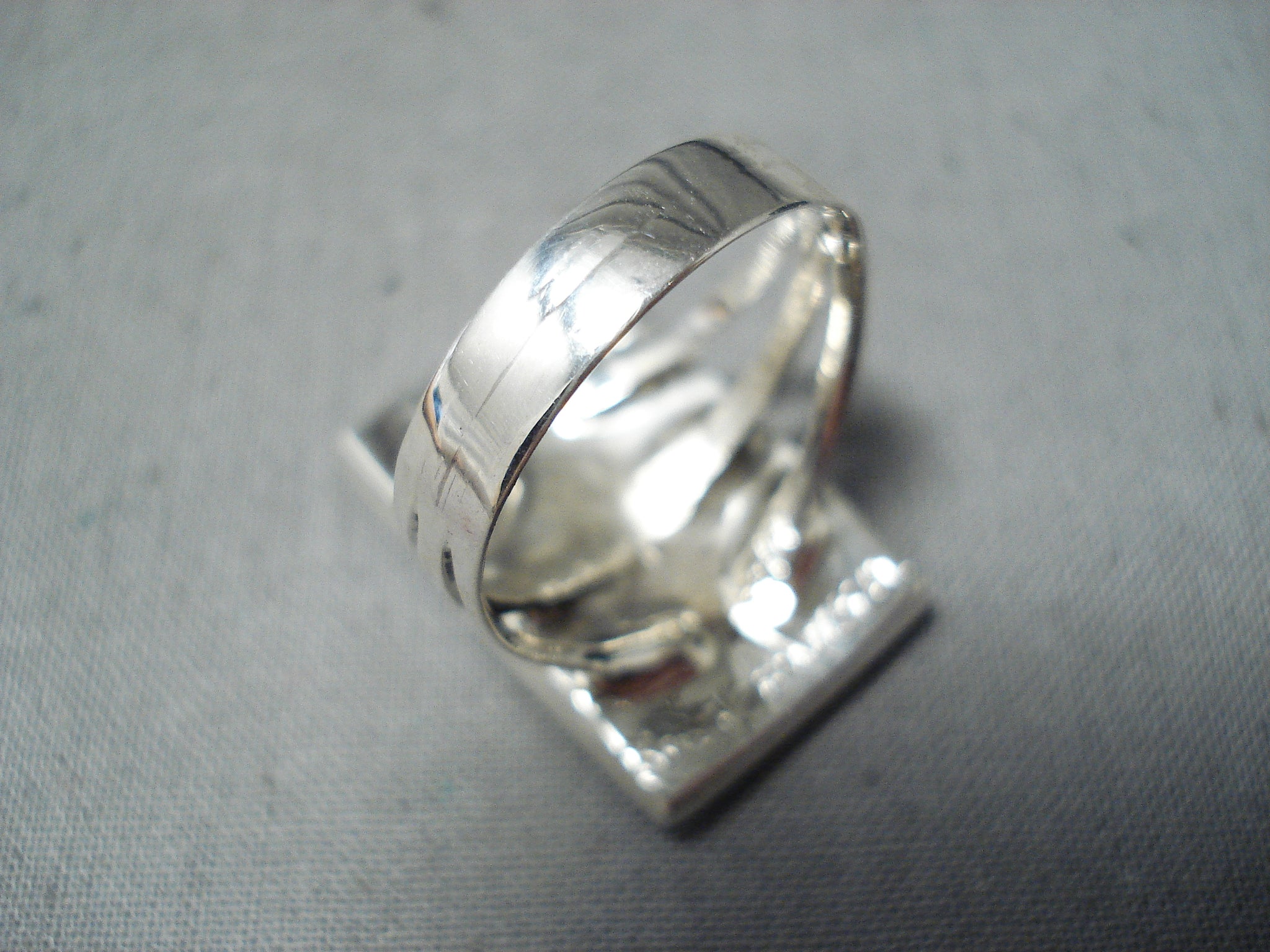 Here we have an impressive Zuni sterling silver ring having a turquoise center on a jet rectangular background with a handcarved silver border! The ring has a handcarved graduated triple silver rail band. So Distinctive! The center stone measures around 1/2" x 1/8". The ring face measures around 7/8" x 5/8". Signed by Zuni artist, Harlan Coonsis. The ring size is around 8. Sterling silver, marked. Sturdy 7 grams.