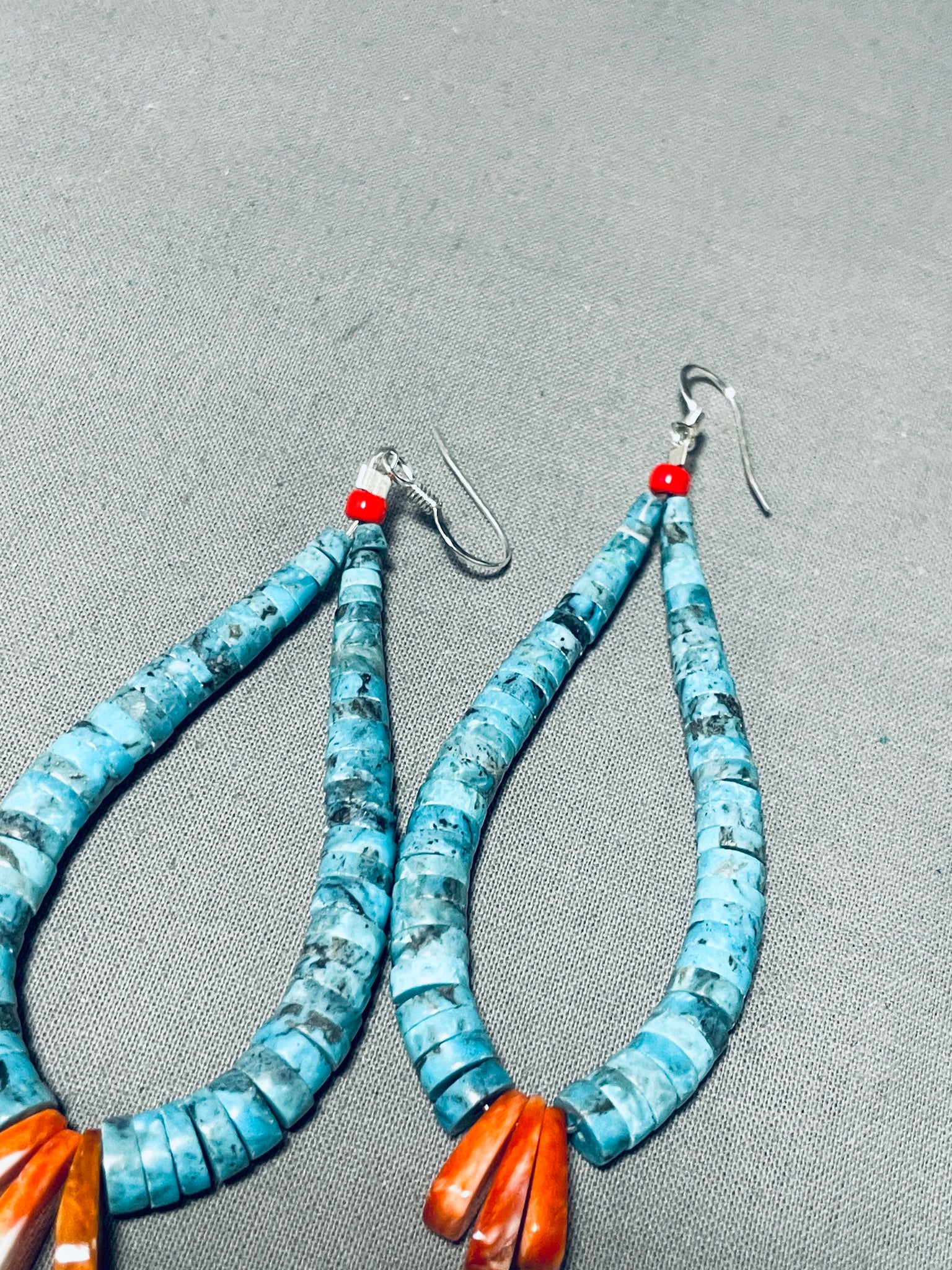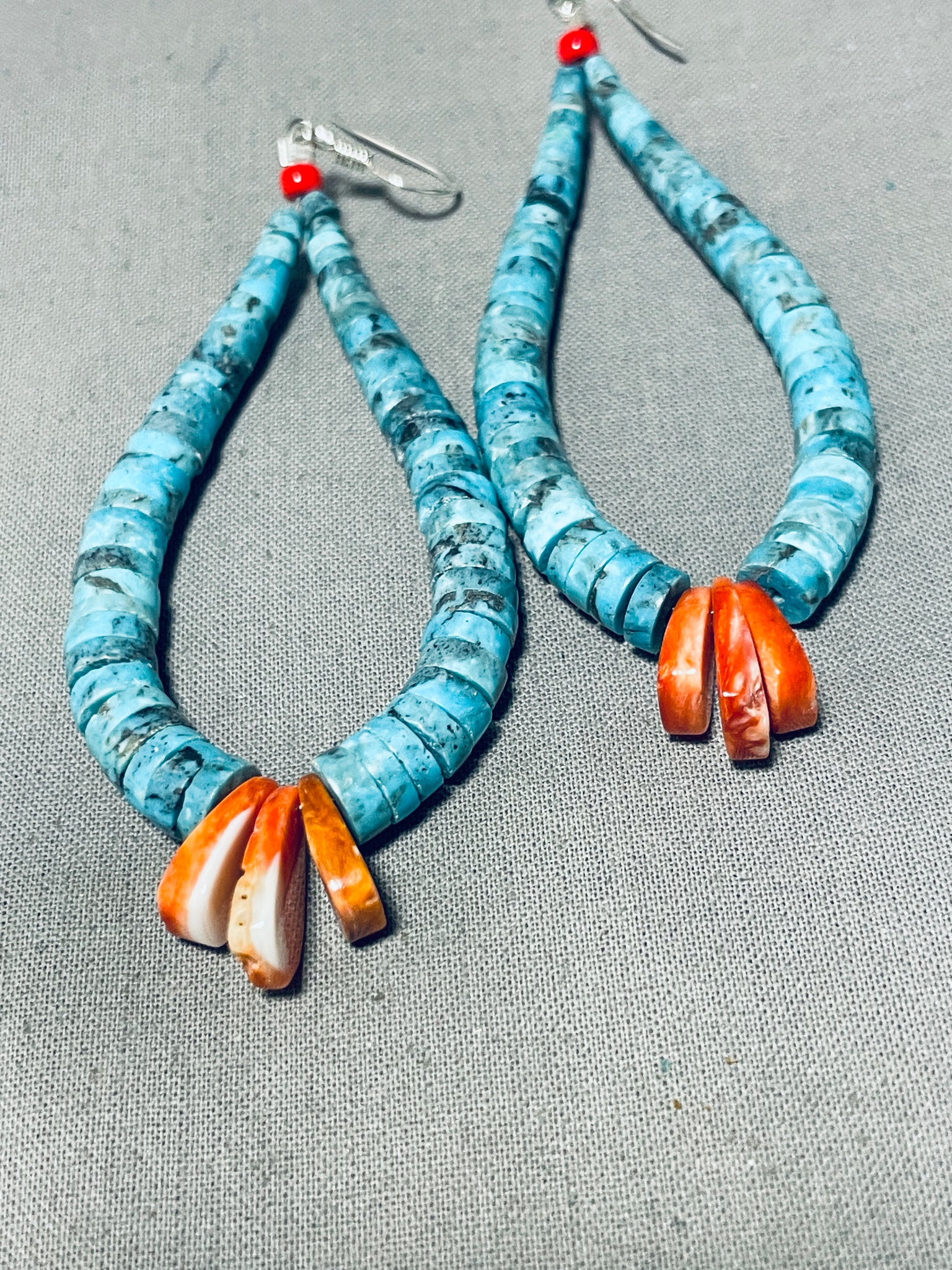 Up for sale is this superior Navajo silver pair of earrings. Here we have a truly eye-catching pair of long, dangling turquoise earrings! They are a pierced wire jacla design - with coral at the tops, then gorgeous turquoise discs that have 3 Spiny oyster "corn" at the bases! The largest of stones measures about 9/16" x ¼". The jacla design is notably at the base of Native American stone necklaces. Sterling silver. Each earring measures 3-5/8" long and 1-1/4" wide. The earrings weigh around 18 grams.