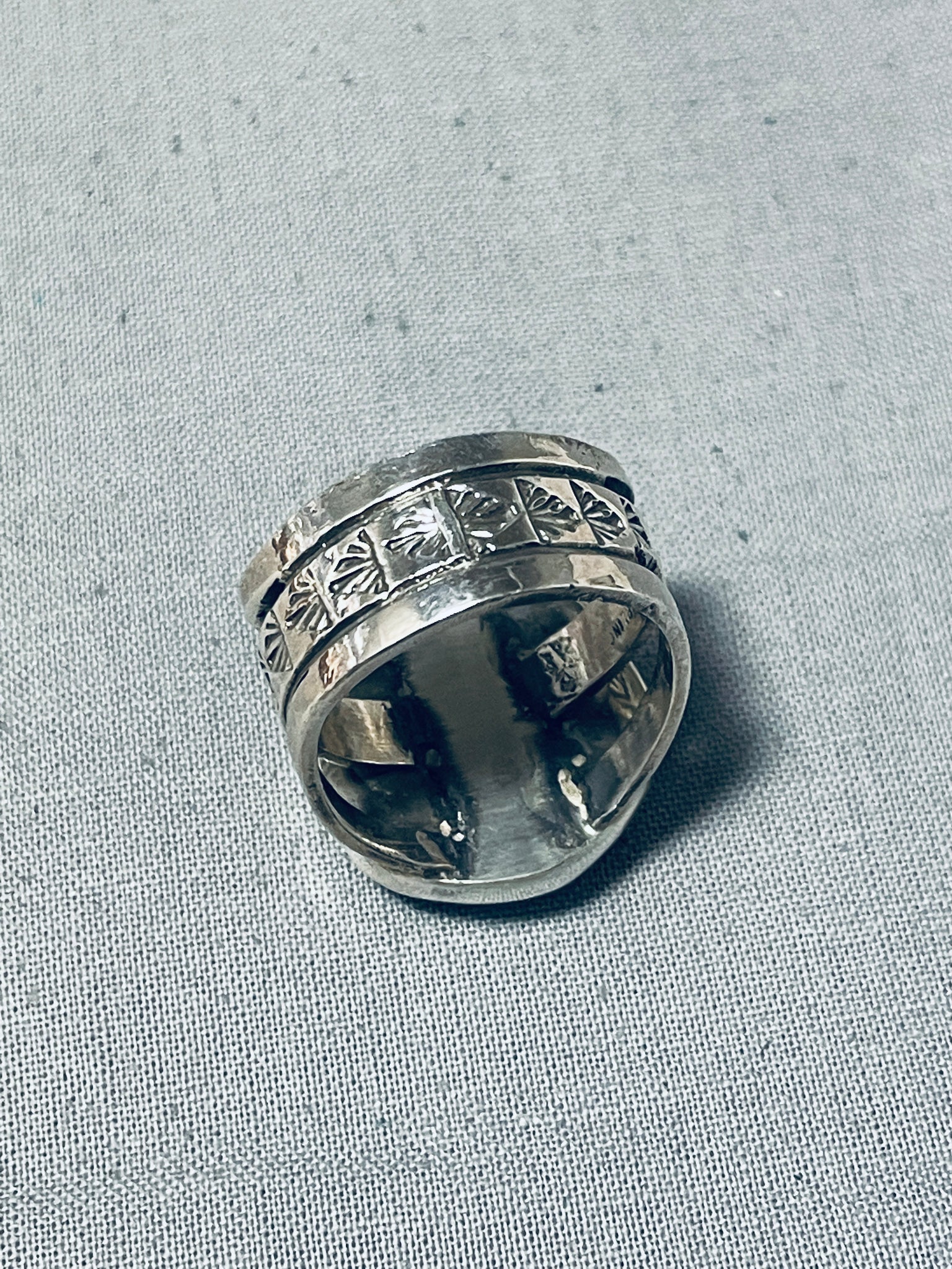 We are proud to offer this striking San Felipe silver ring having a large Royston turquoise stone and a handcarved graduated triple silver rail band with silver handstampings! Absolutely Incredible! The center stone measures around 7/8" x 3/4". Signed by San Felipe artist, Jake Francosa. The ring size is around 9. Sterling silver, marked. Sturdy 11 grams.