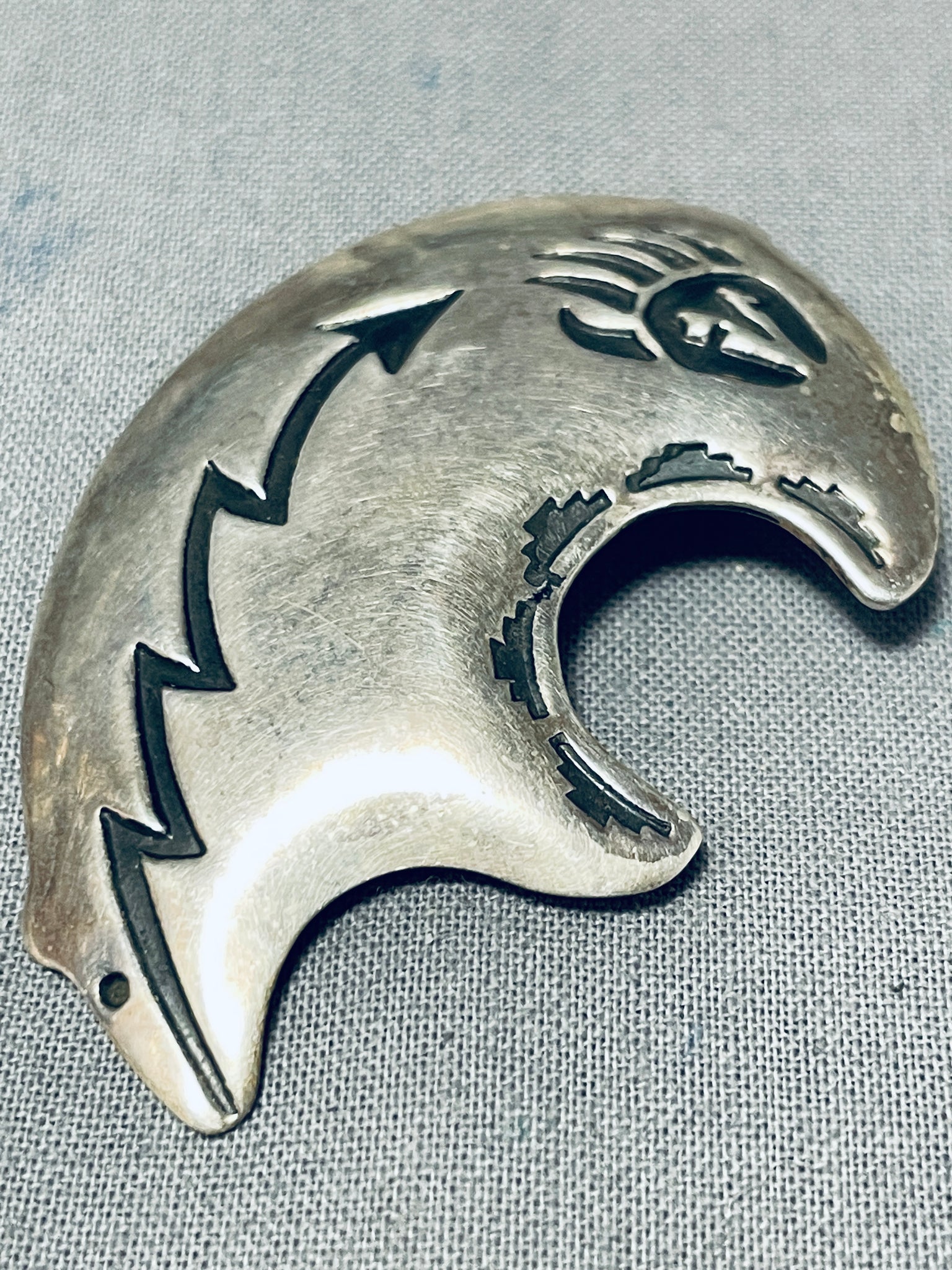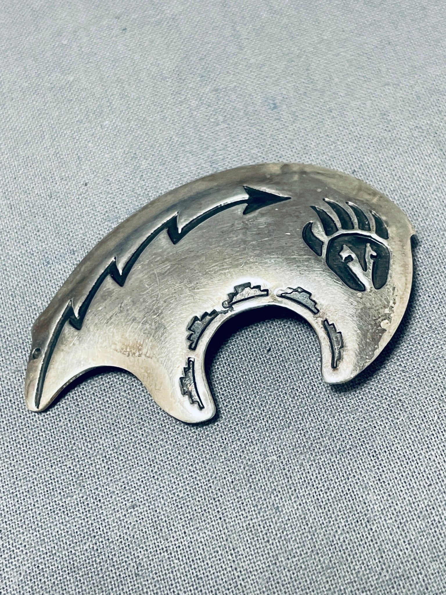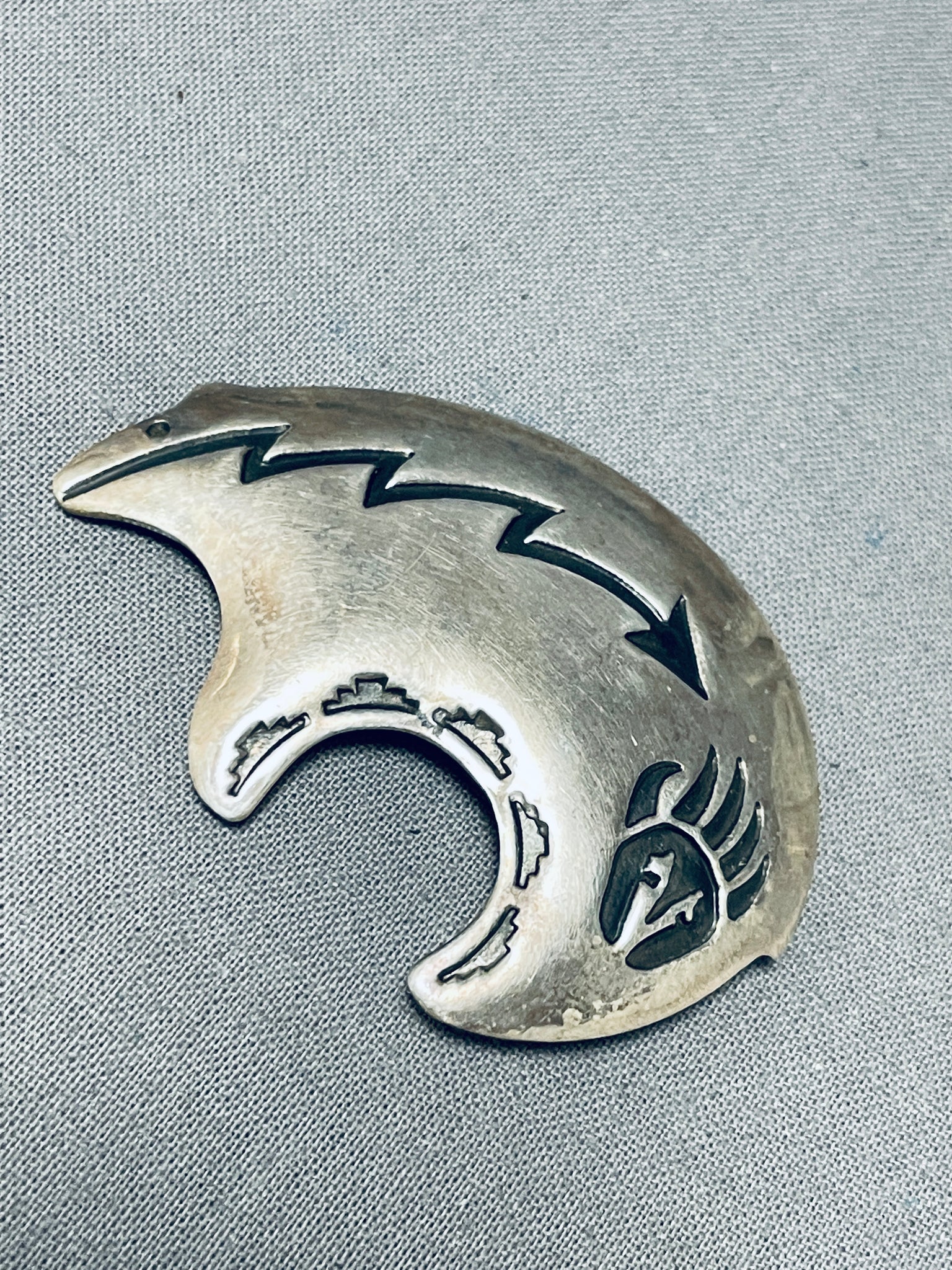 This is an impressive vintage Navajo silver pin having a handcarved silver bear with a deep handcarved silver arrow, silver bear print and silver handstampings! Simply Incredible! Sterling silver. The pin measures around 1-7/8" x 1-1/4". Sturdy 12 grams.