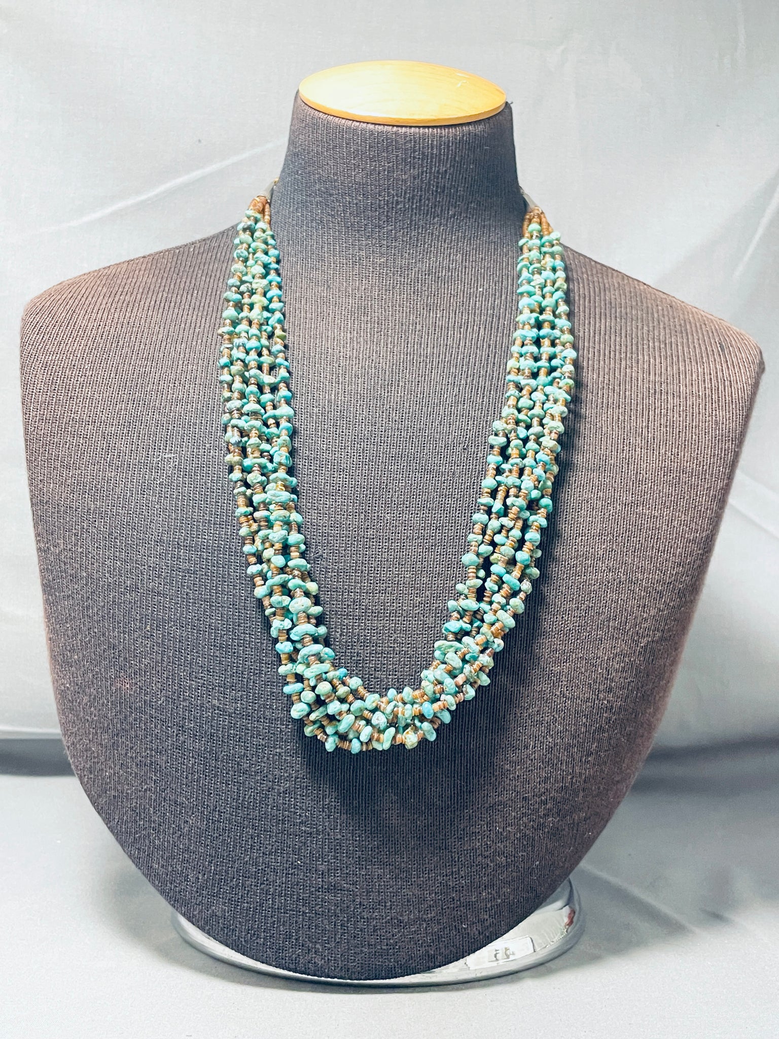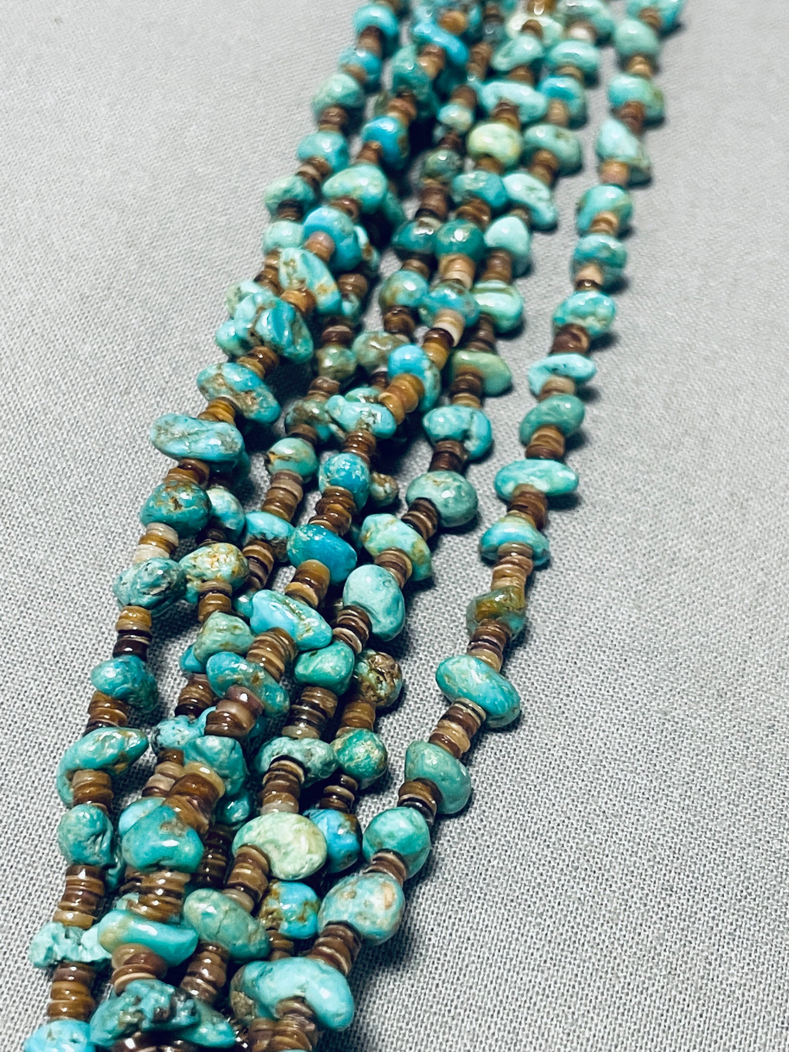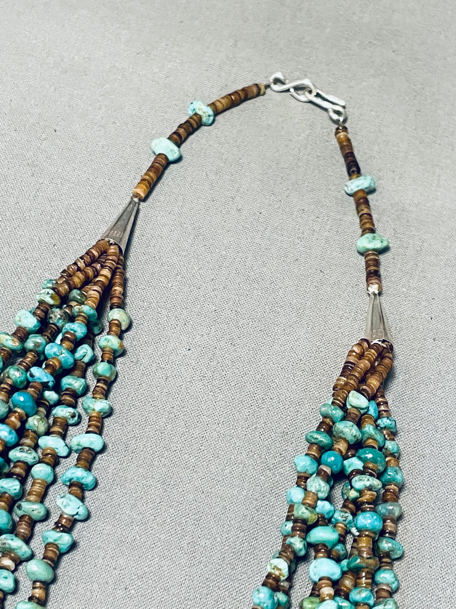 Look at the turquoise woven into the heishi, very unusual! An astounding vintage Navajo necklace. The necklace is 7 strands of mega amounts of turquoise strung with gorgeous dark heishi! The strands gather with a silver cone and then continue as one strand to the clasp. Awesome! Sterling silver. The length of the necklace measures around 24". Sturdy 74 grams.