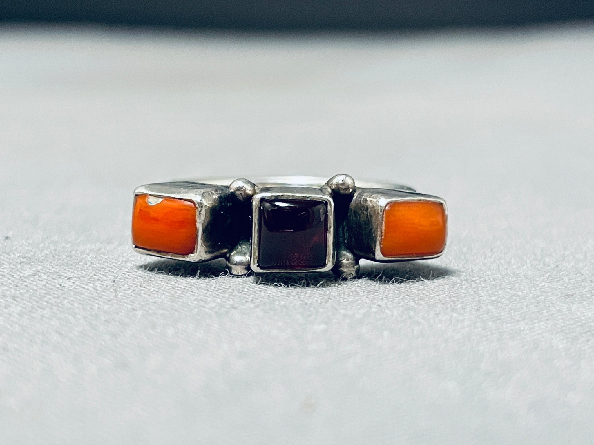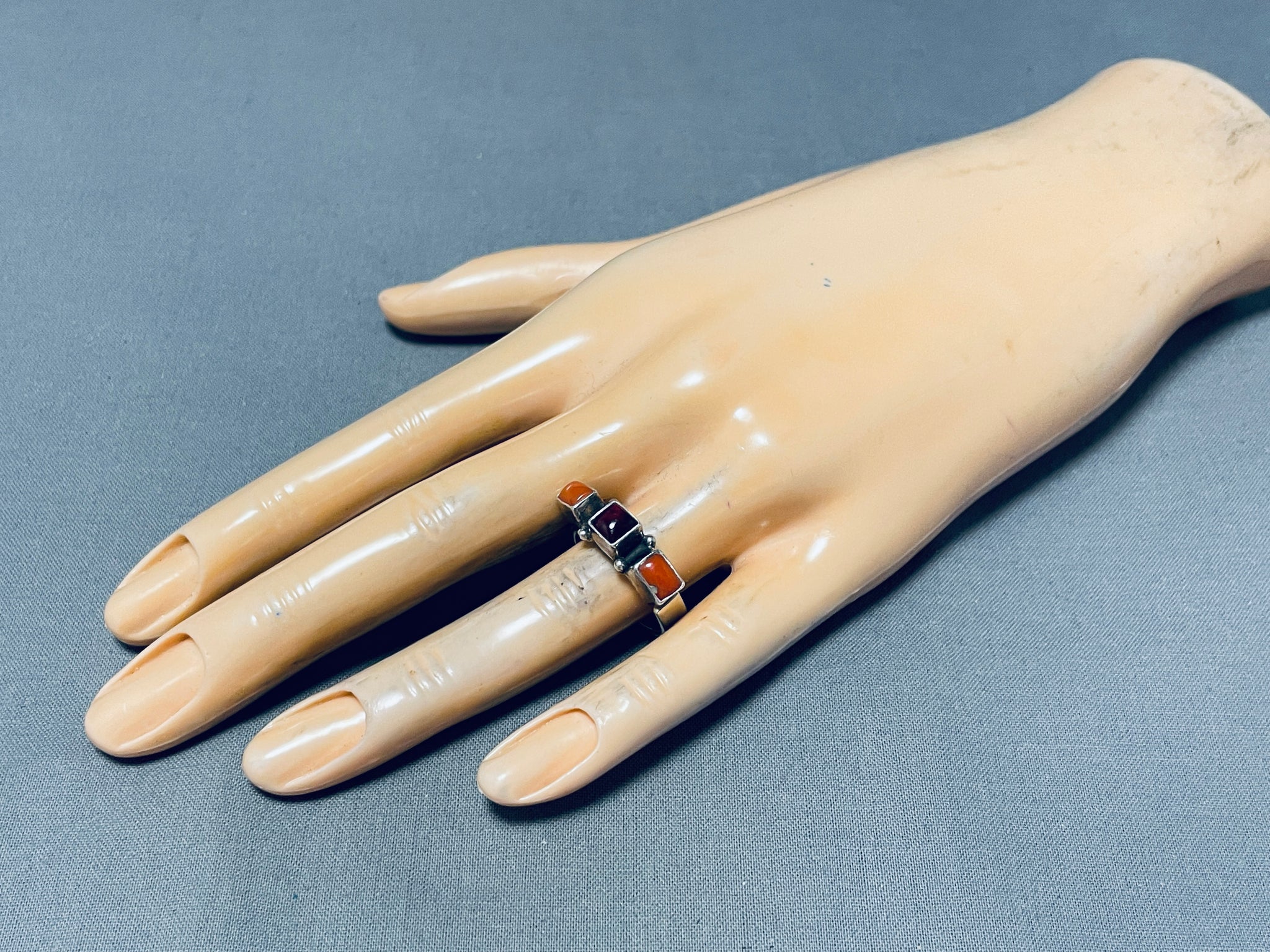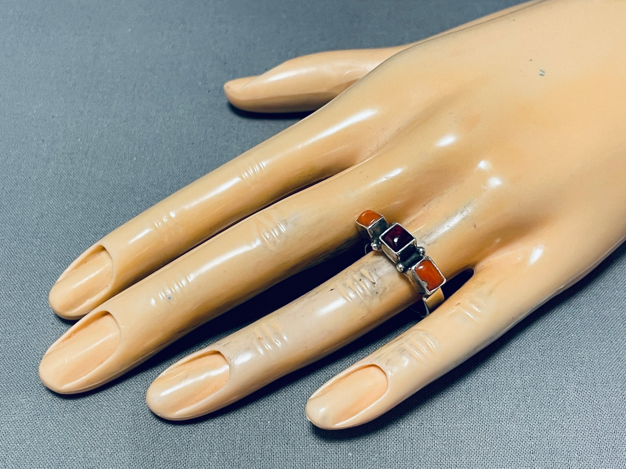 Fantastic Native American Navajo Coral & Garnet Sterling Silver Ring