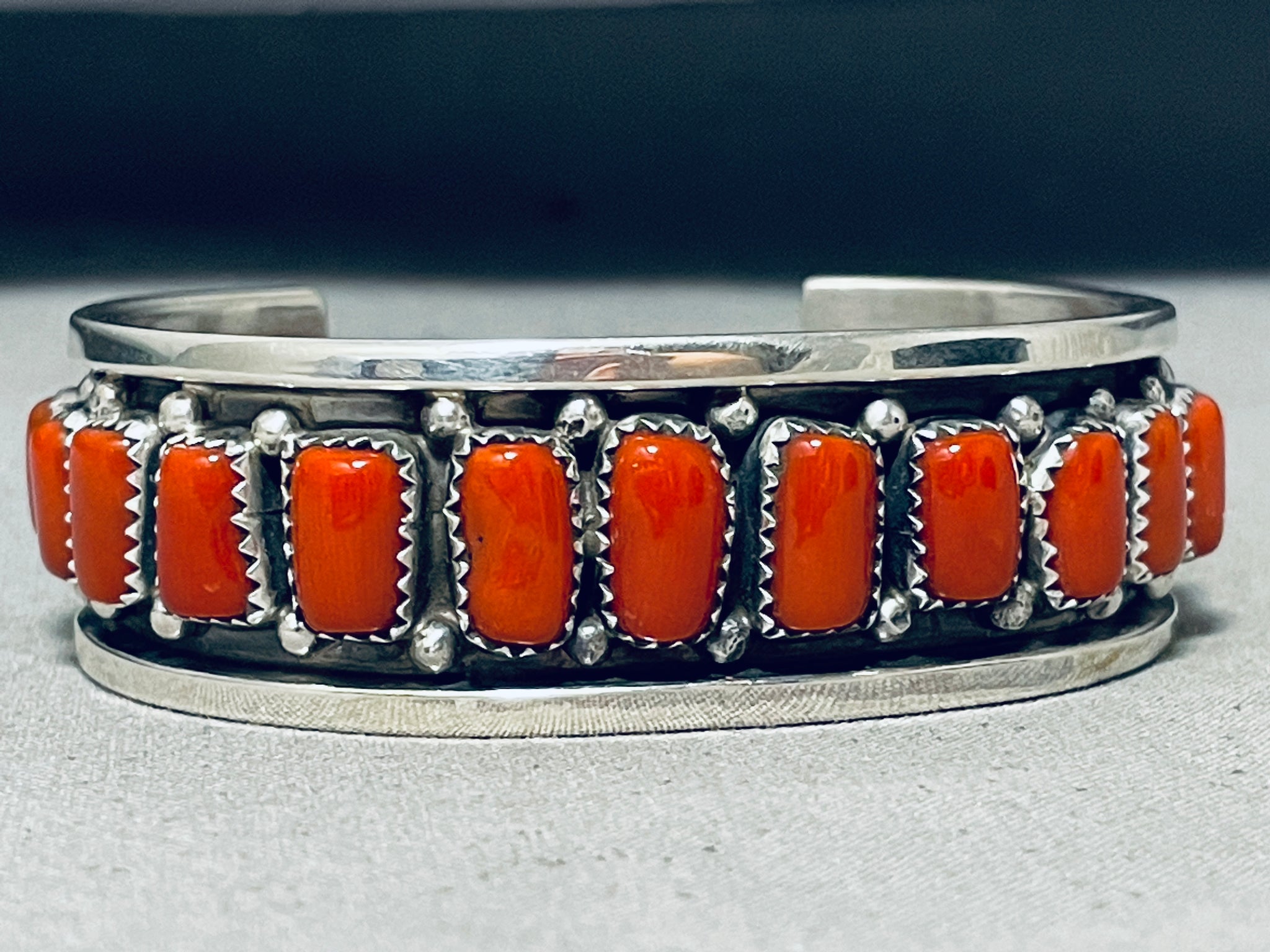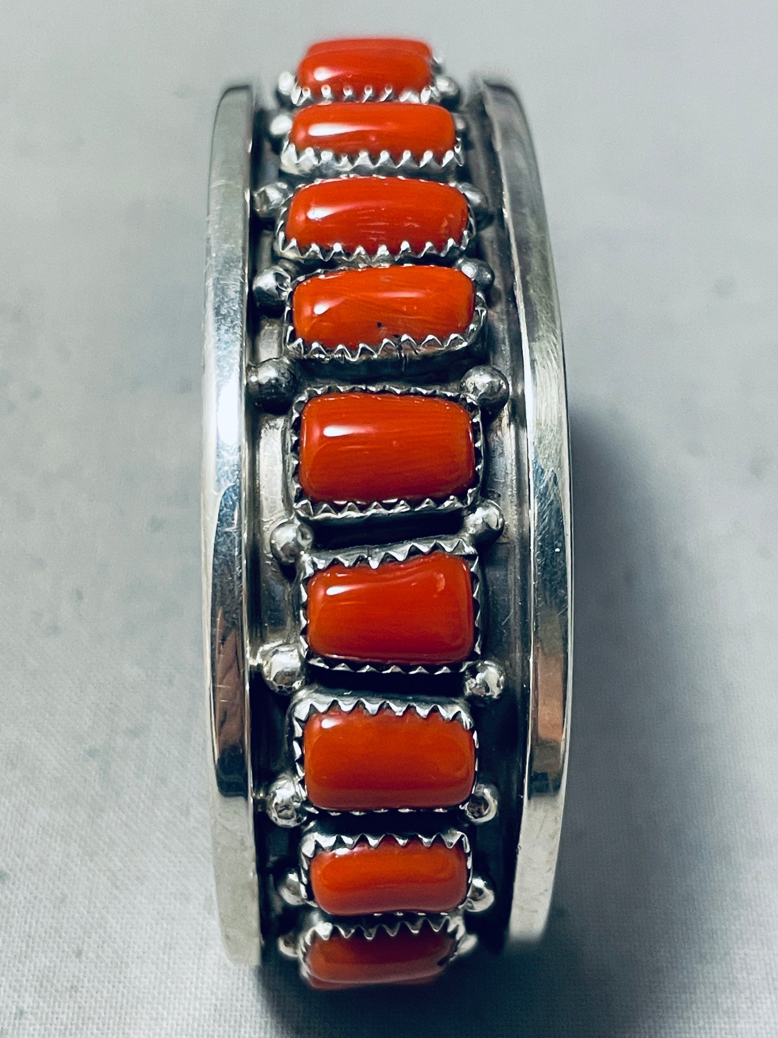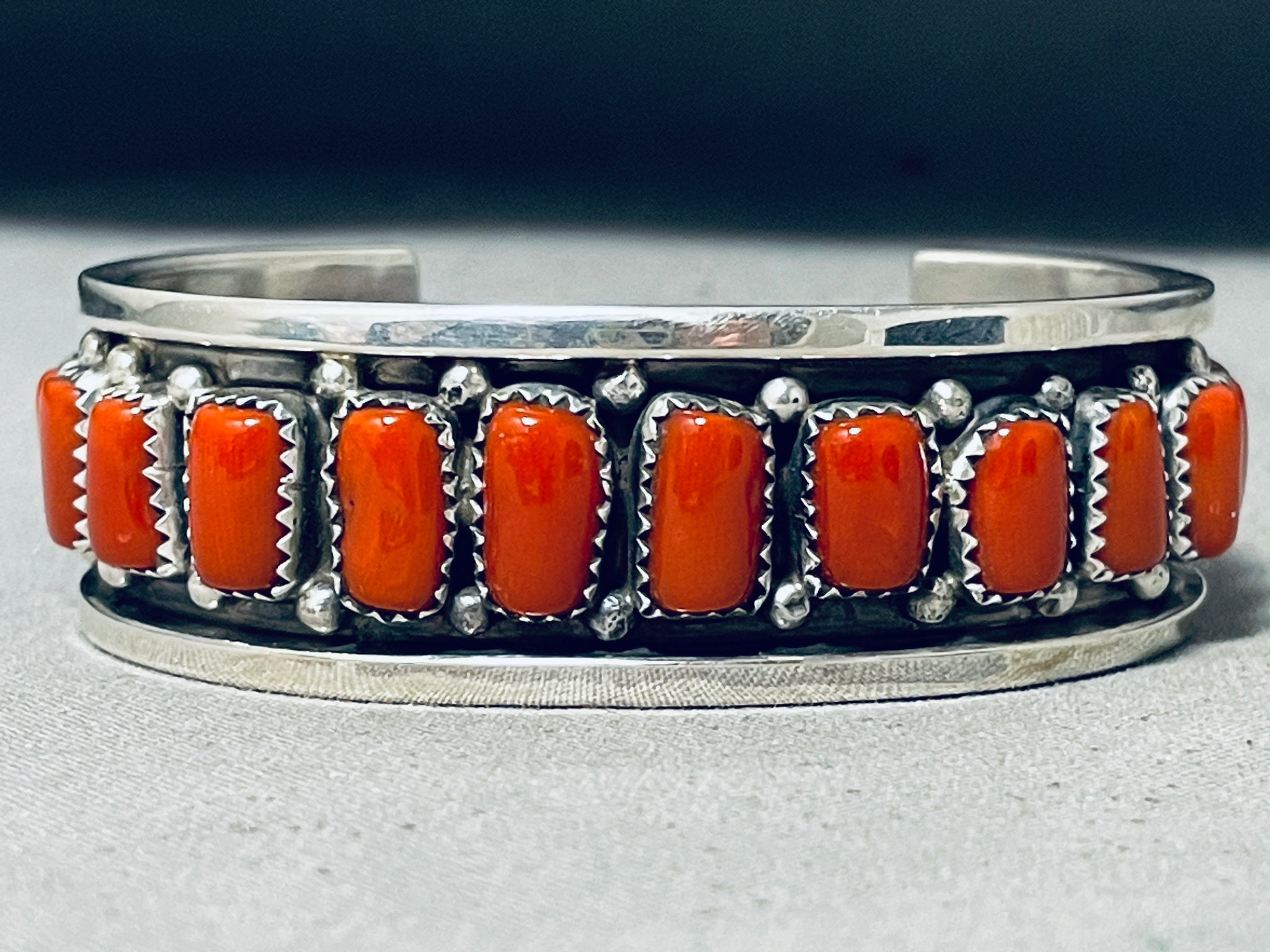 Fantastic Native American Navajo Signed 18 Coral Sterling Silver Bracelet