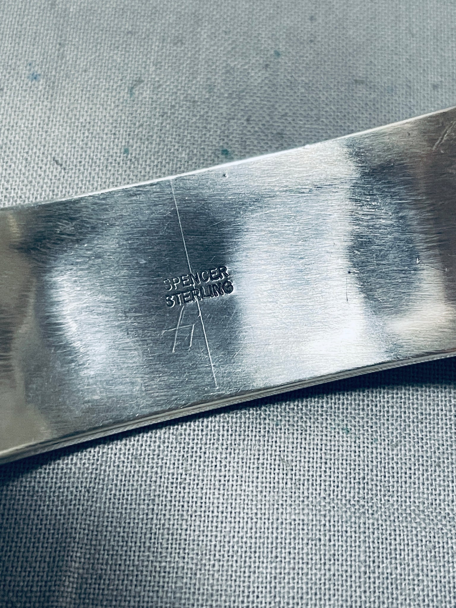 Here we have an astonishing Navajo silver bracelet having 18 corals with dual silver beads and handcarved silver borders all across the heavy, handcarved solid silver cuff! Truly Extraordinary! The stones measure around 3/8" x 1/4". The width of the bracelet measures around 3/4". Signed by Navajo artist, Spencer. Sterling silver, marked. The inside end to end measures around 5-1/4" with an additional 1-1/4" gap. Sturdy 48 grams.