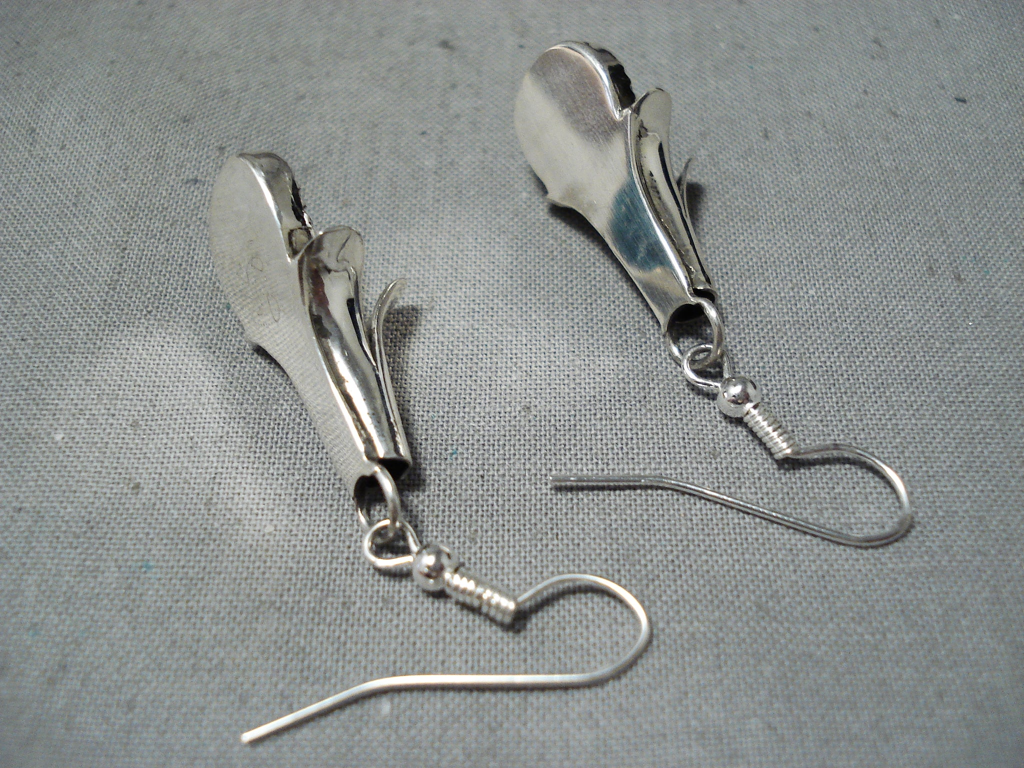 A remarkable Navajo silver pair of earrings. This is a pair of beautiful dangling blossoms that each have a superb turquoise stone bursting forth! And these pierced wire earrings are flat across the back, really adding a fresh dimension to them! Sterling silver. Each earring measures 1-7/8" long and 1/2" wide. The earrings weigh around 6 grams.