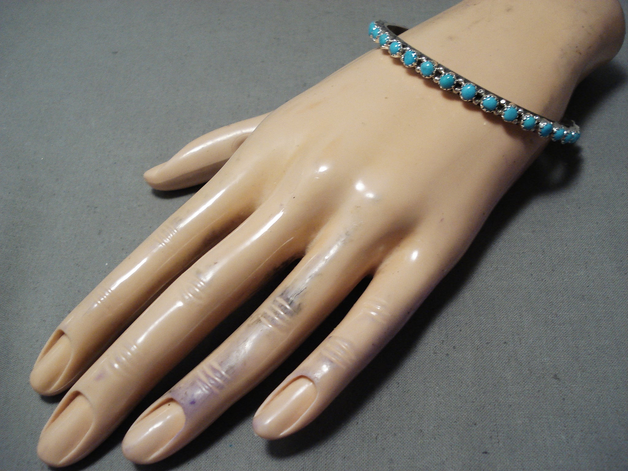 An exquisite vintage Navajo silver bangle having many Sleeping Beauty turquoise rounds with dual silver beads all around the solid silver bracelet! Simply Stunning! The stones measure around 1/8" x 1/8". The width of the bracelet measures around 1/4". Signed by Navajo artist, G. Parker. Sterling silver, marked. The inside end to end measures around 7-1/2". Sturdy 21 grams.