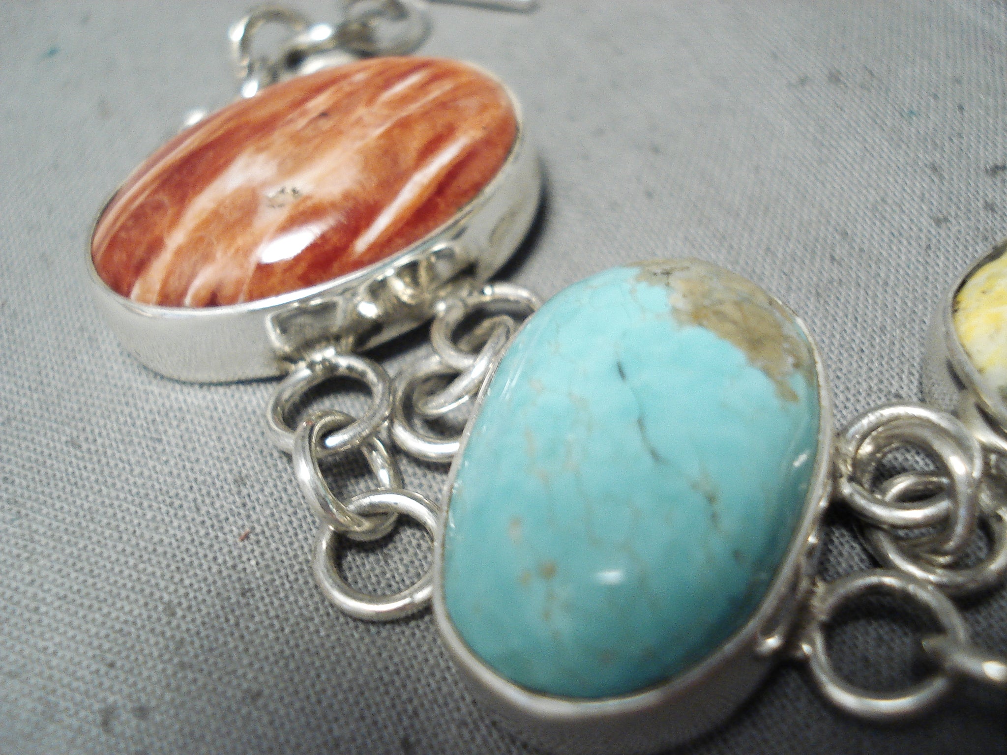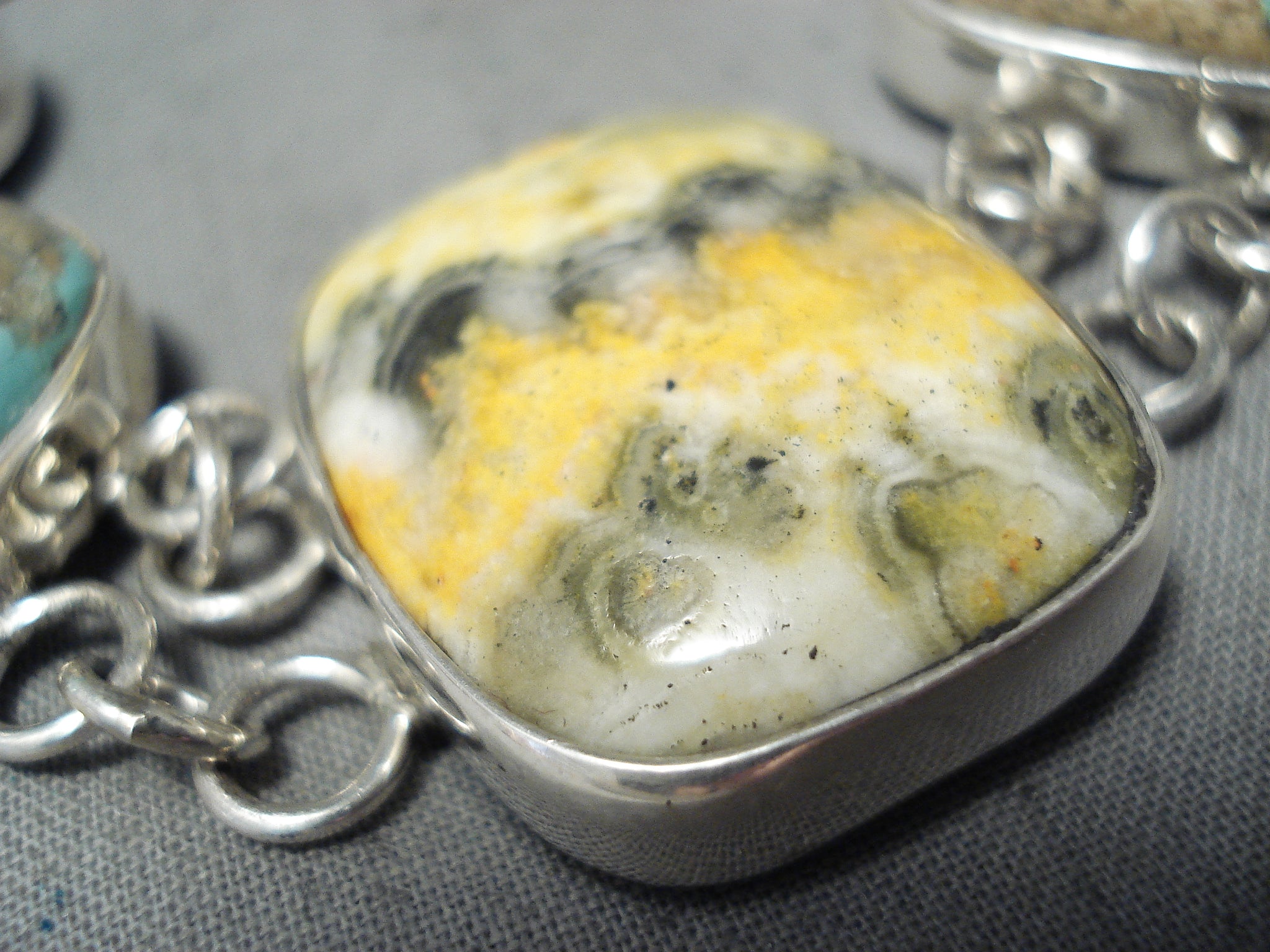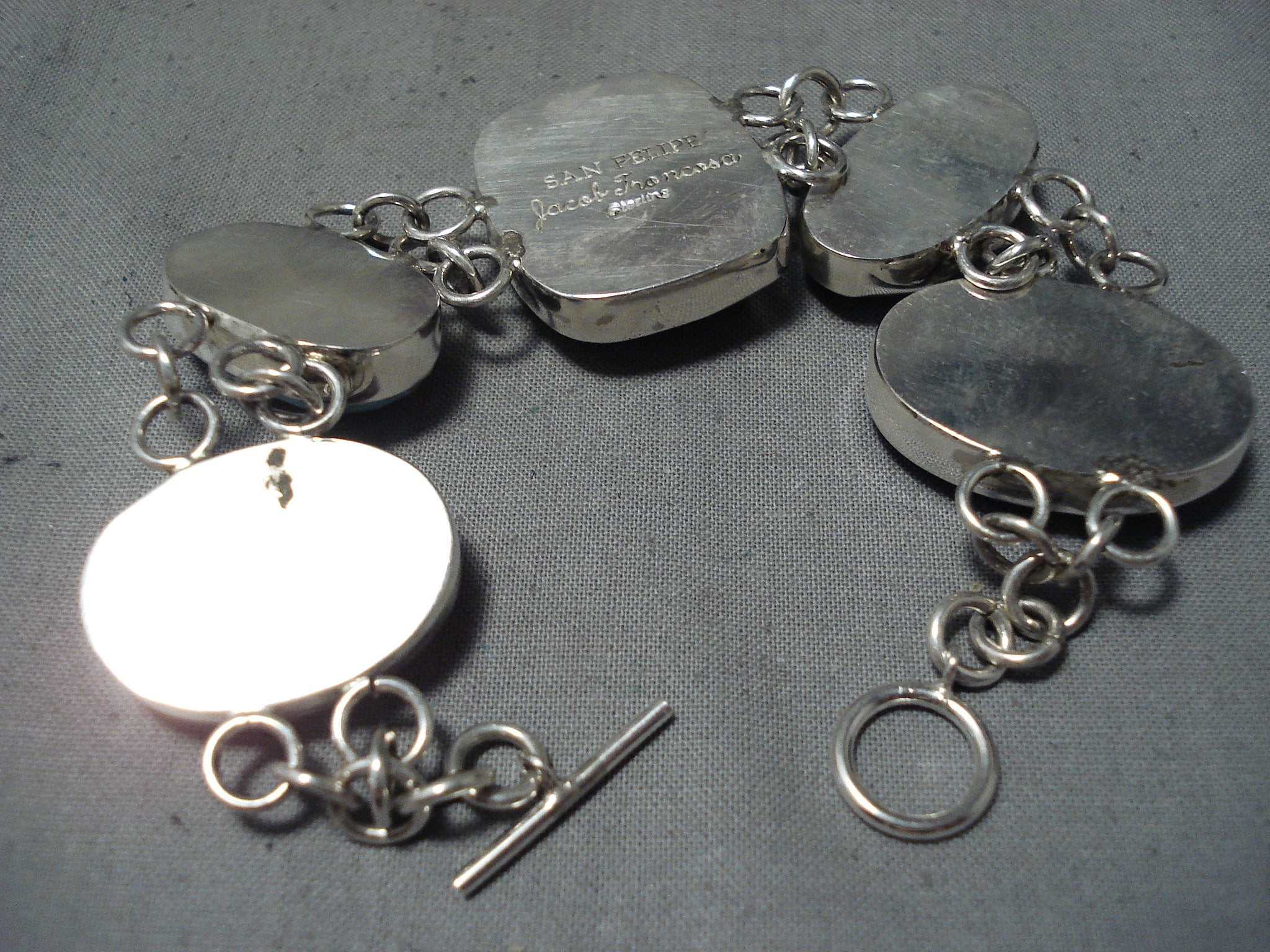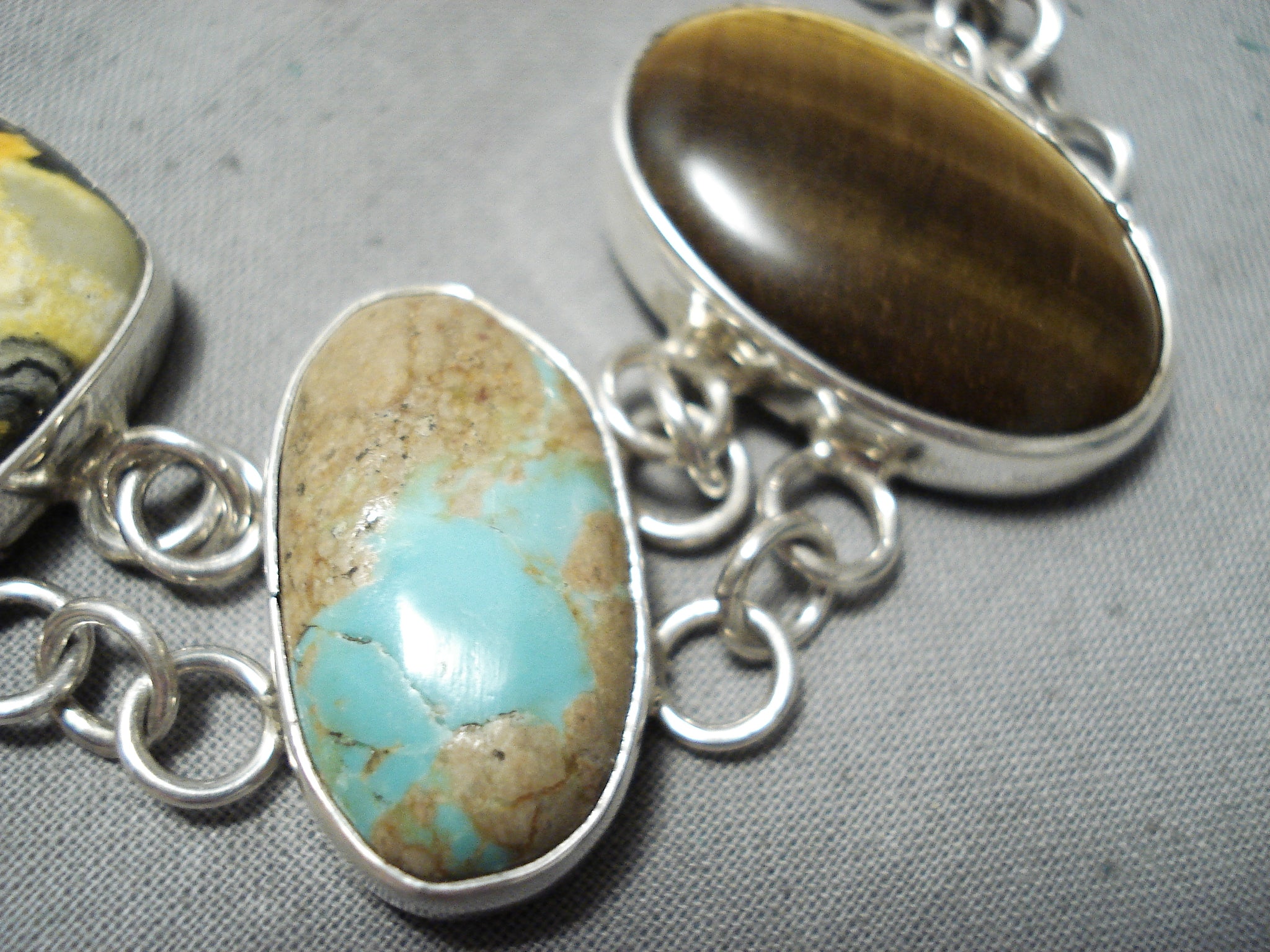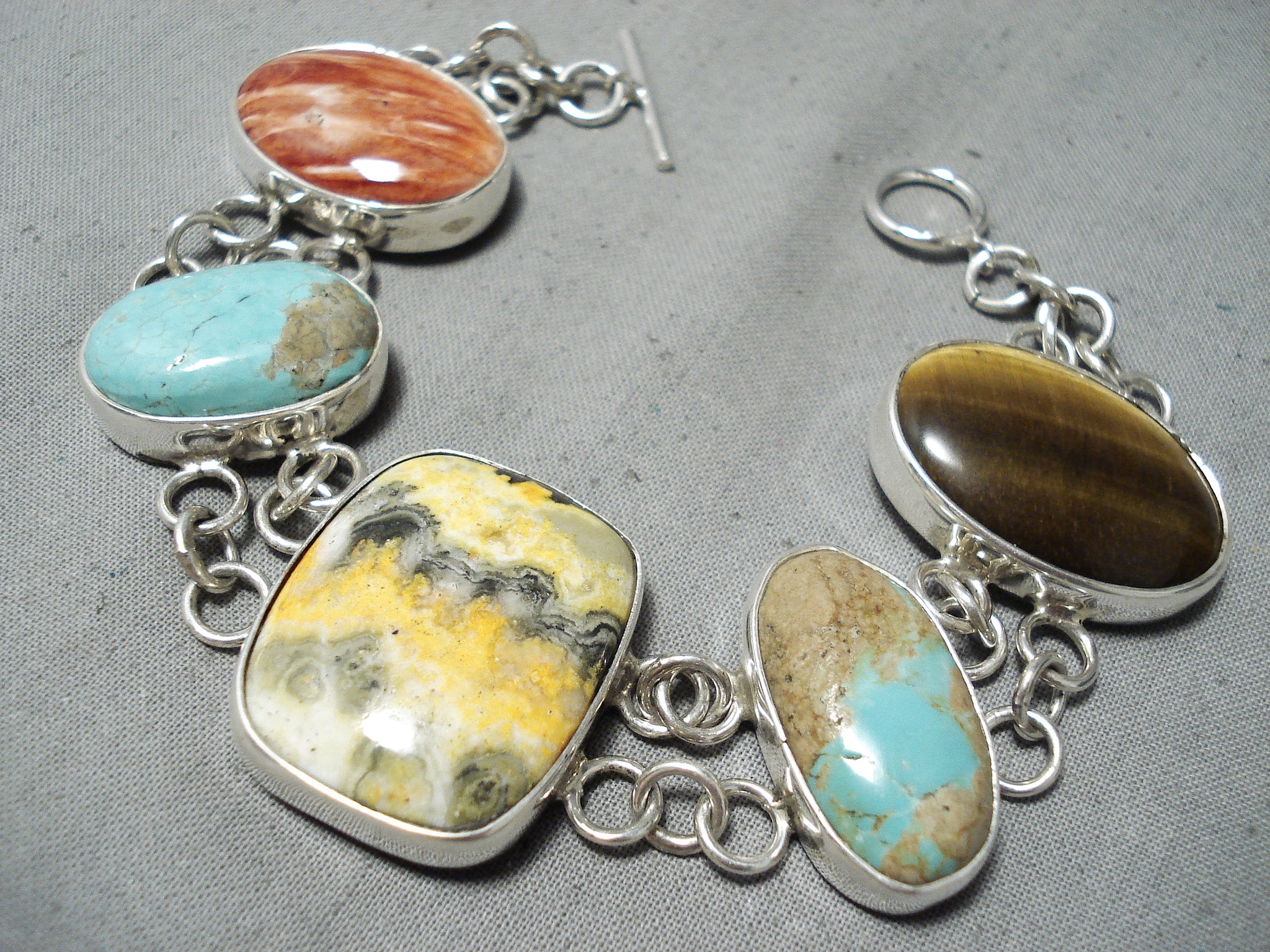 Here we have an astonishing San Felipe silver bracelet. Double silver loops link these 5 independent and colorful huge stones that include Bumble Bee jasper in the middle, with turquoise, tigers eye and spiny oyster at the sides! It’s about 8-1/4” around. Awesome! The largest stone measures around 1-1/8" x 7/8". The width of the bracelet measures around 1-1/8". San Felipe artist Jake Froncosa. Sterling silver, marked. Sturdy 48 grams.