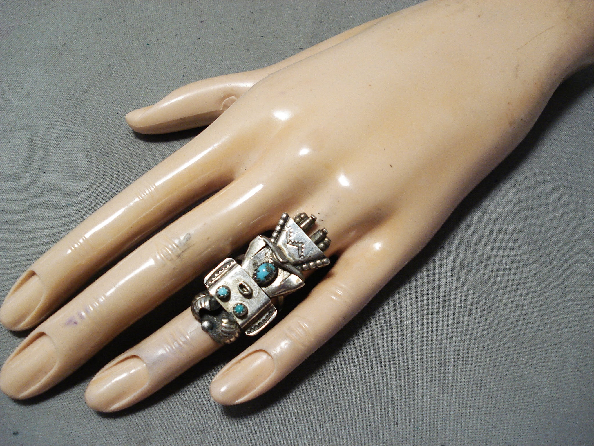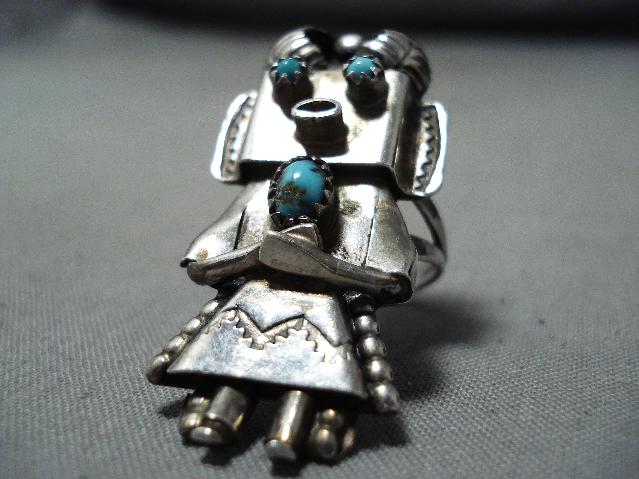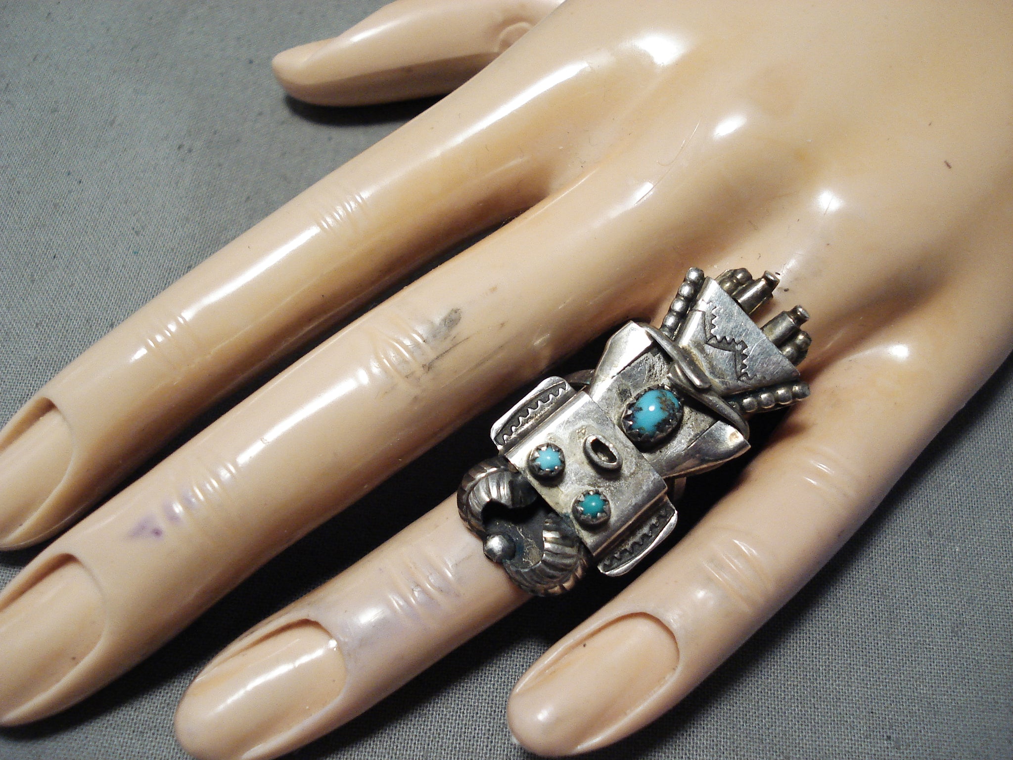 Fascinating Vintage Native American Navajo Turquoise Sterling Silver Kachina Ring Old